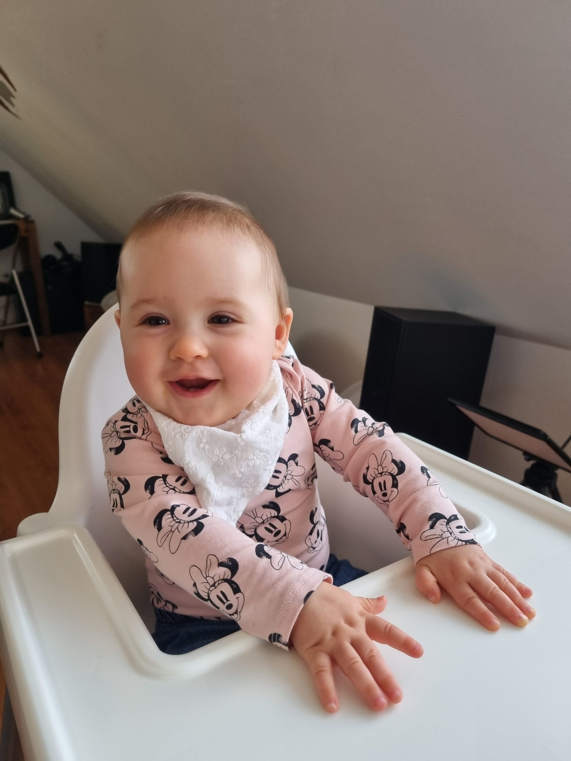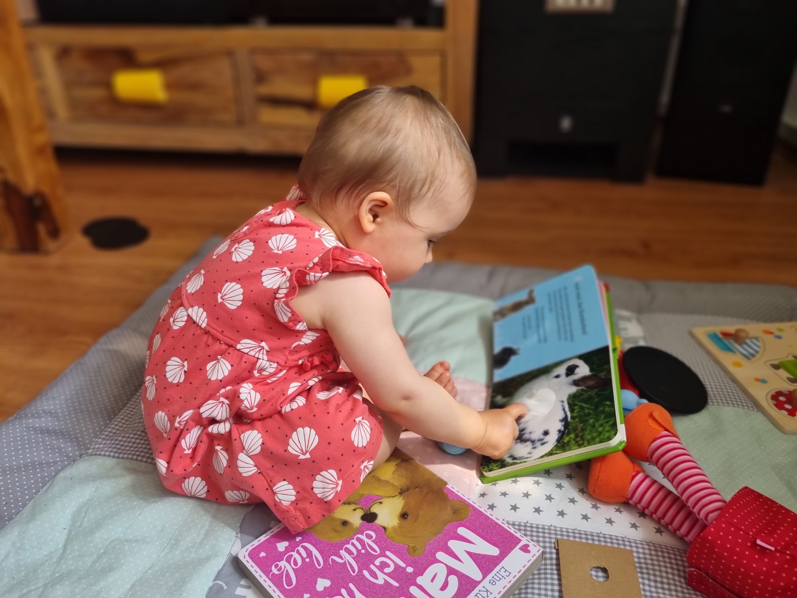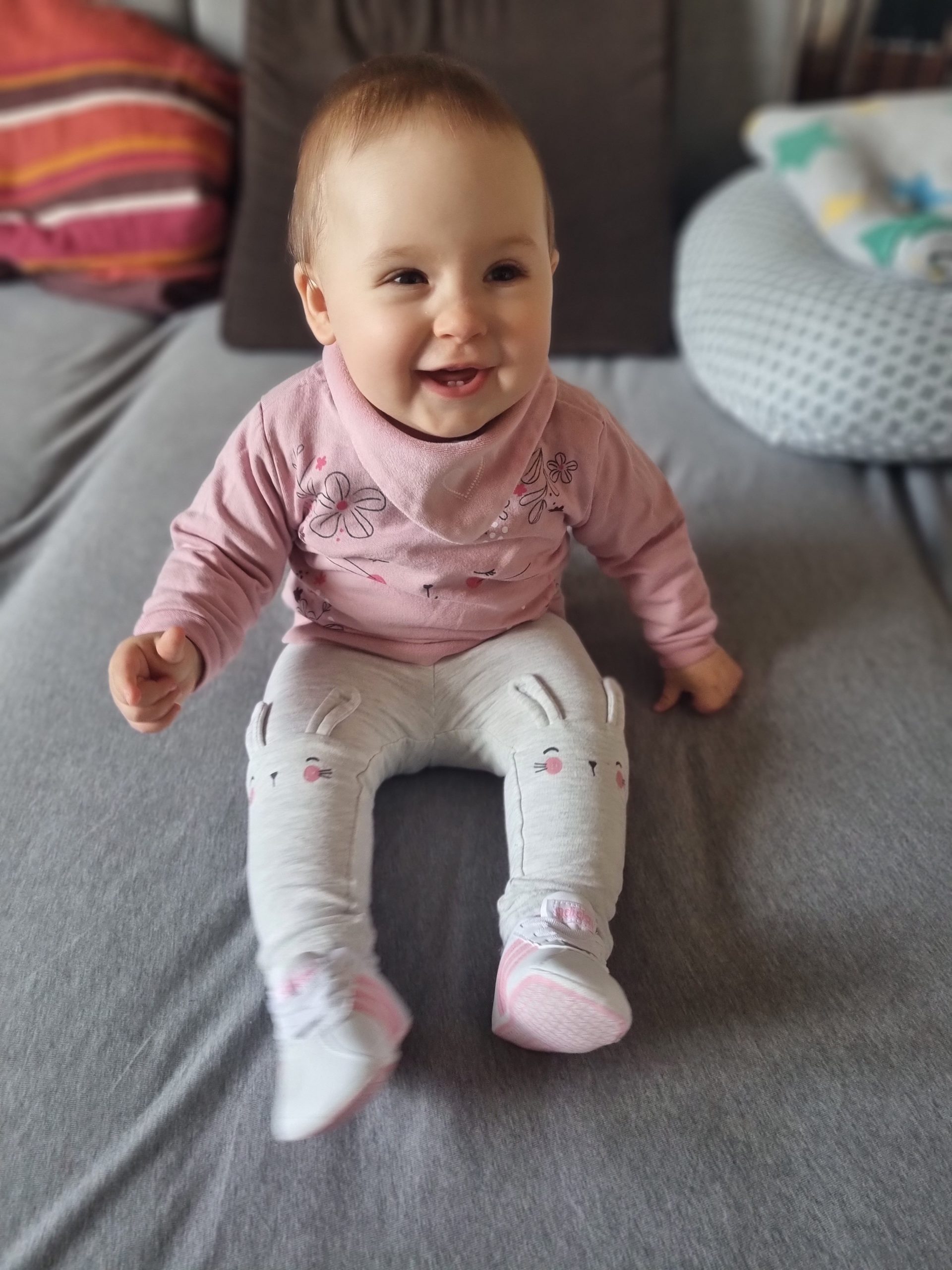 Diesen Monat habe ich das ordentliche Krabbeln gelernt und fleißig meinen Pinzettengriff geübt. Ich verstehe immer mehr Worte und kann mich auch schon ein bisschen mitteilen.