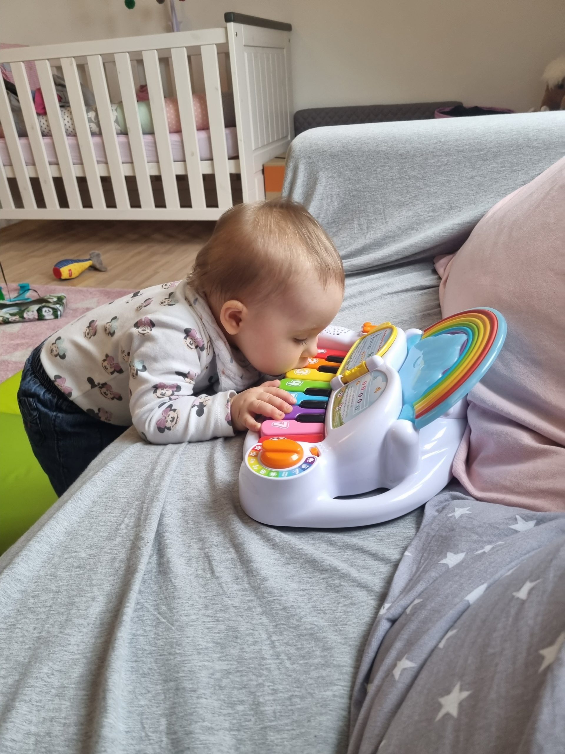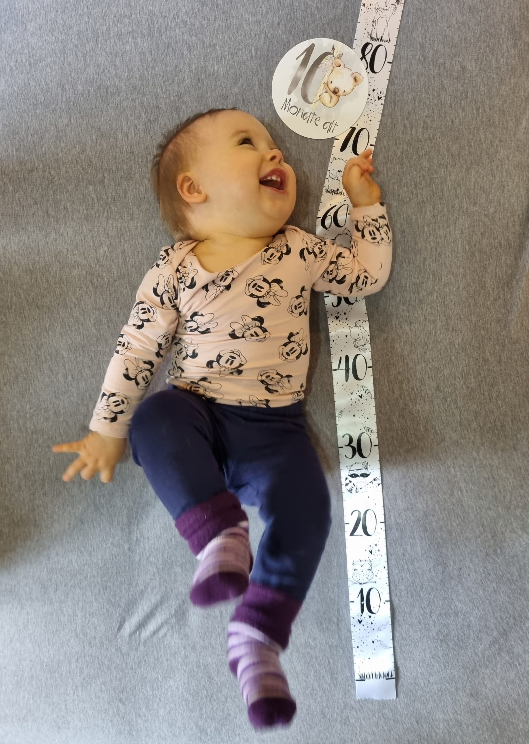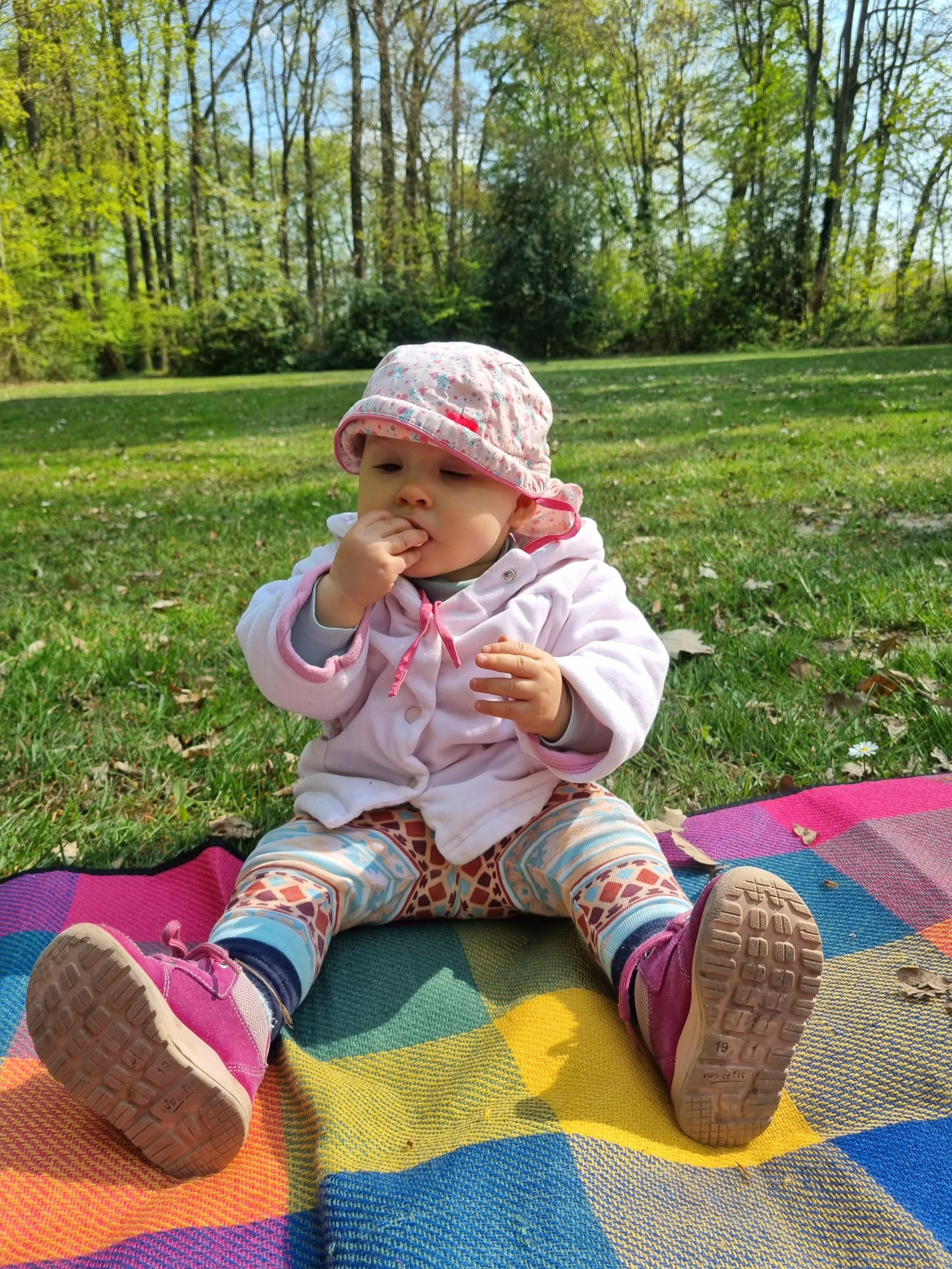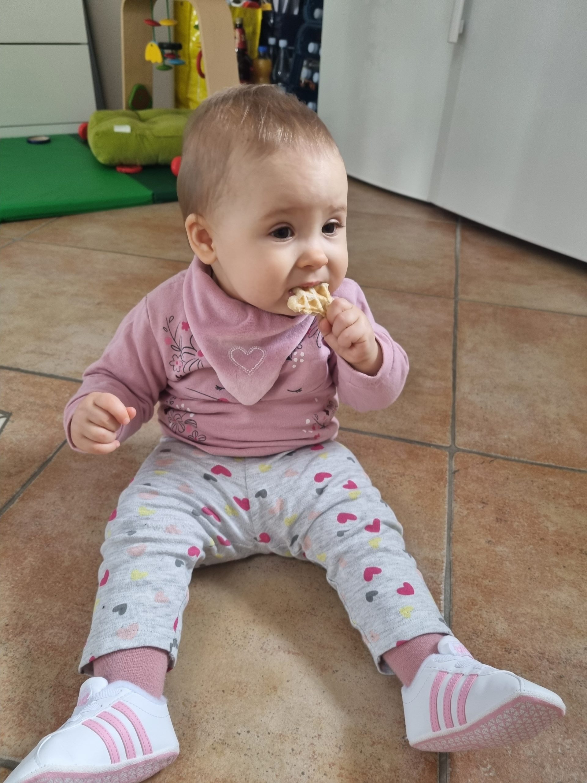 Diesen Monat habe ich das ordentliche Krabbeln gelernt und fleißig meinen Pinzettengriff geübt. Ich verstehe immer mehr Worte und kann mich auch schon ein bisschen mitteilen.