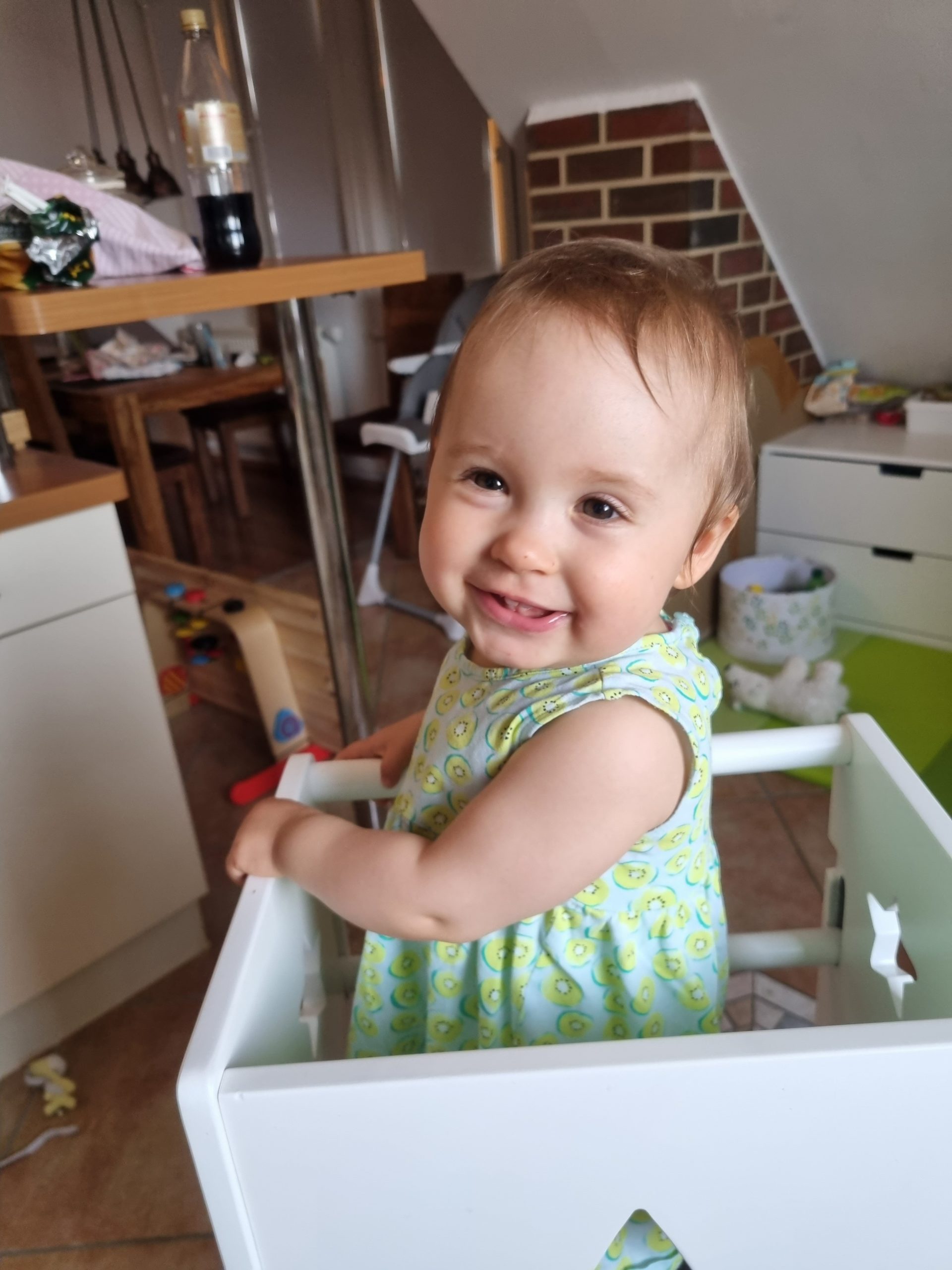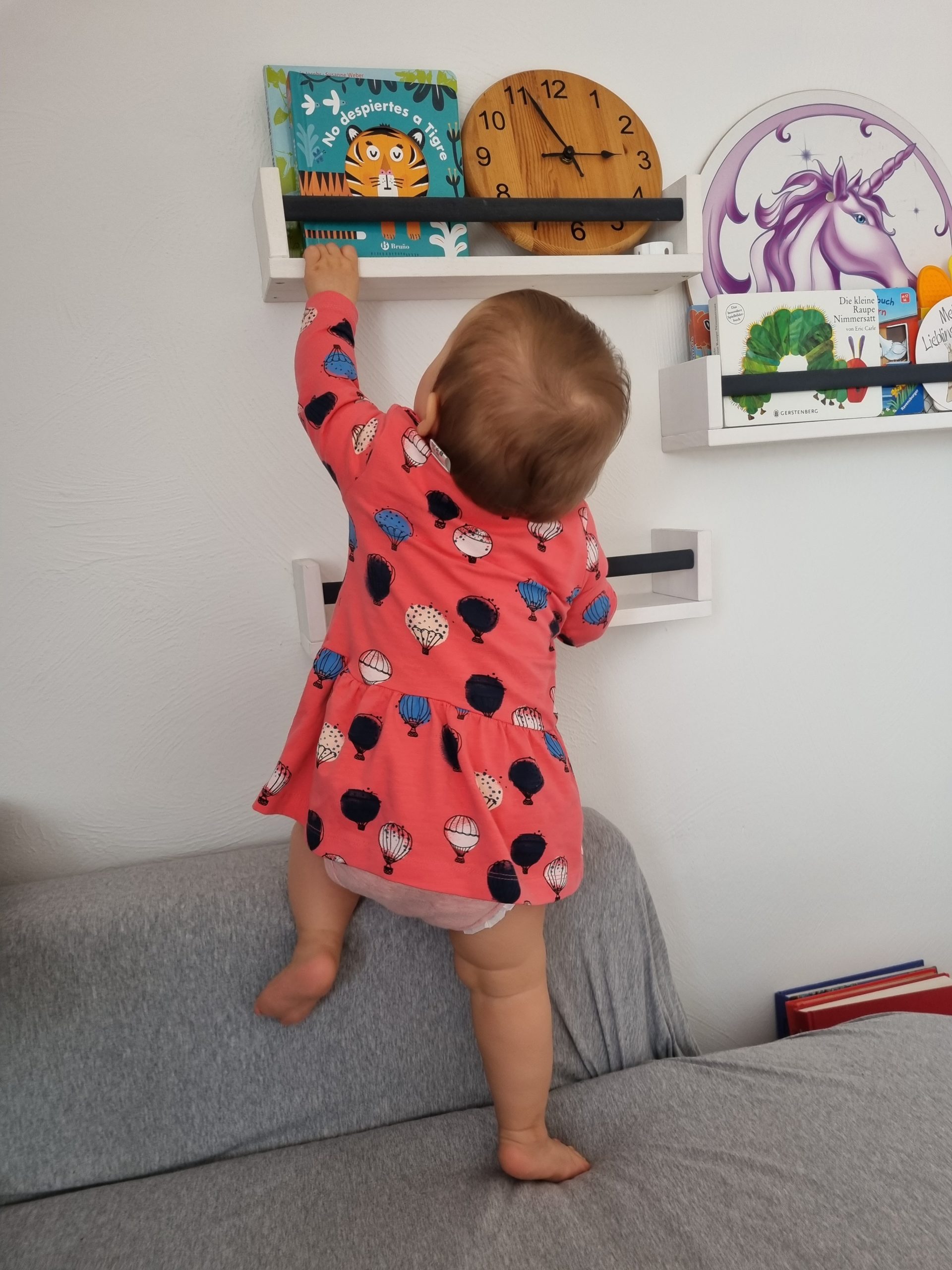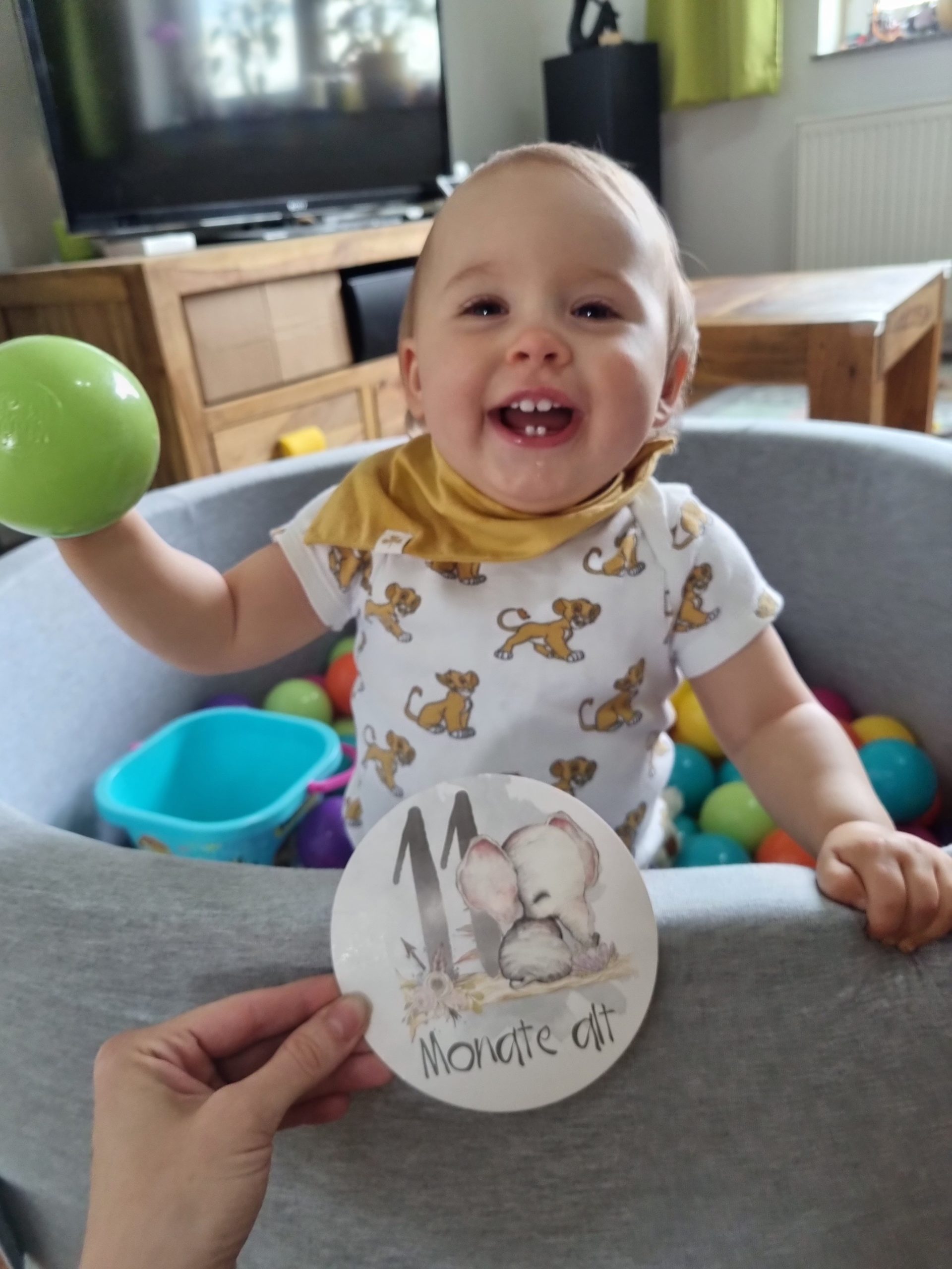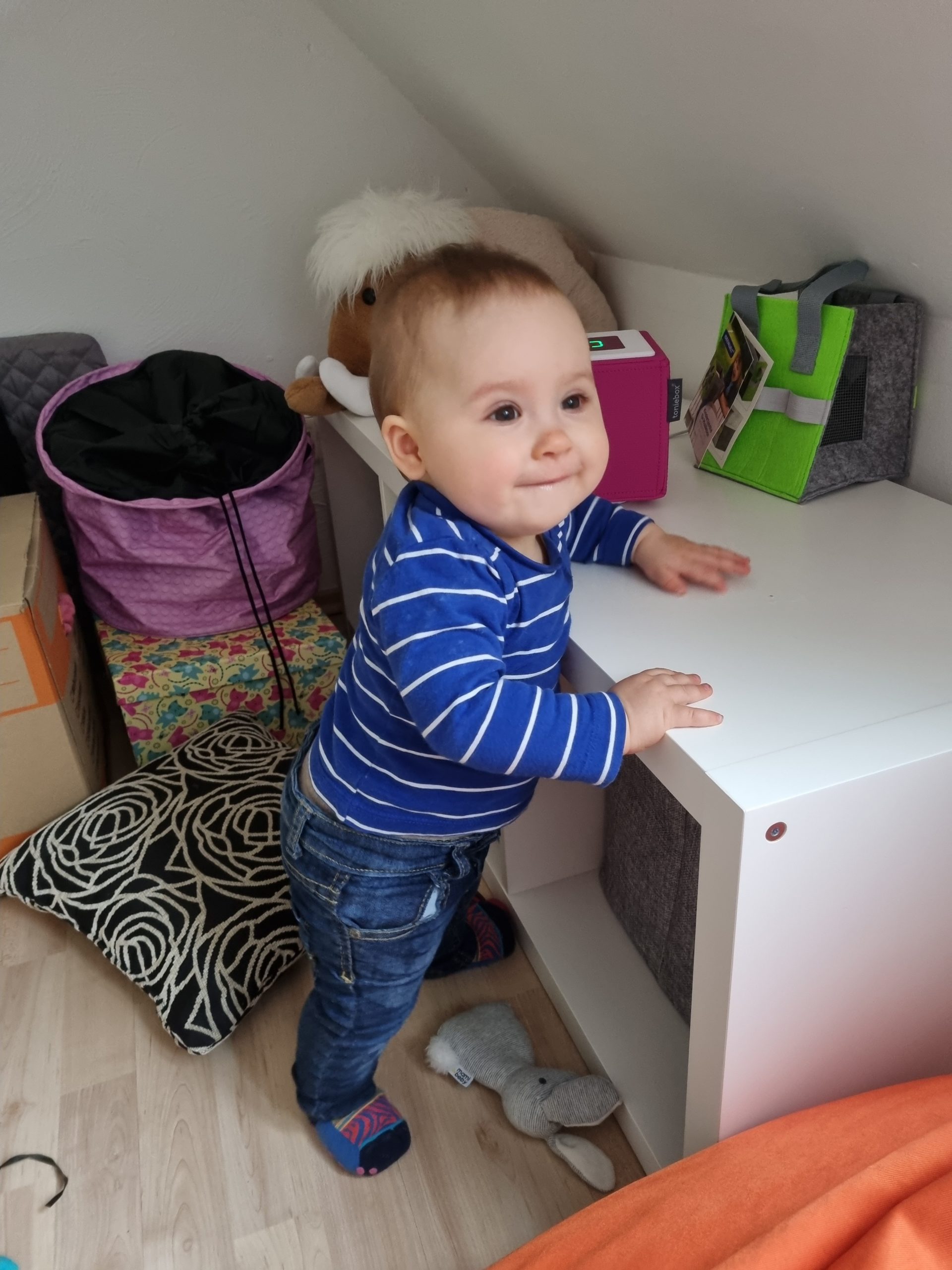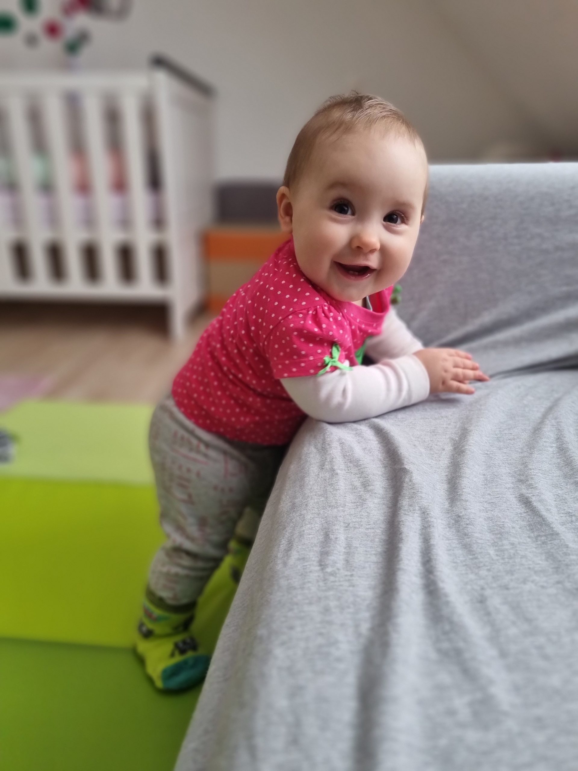 Im letzten Monat habe ich einen riesigen Entwicklungssprung gemacht. Ich krabble und laufe (an der Hand) nun überall hin und entdecke immer neue Ecken, – auch die, die Mama und Papa mir lieber nicht zeigen wollten. Mein Lieblingsspiel ist Fangen spielen, da kann ich mich so richtig bei austoben. Tatsächlich habe ich dadurch auch schon einiges von meinem Babyspeck verloren.