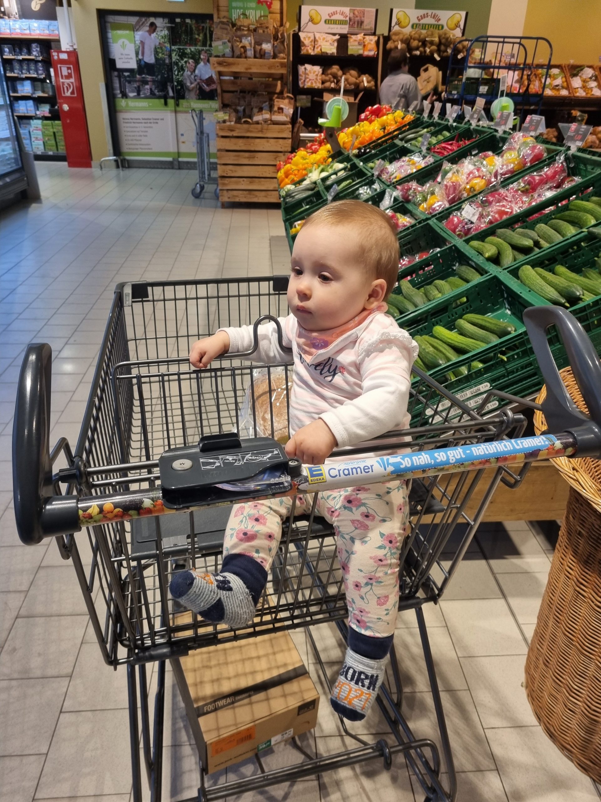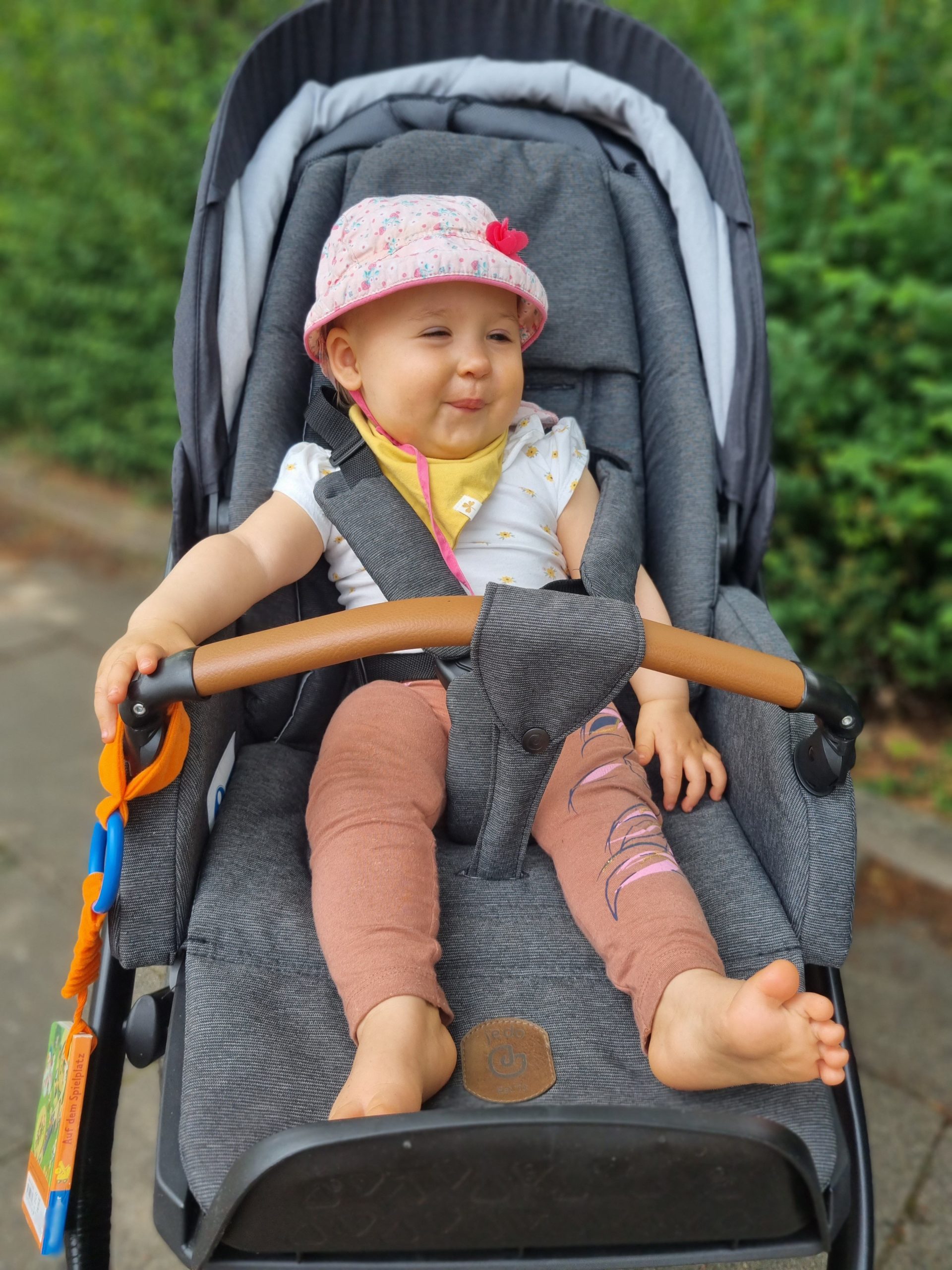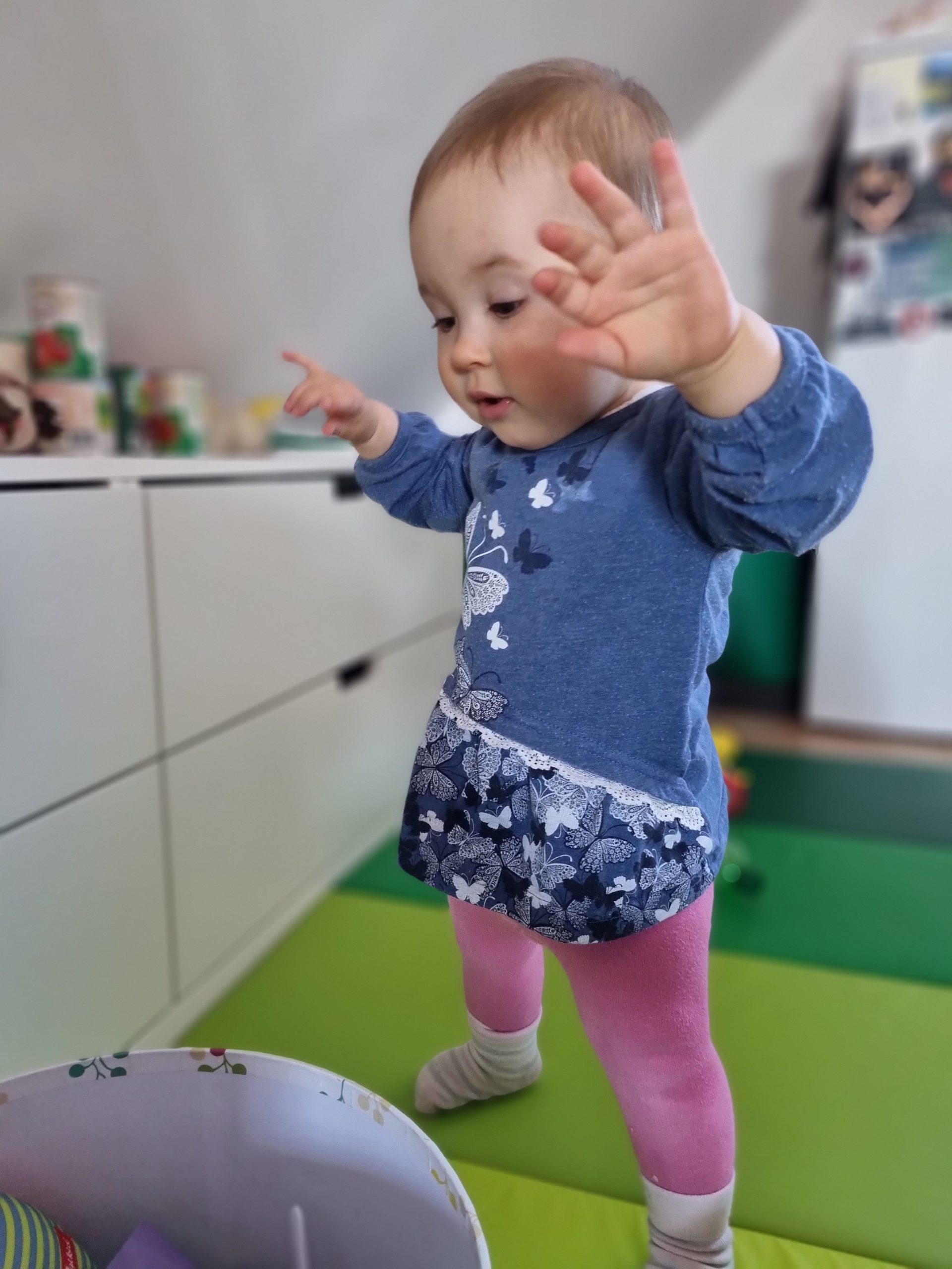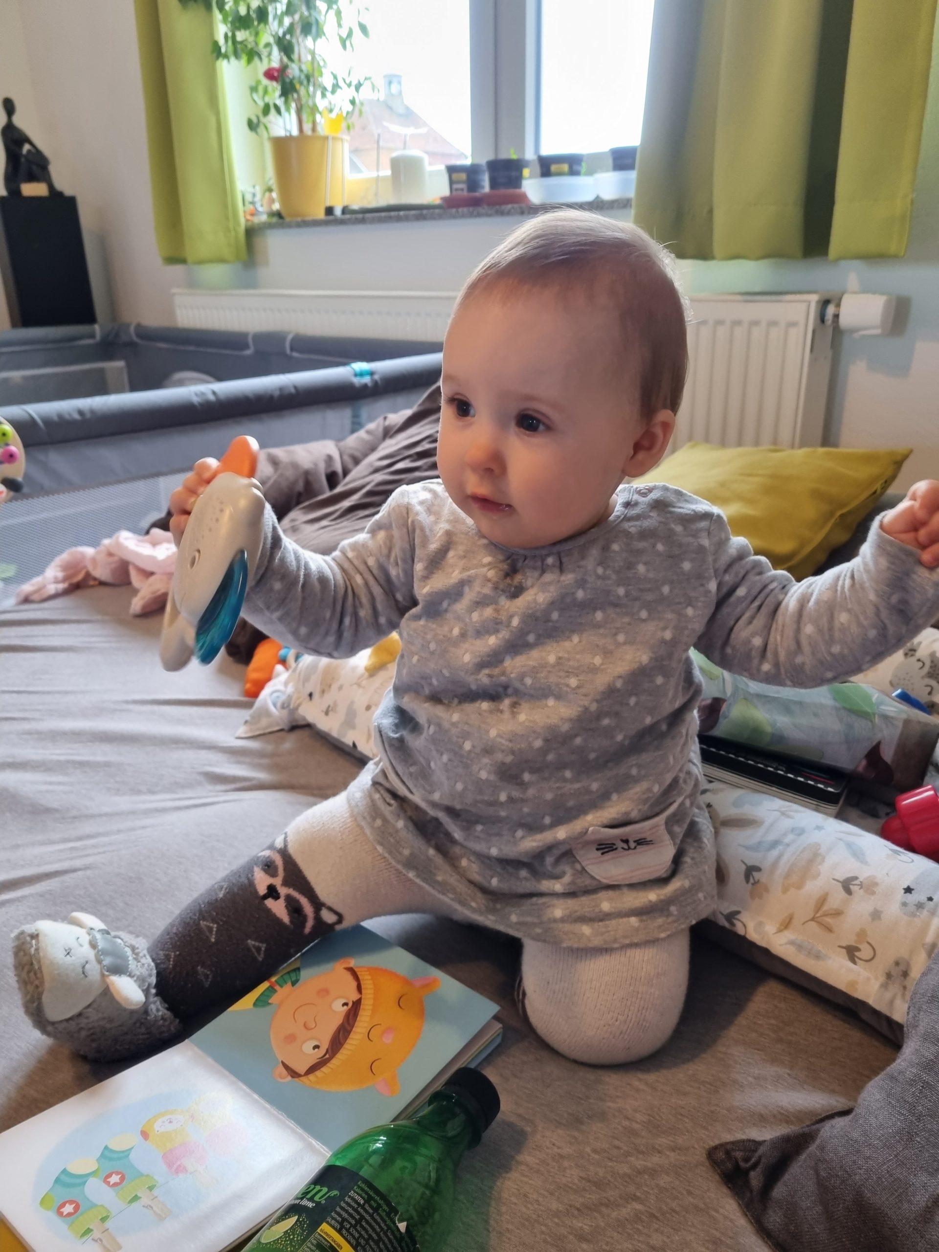 Meine neusten Fähigkeiten sind das Winken und das Zeigen auf Dinge, die ich interessant finde. Gerne gefolgt von einem „da-da-da-da-da“. Versteht sich von selbst, dass ich gerade ALLES interessant finde. Ich verstehe auch schon erste Wörter und rufe gerne nach meiner Mama wenn mir irgendetwas zuviel wird.