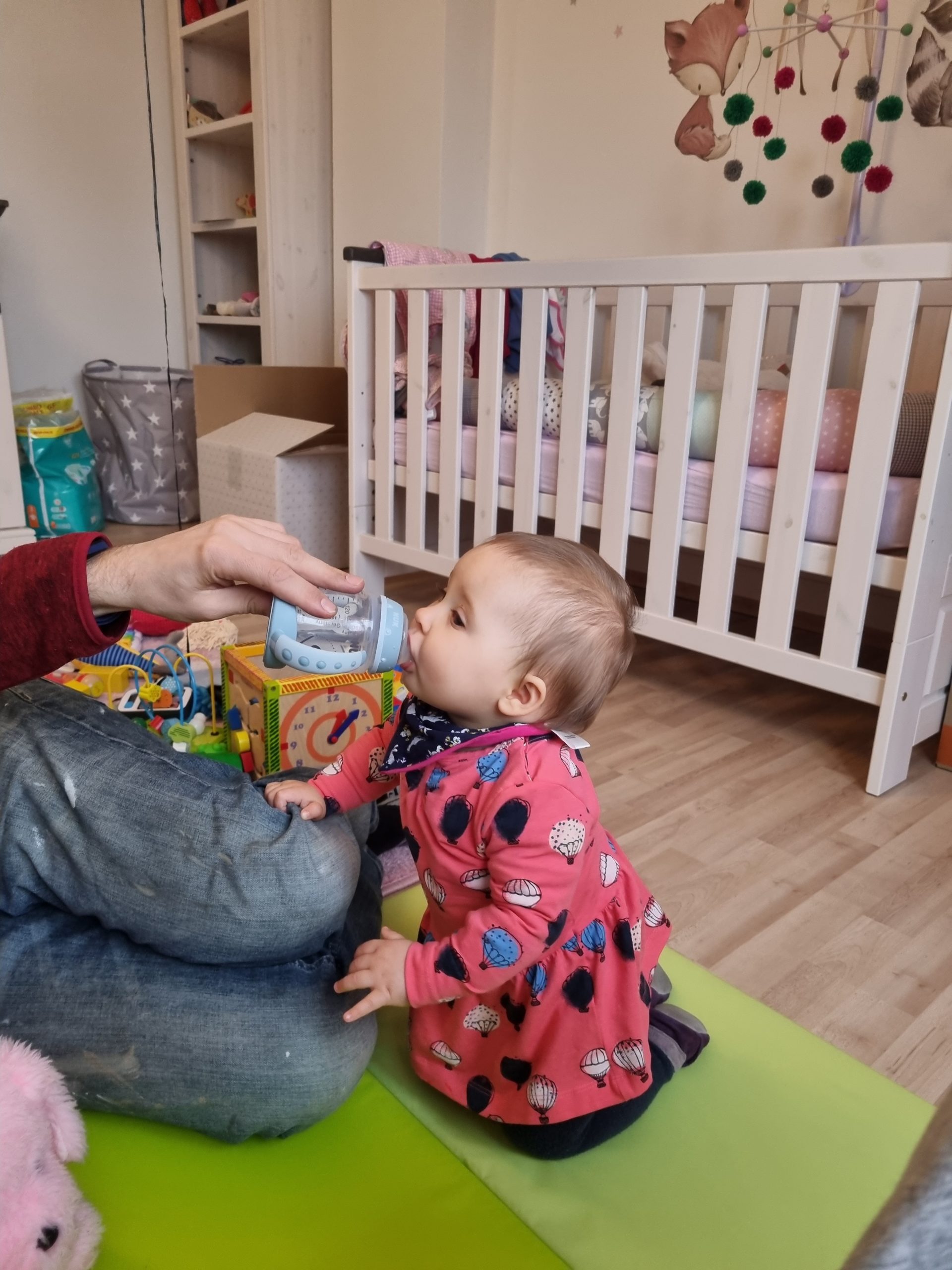 Meine Milch trinke ich jetzt nur noch aus der Flasche und schlafen tue ich seit Neuestem im eigenen Bettchen in meinem Zimmer. Da hält mich niemand mit seinem Geschnarche wach und ich kann gemütlich meine 11-12 Stunden (durch!)schlummern. Ich hoffe, Mama und Papa vermissen mich nicht allzu sehr, aber ich bin nun mal schon ein großes Mädchen.