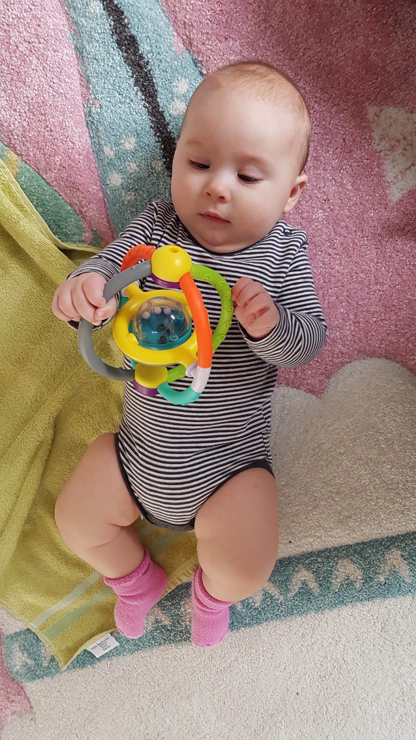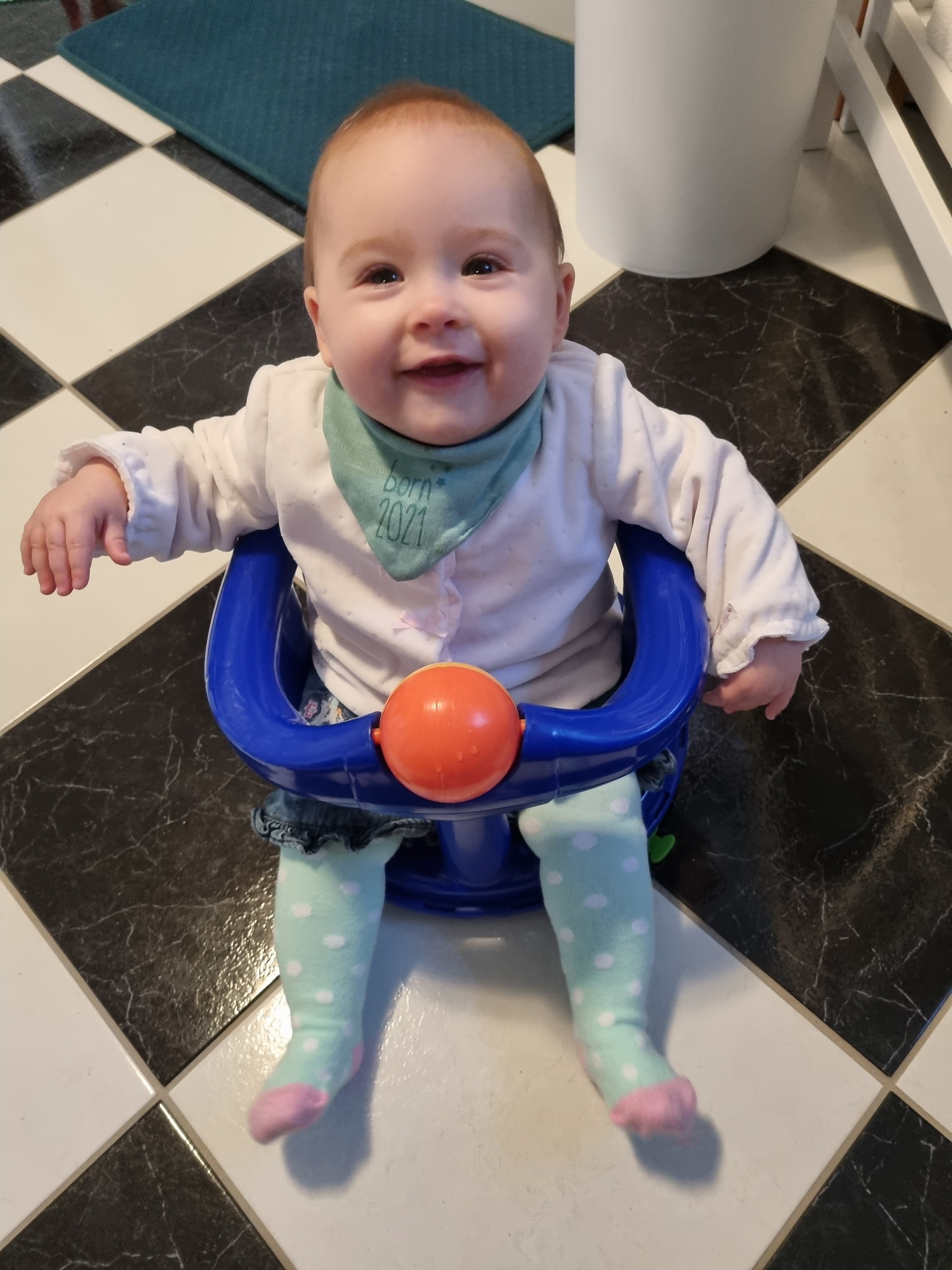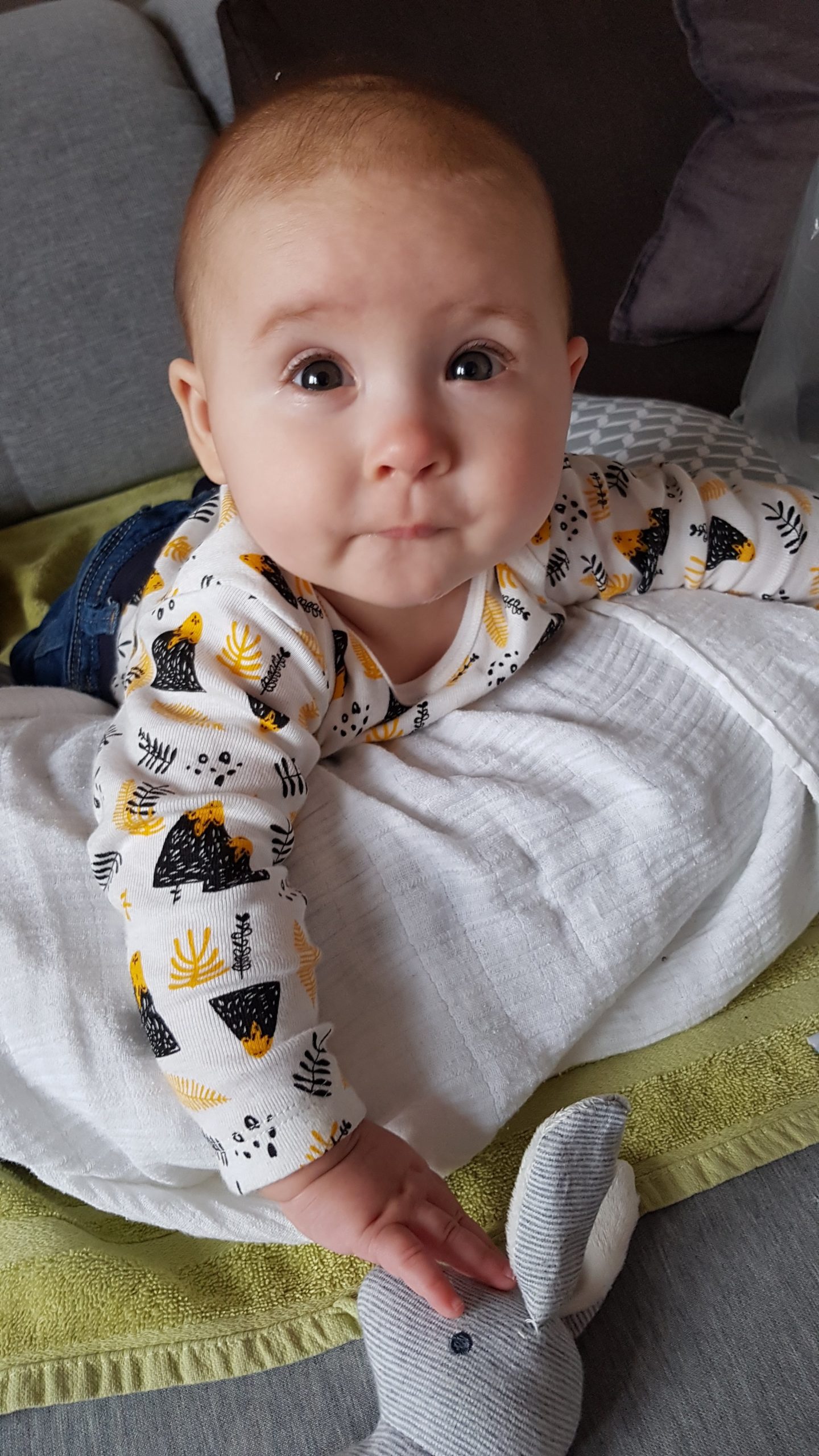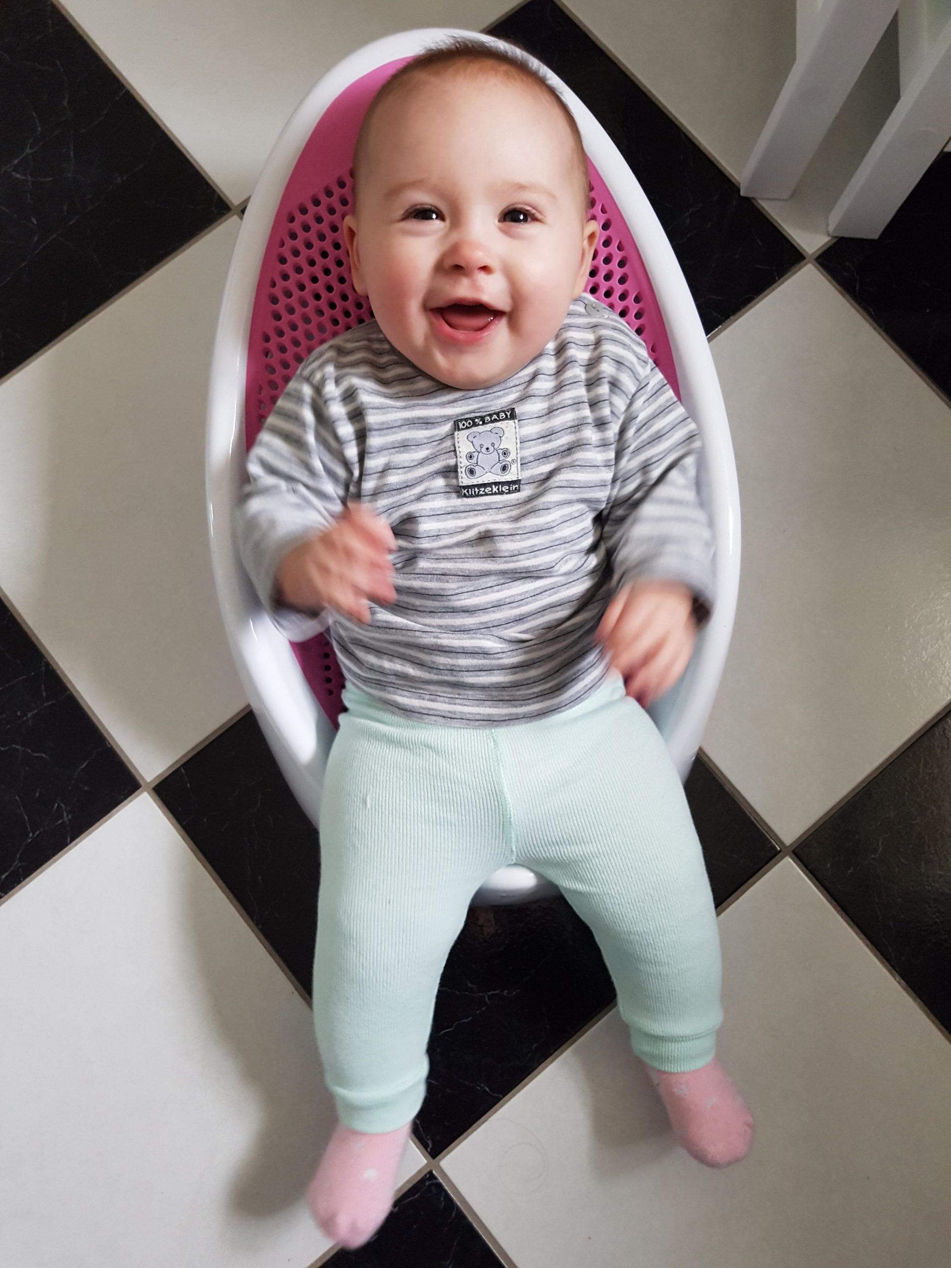 Ich bin jetzt knapp 65 cm groß und wiege 7250 g. Am liebsten mache ich derzeit Spuckebläschen und rudere mit den Armen. Außerdem übe ich weiterhin fleißig das Drehen und Aufsetzen. Liegen ist schließlich nur was für Babies…