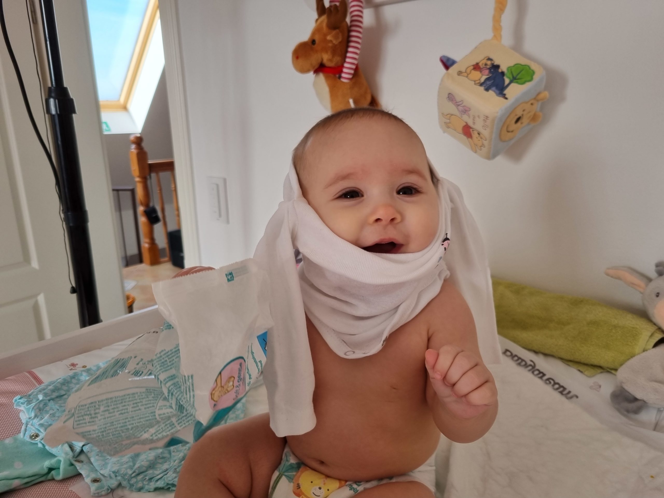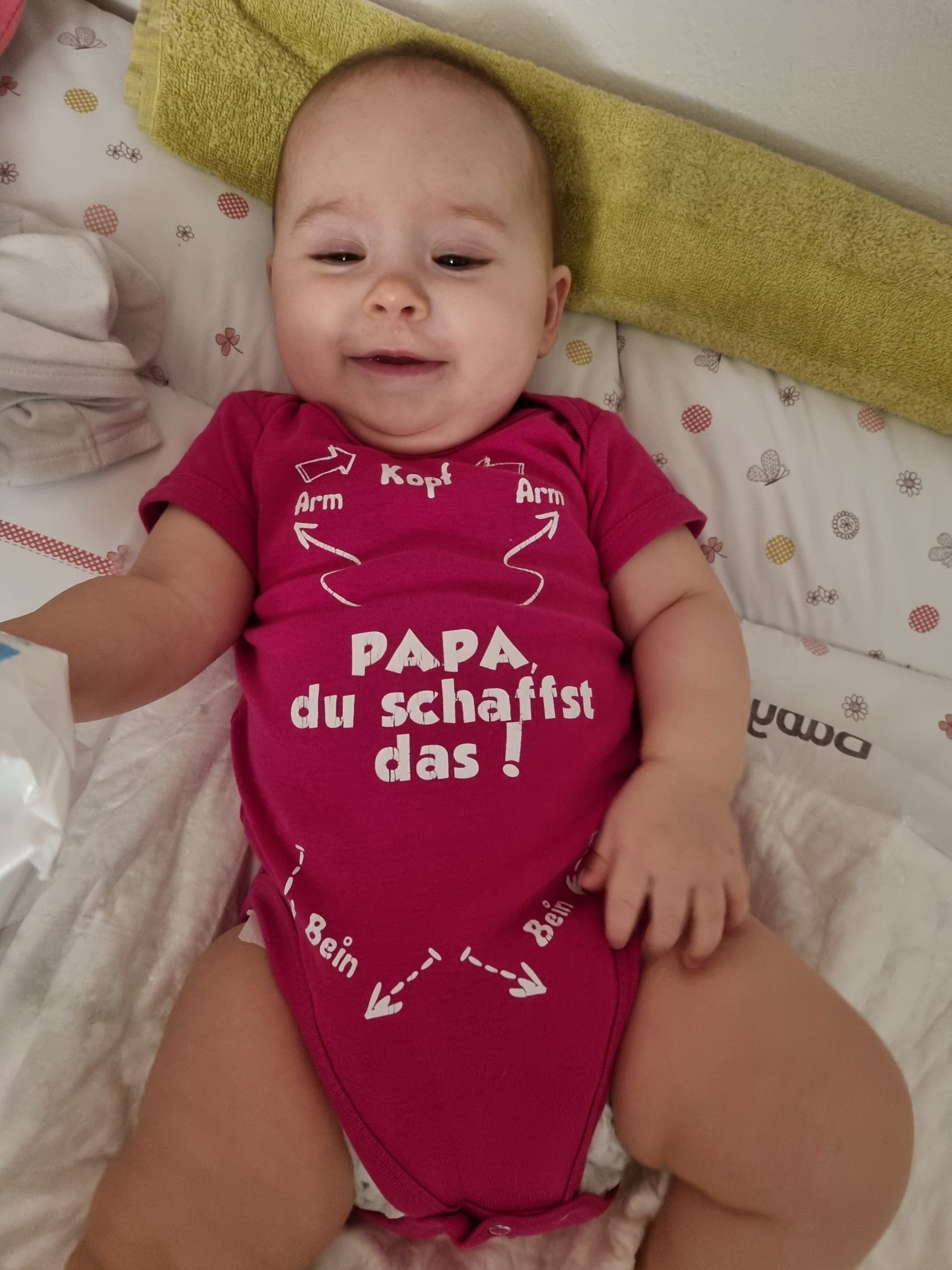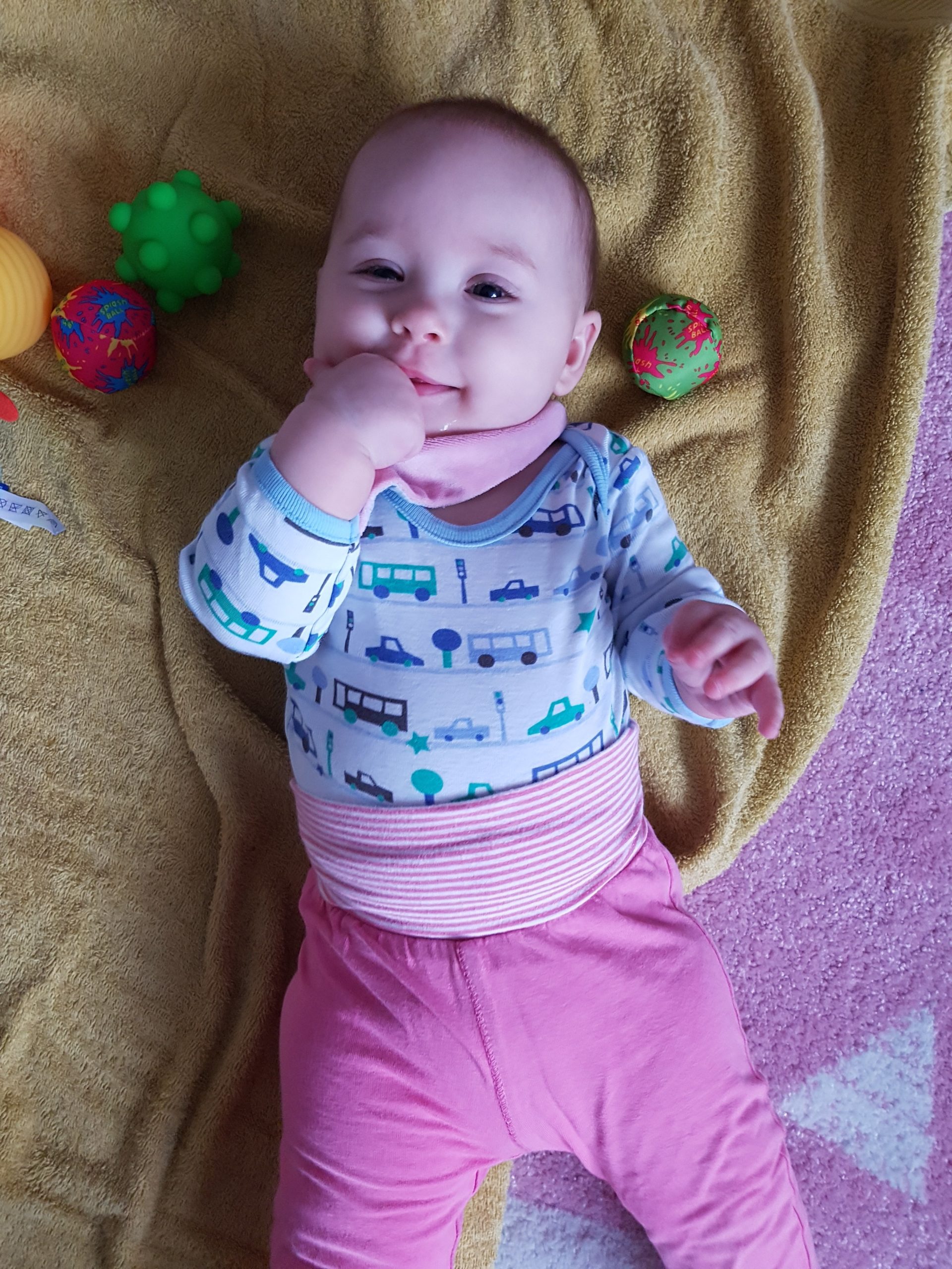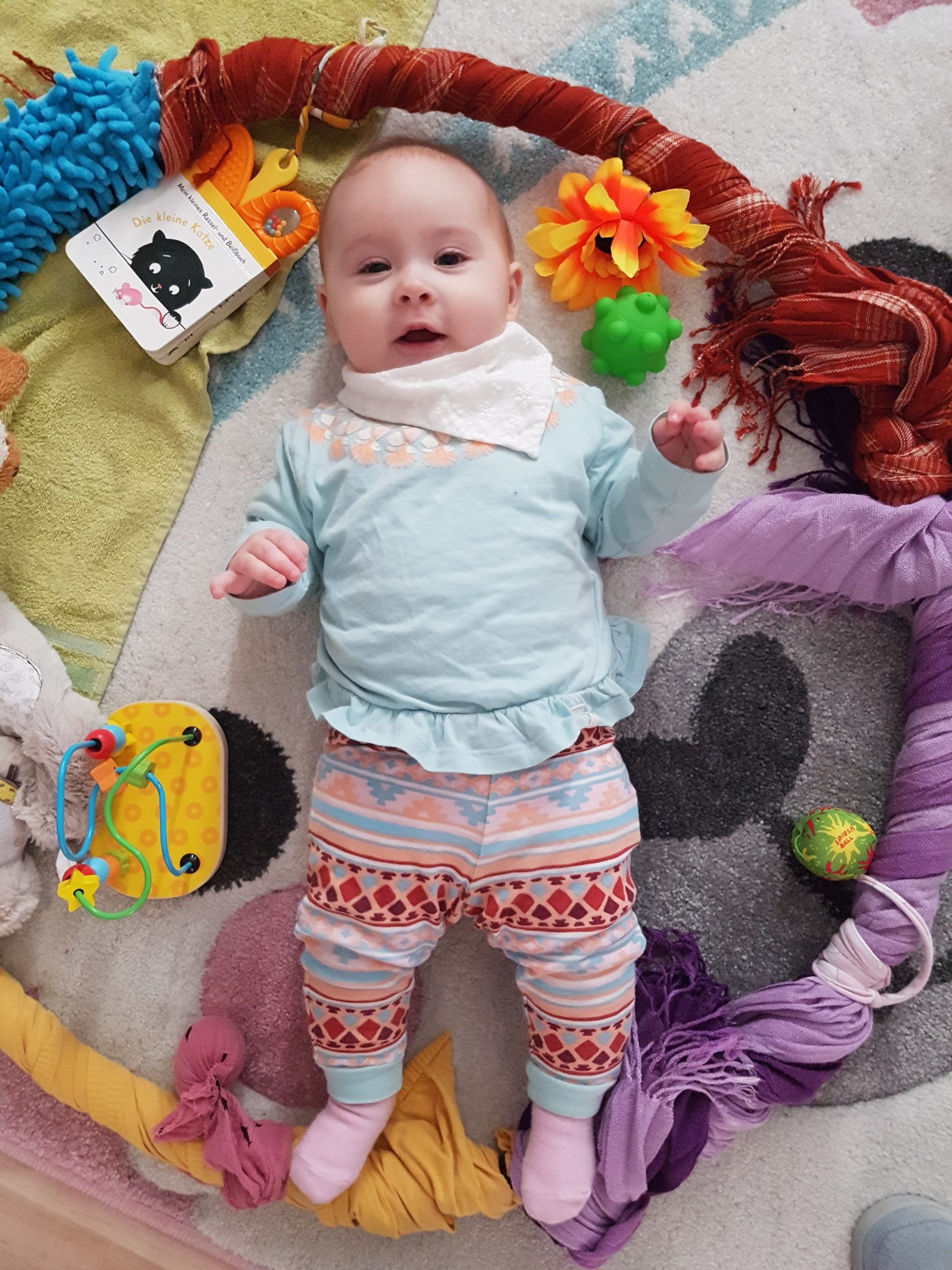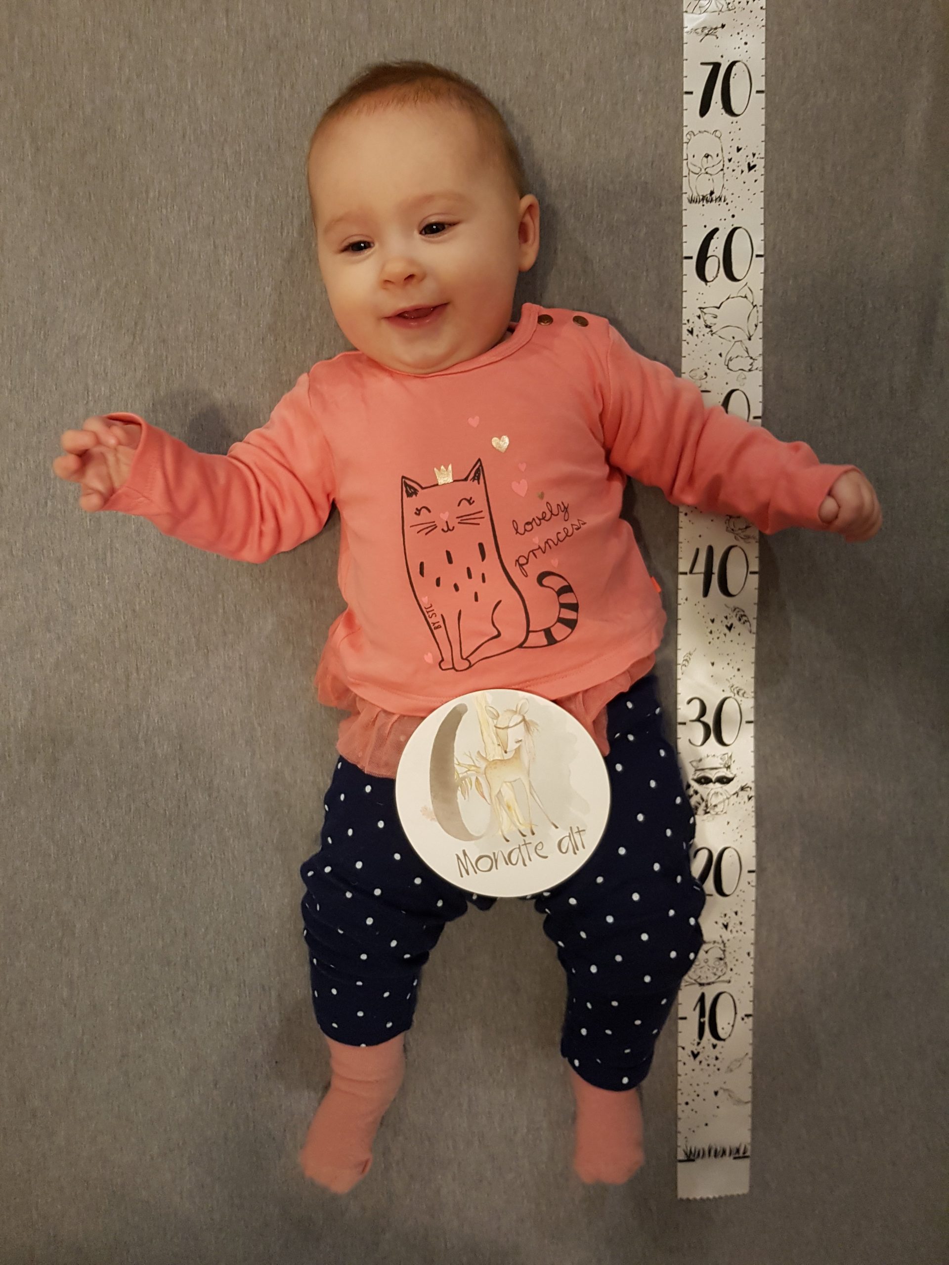 Seitdem bin ich auf fast 70 cm und 7700 g gewachsen, habe das Brabbeln, Greifen, unterstützte Aufsetzen und Drehen gelernt.