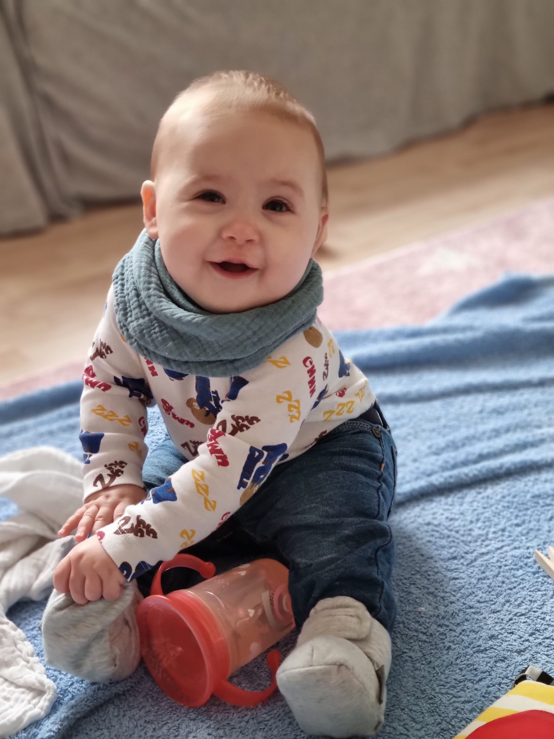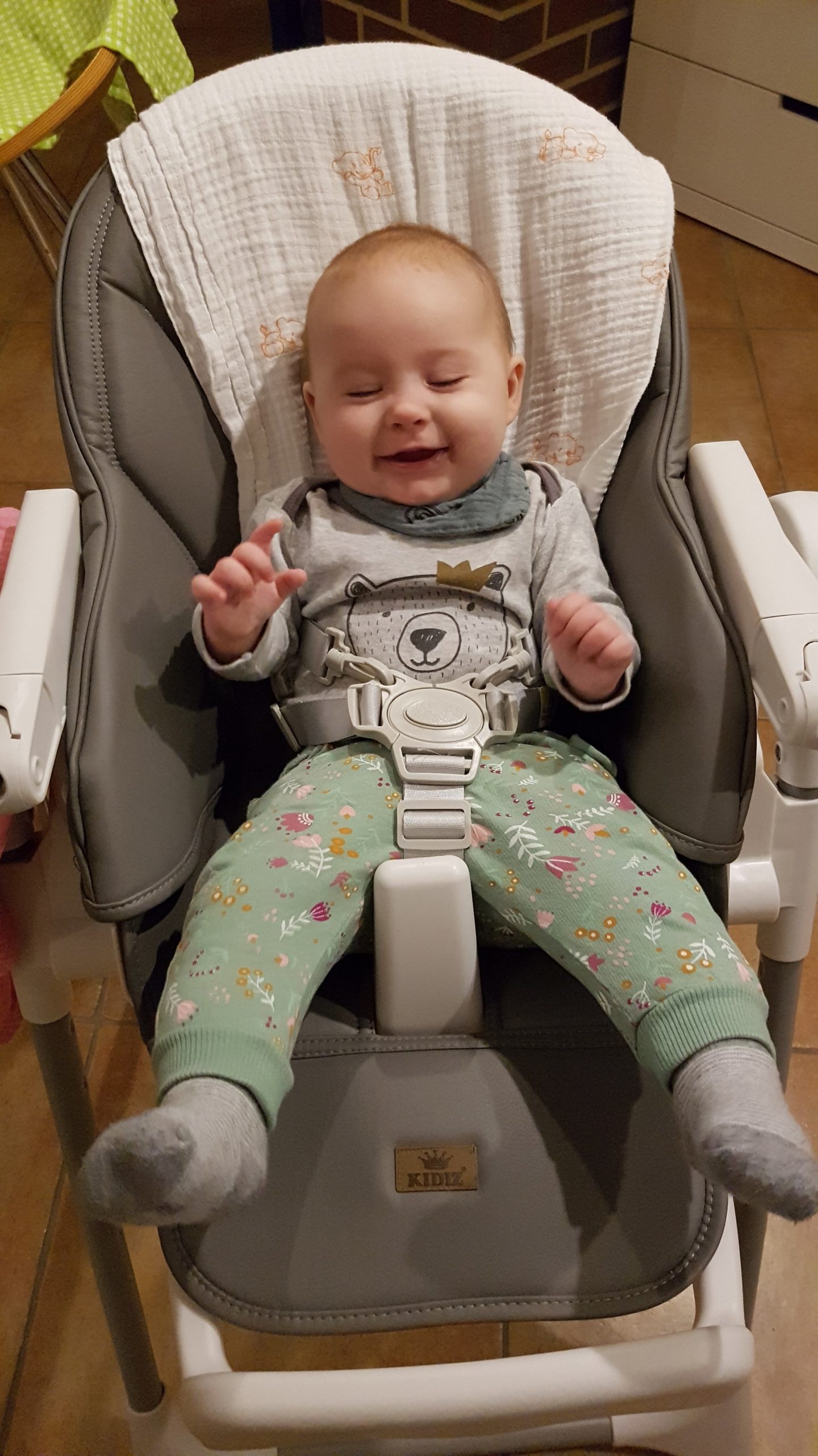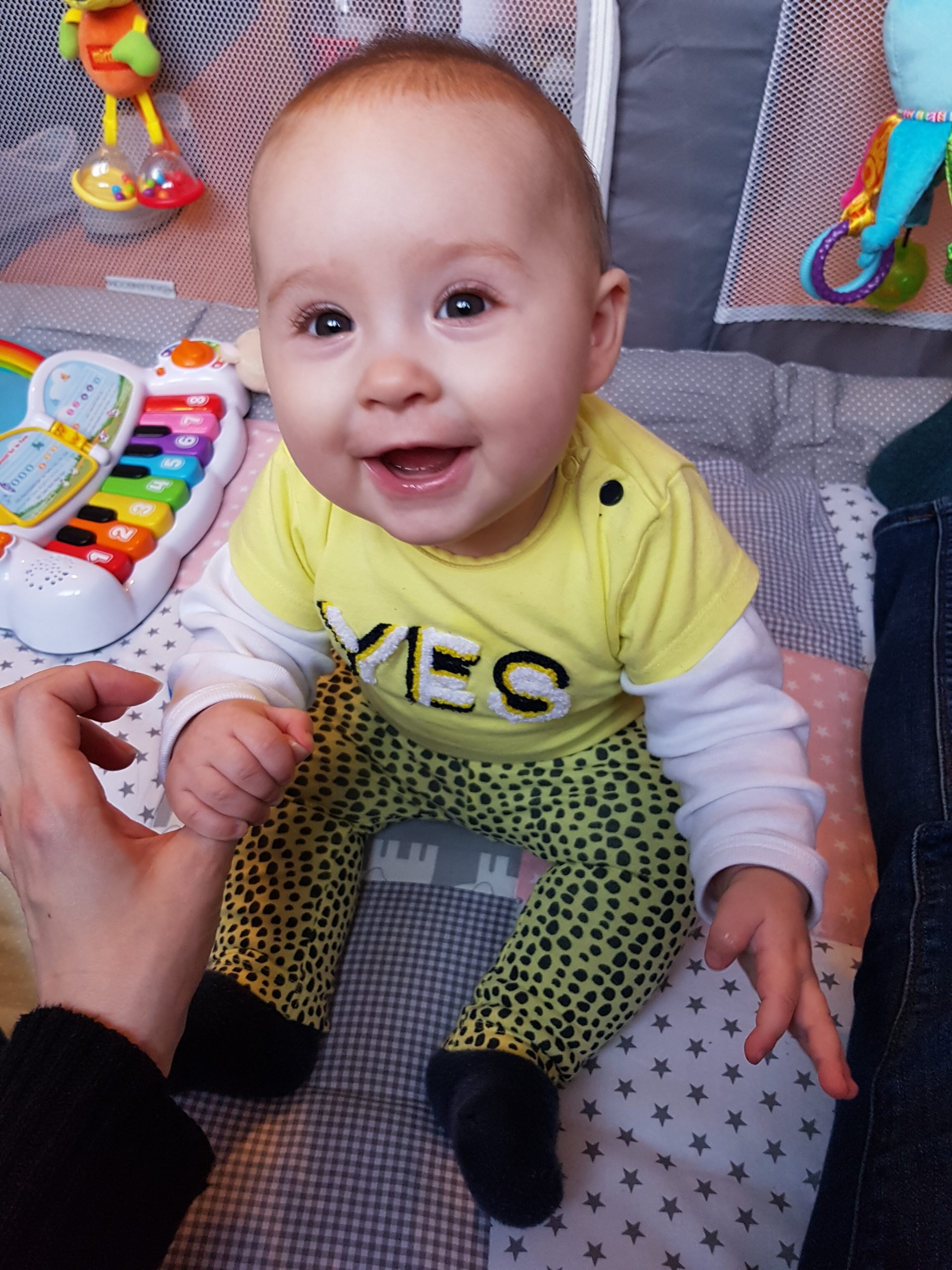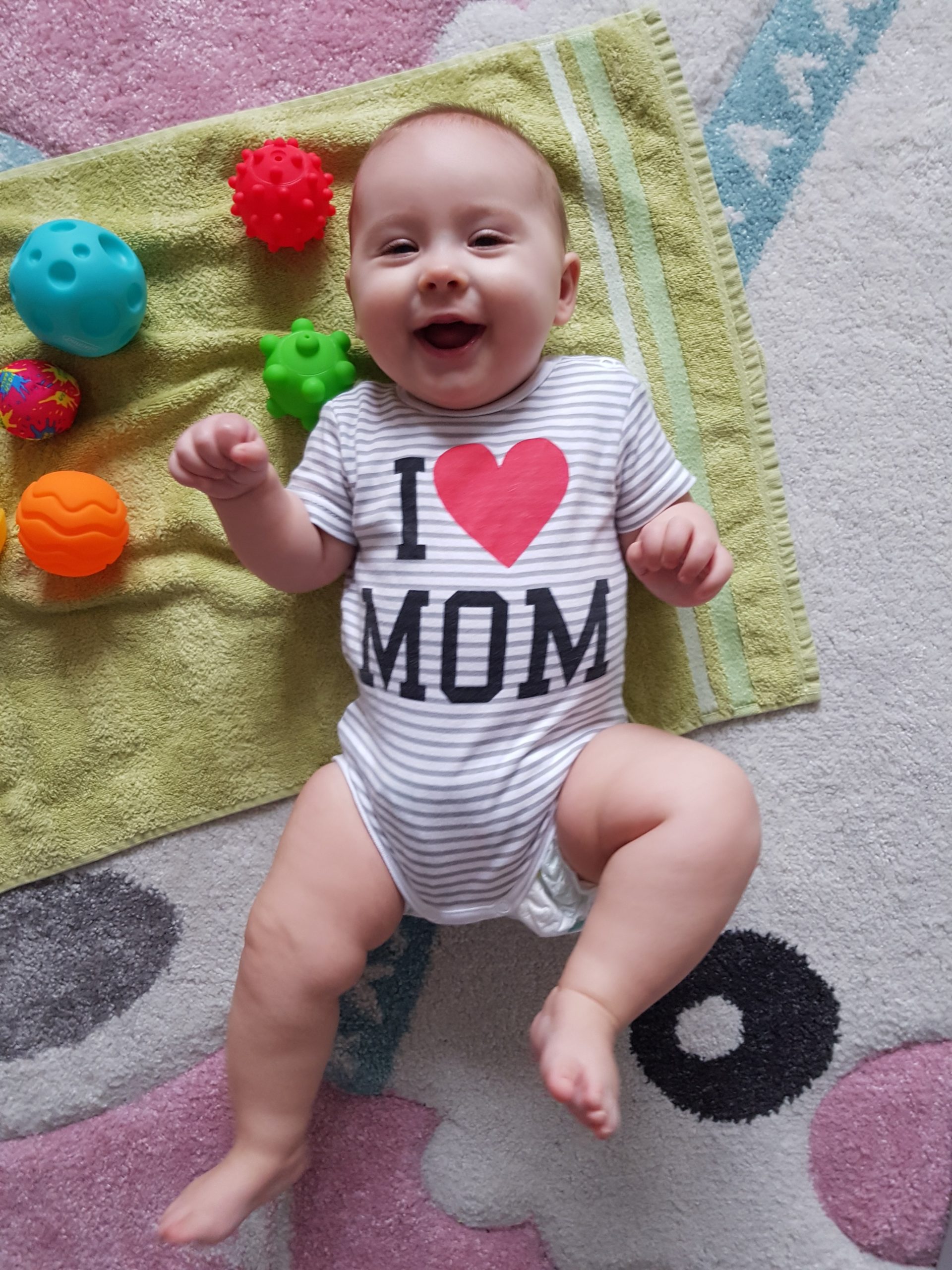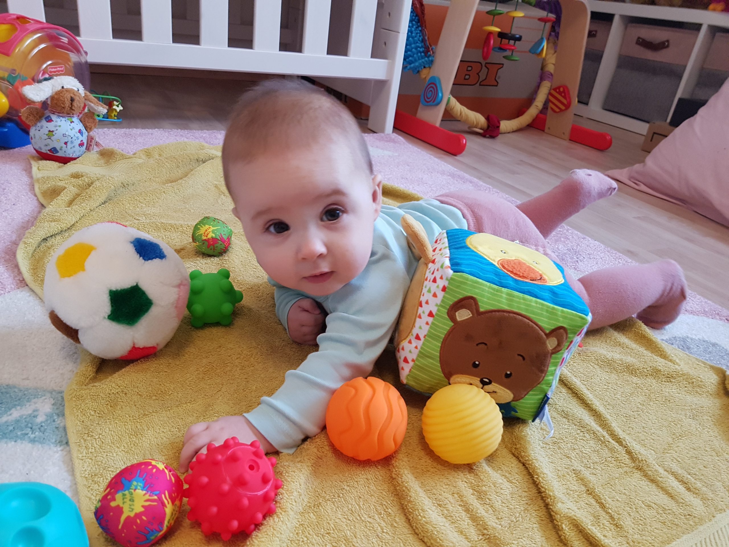 Seitdem bin ich auf fast 70 cm und 7700 g gewachsen, habe das Brabbeln, Greifen, unterstützte Aufsetzen und Drehen gelernt.