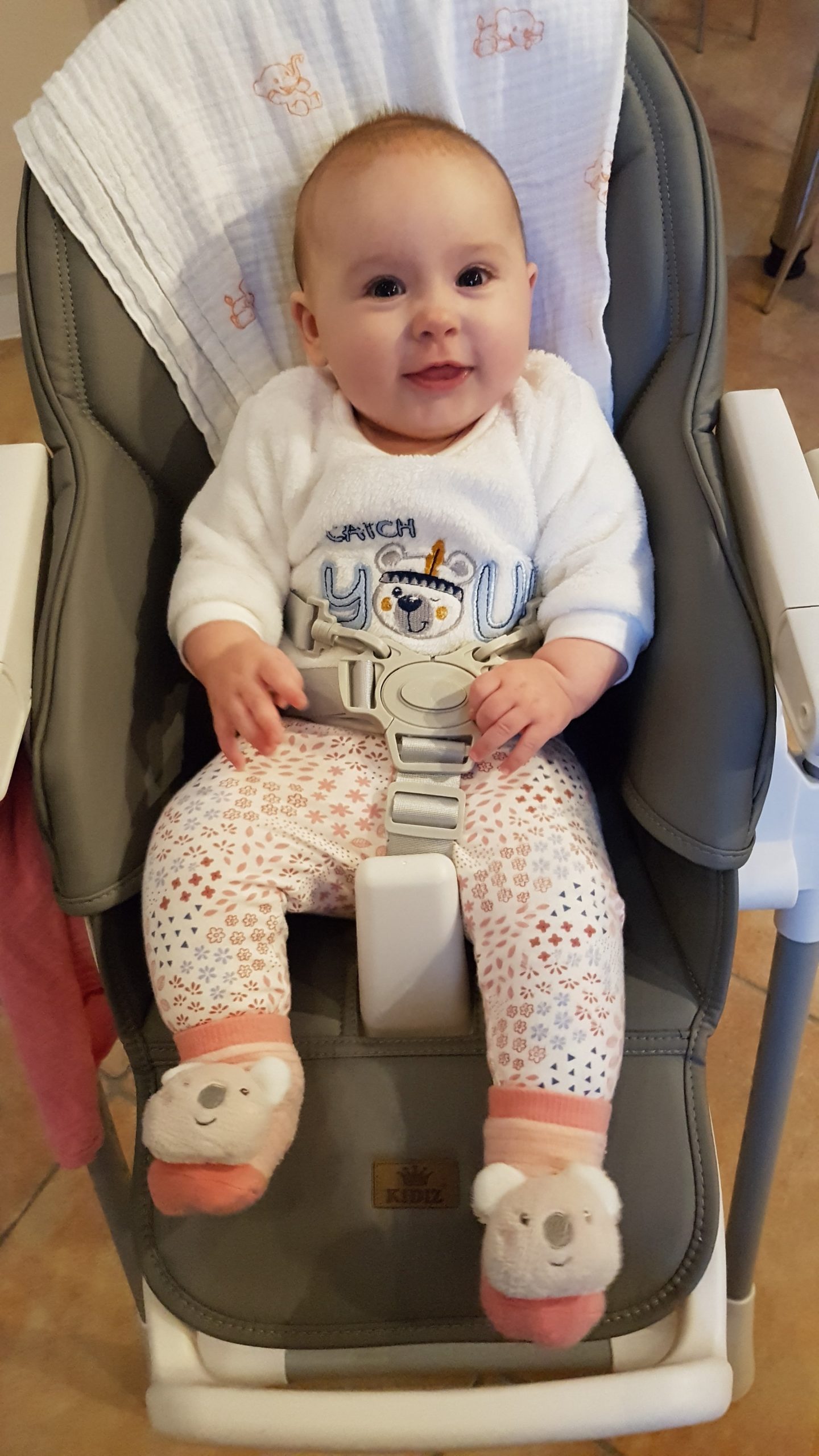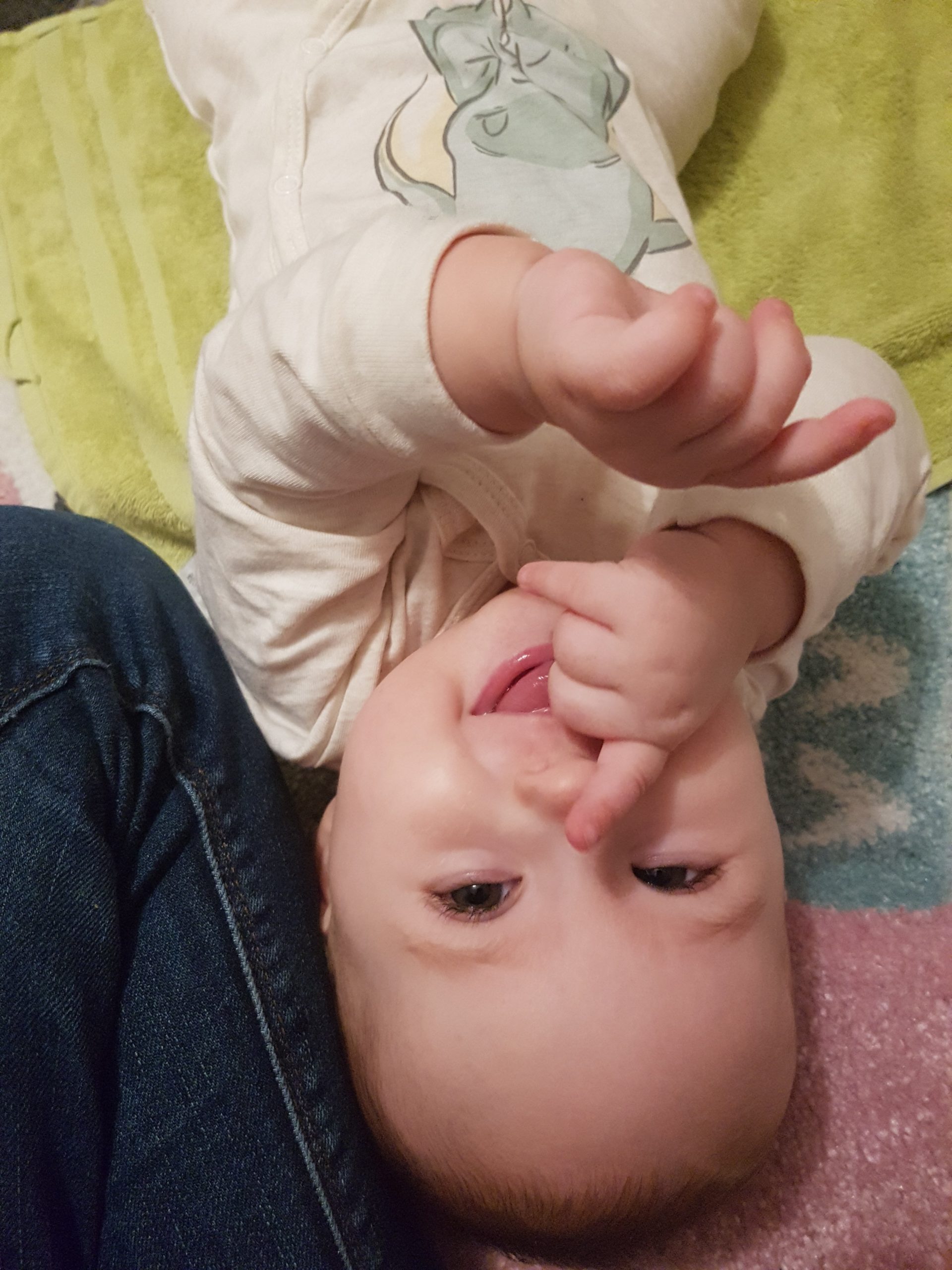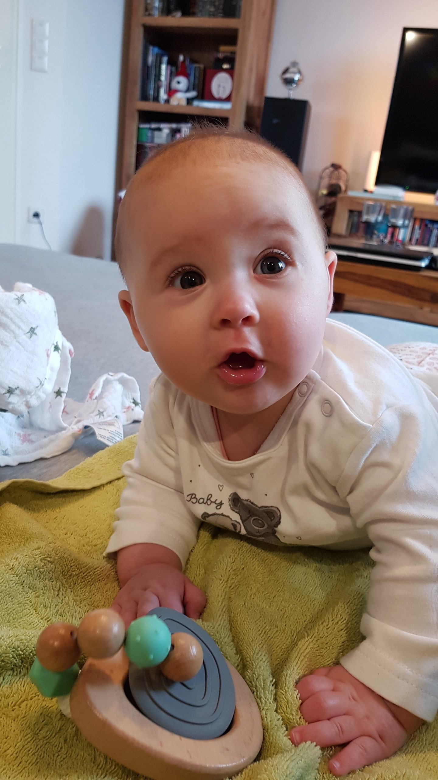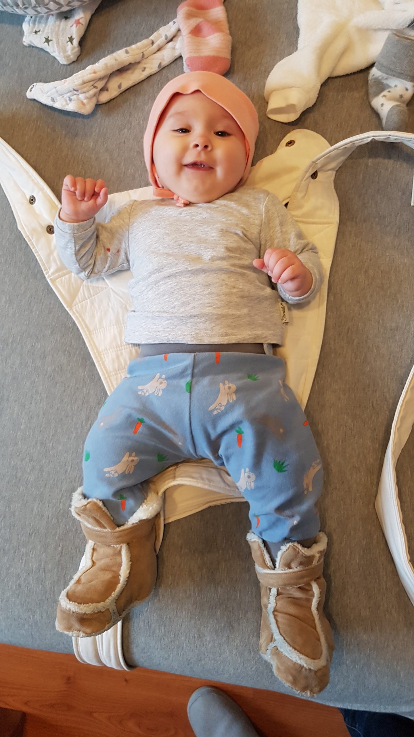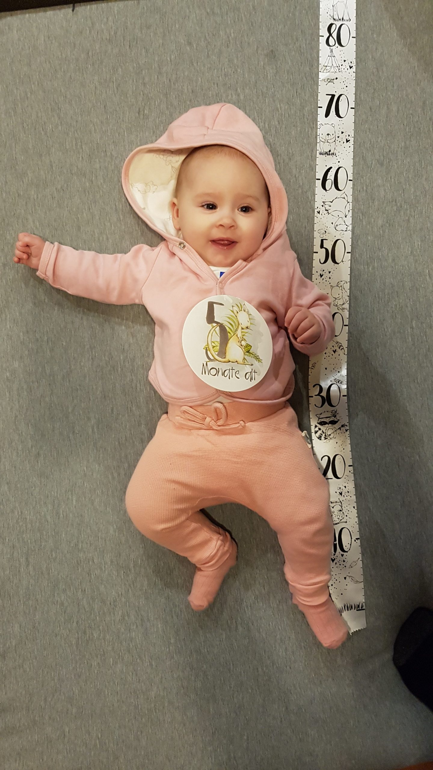 Seitdem bin ich auf fast 70 cm und 7700 g gewachsen, habe das Brabbeln, Greifen, unterstützte Aufsetzen und Drehen gelernt.
