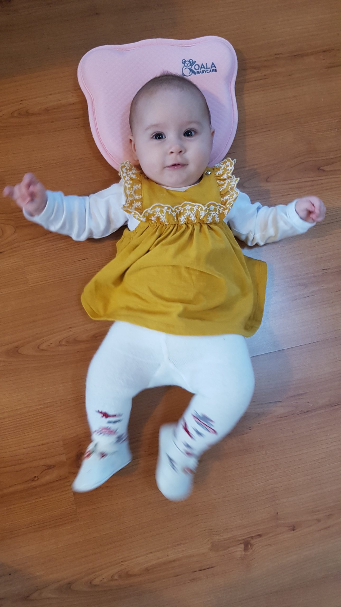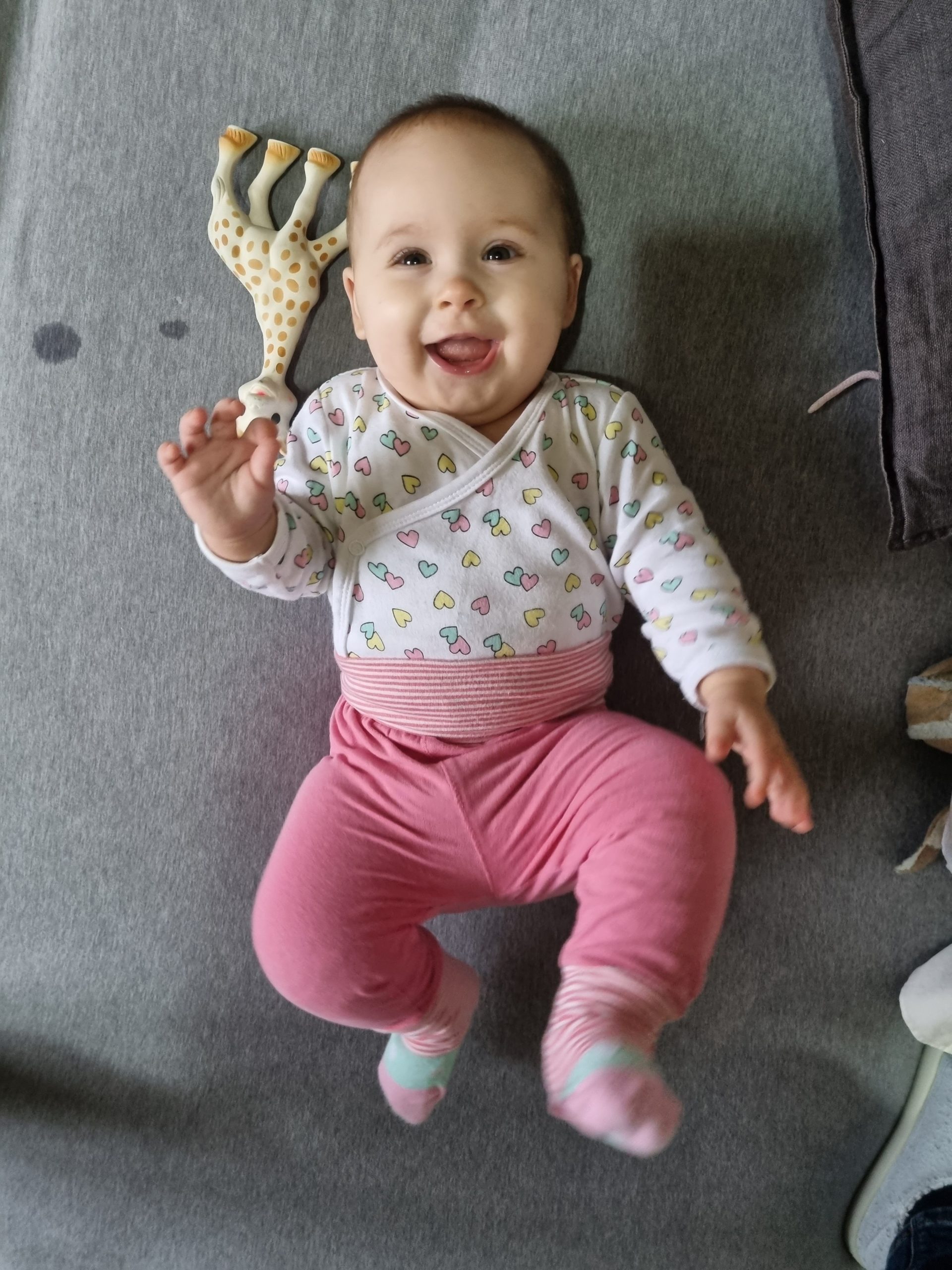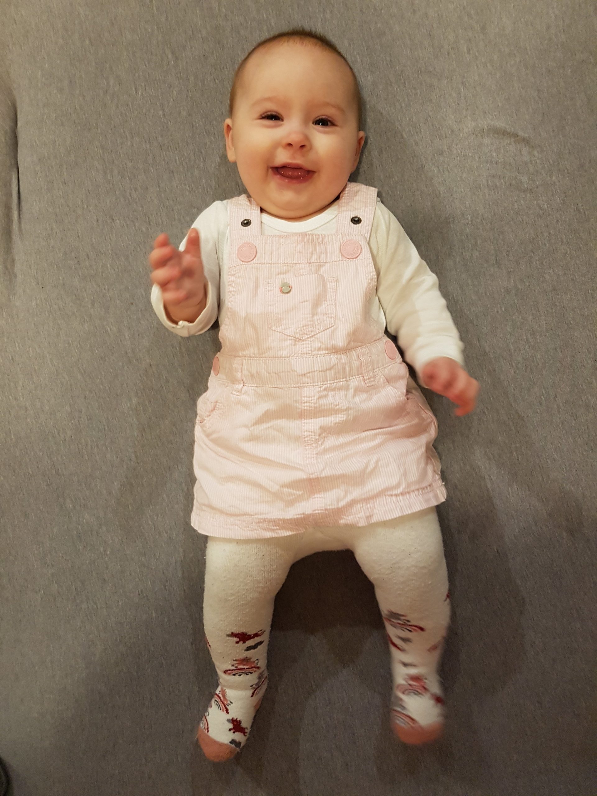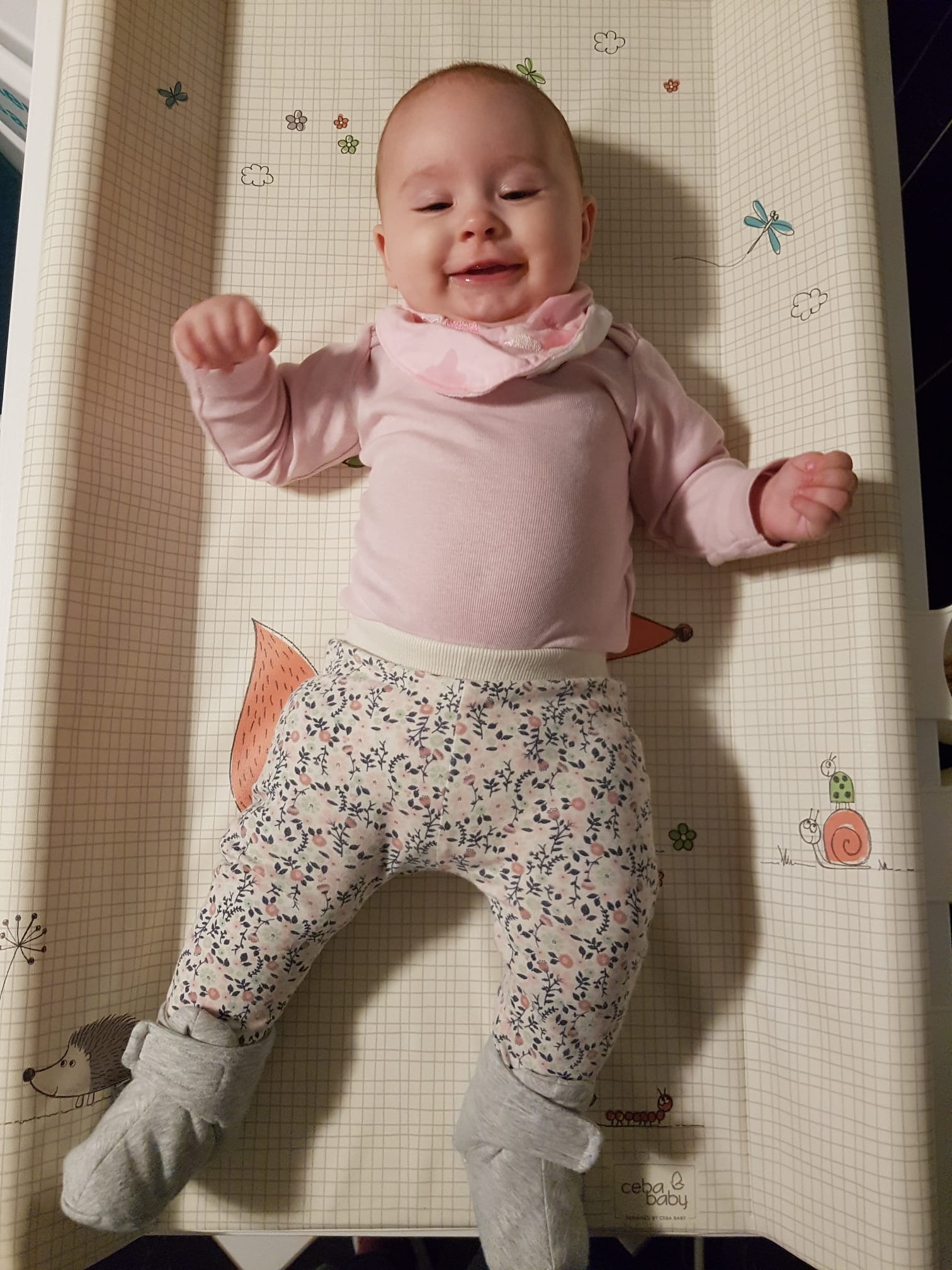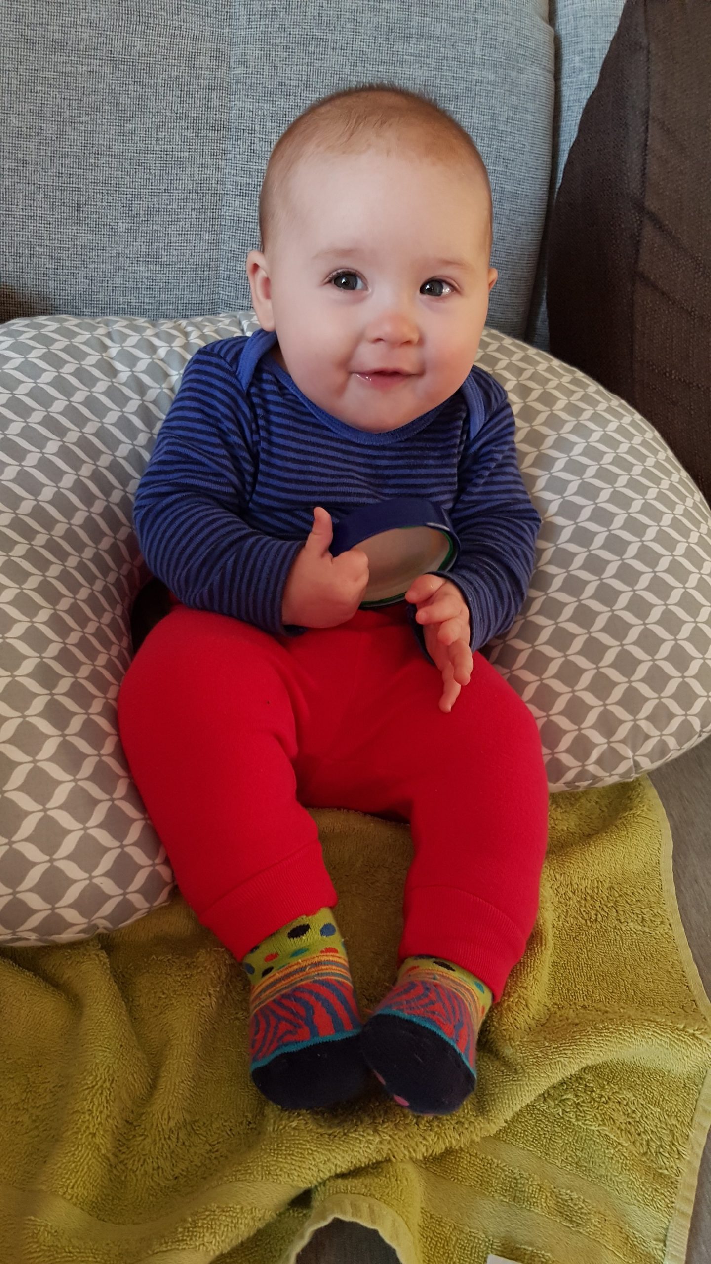 Seitdem bin ich auf fast 70 cm und 7700 g gewachsen, habe das Brabbeln, Greifen, unterstützte Aufsetzen und Drehen gelernt.