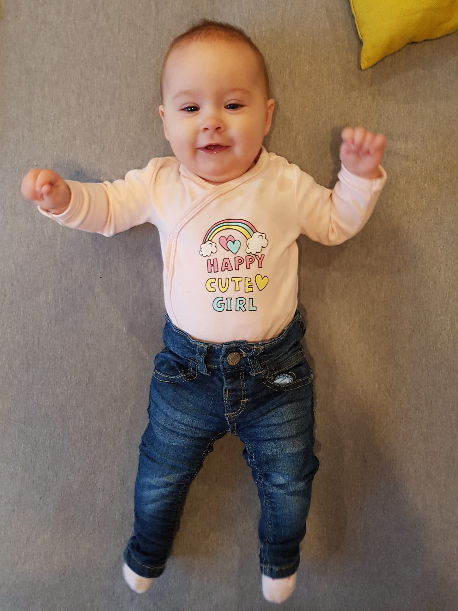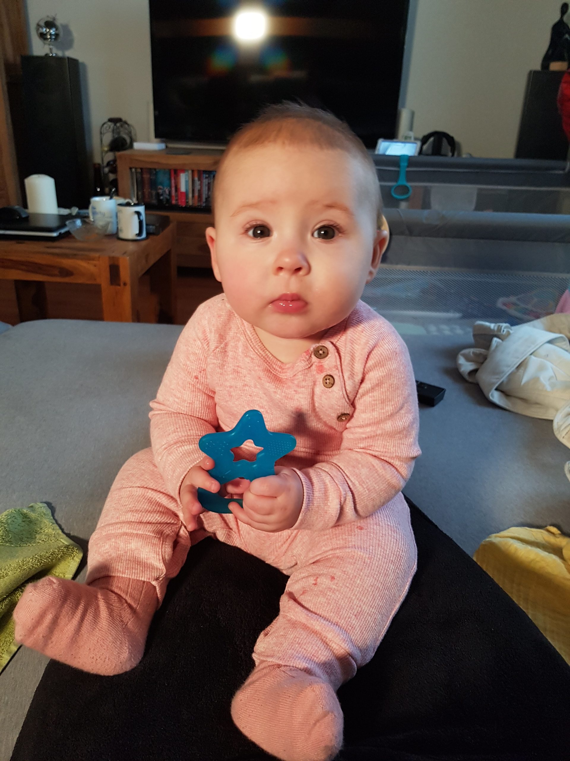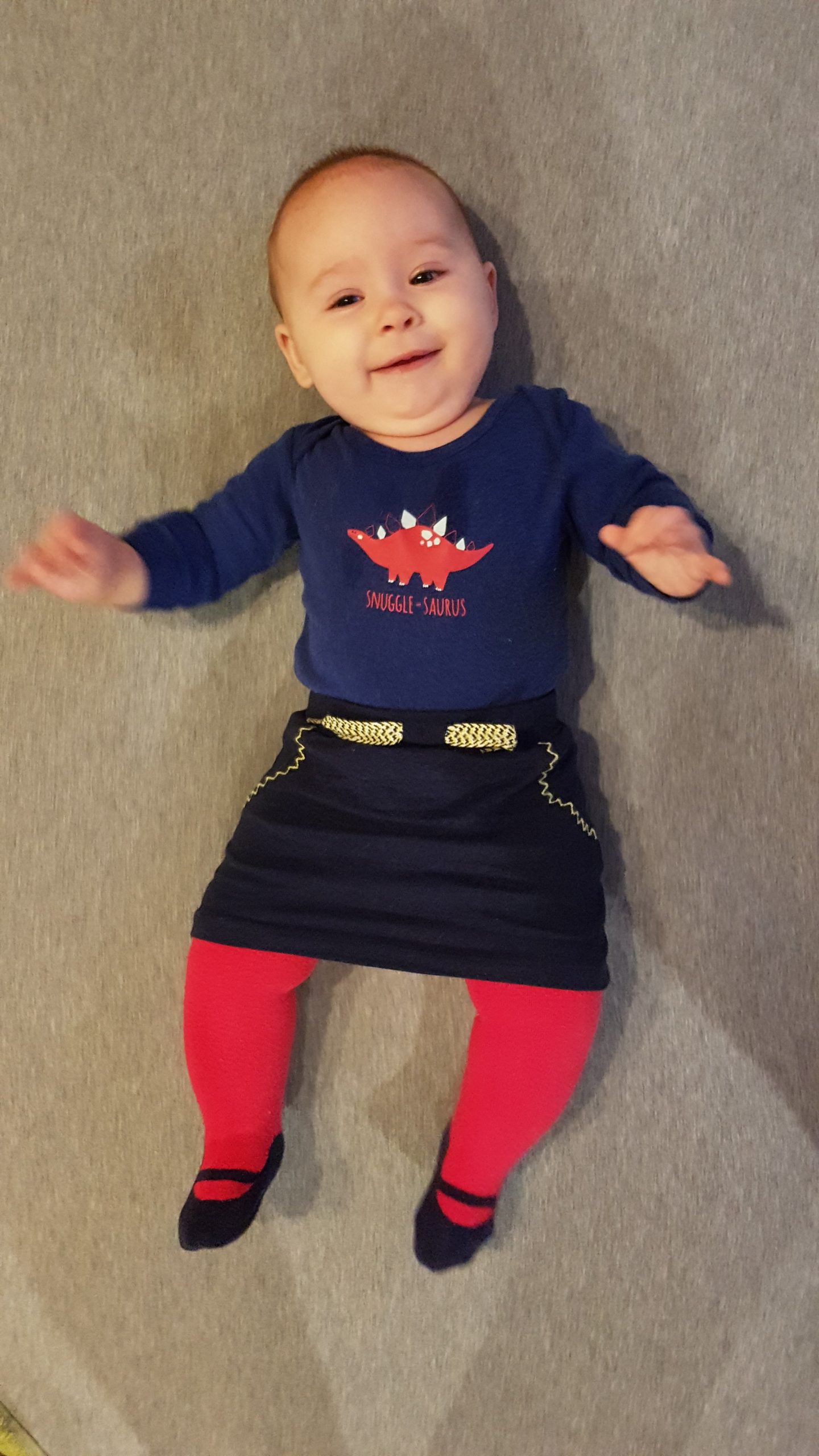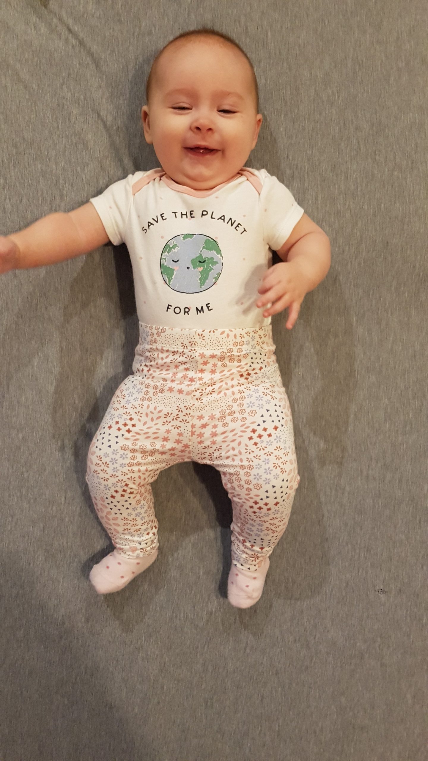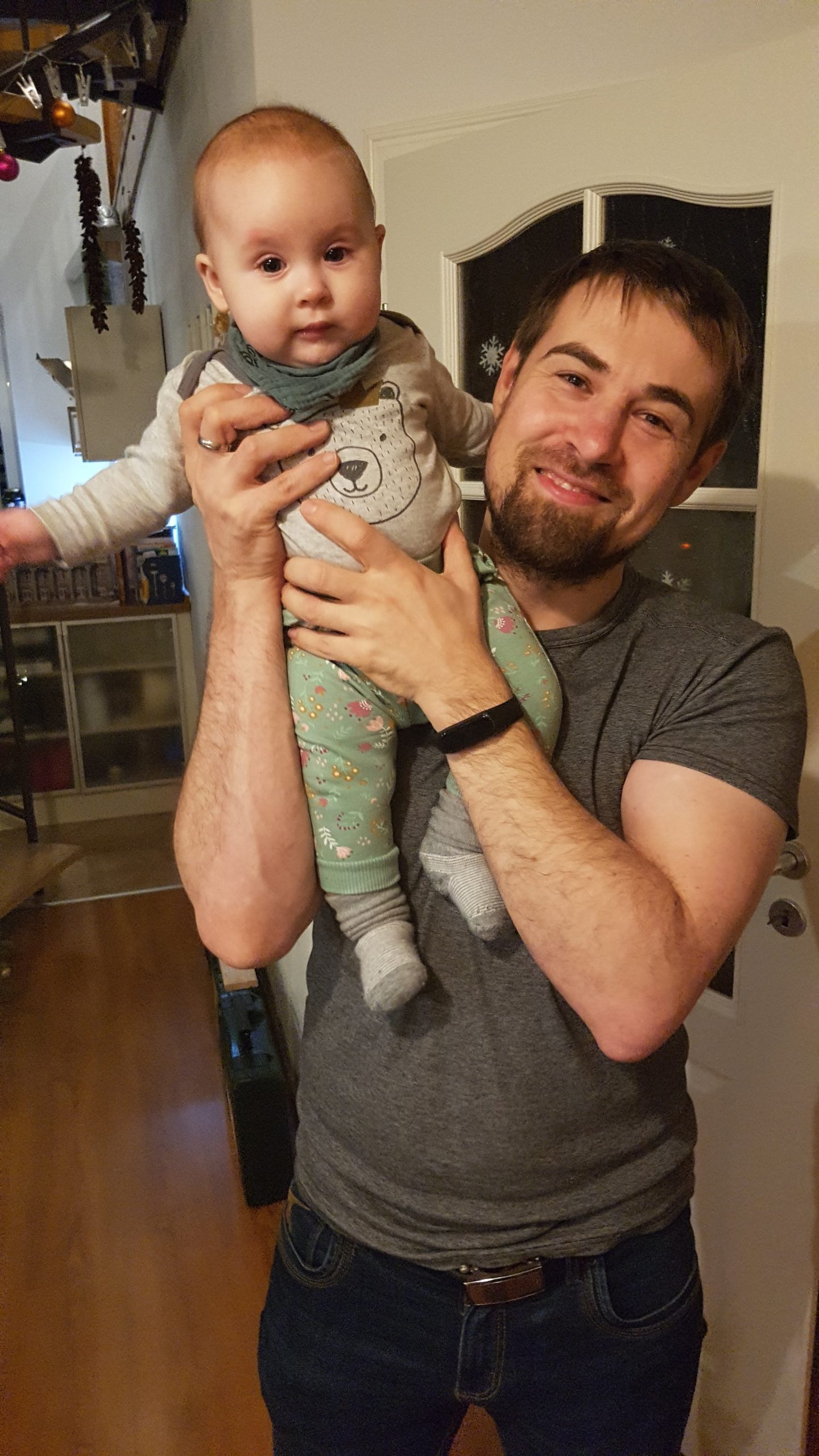 Seitdem bin ich auf fast 70 cm und 7700 g gewachsen, habe das Brabbeln, Greifen, unterstützte Aufsetzen und Drehen gelernt.