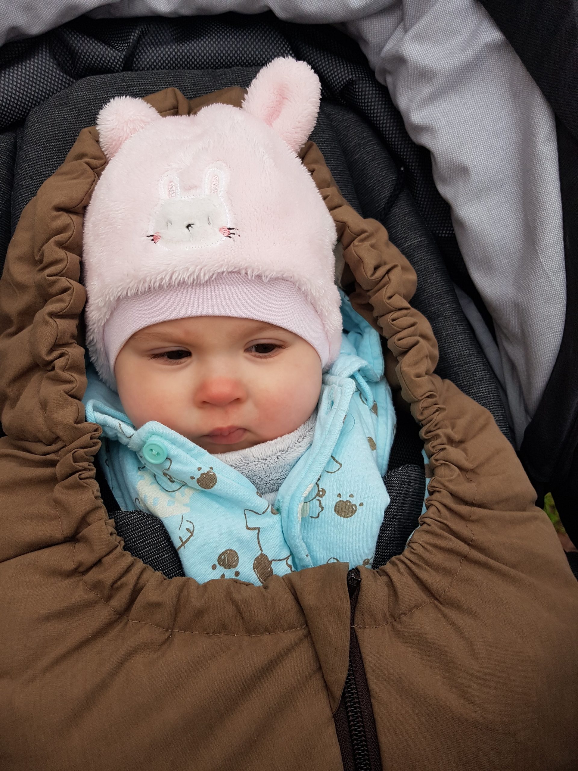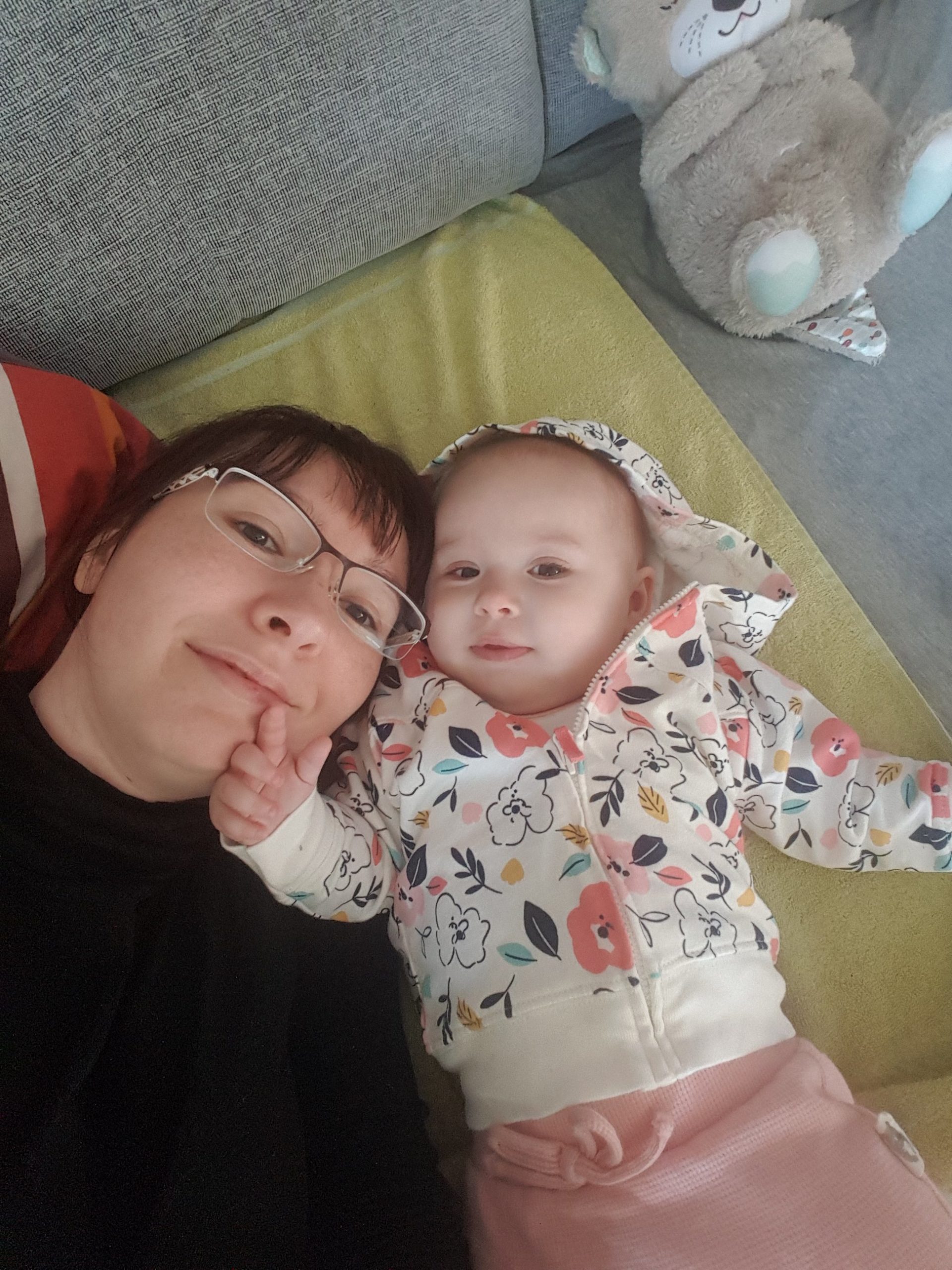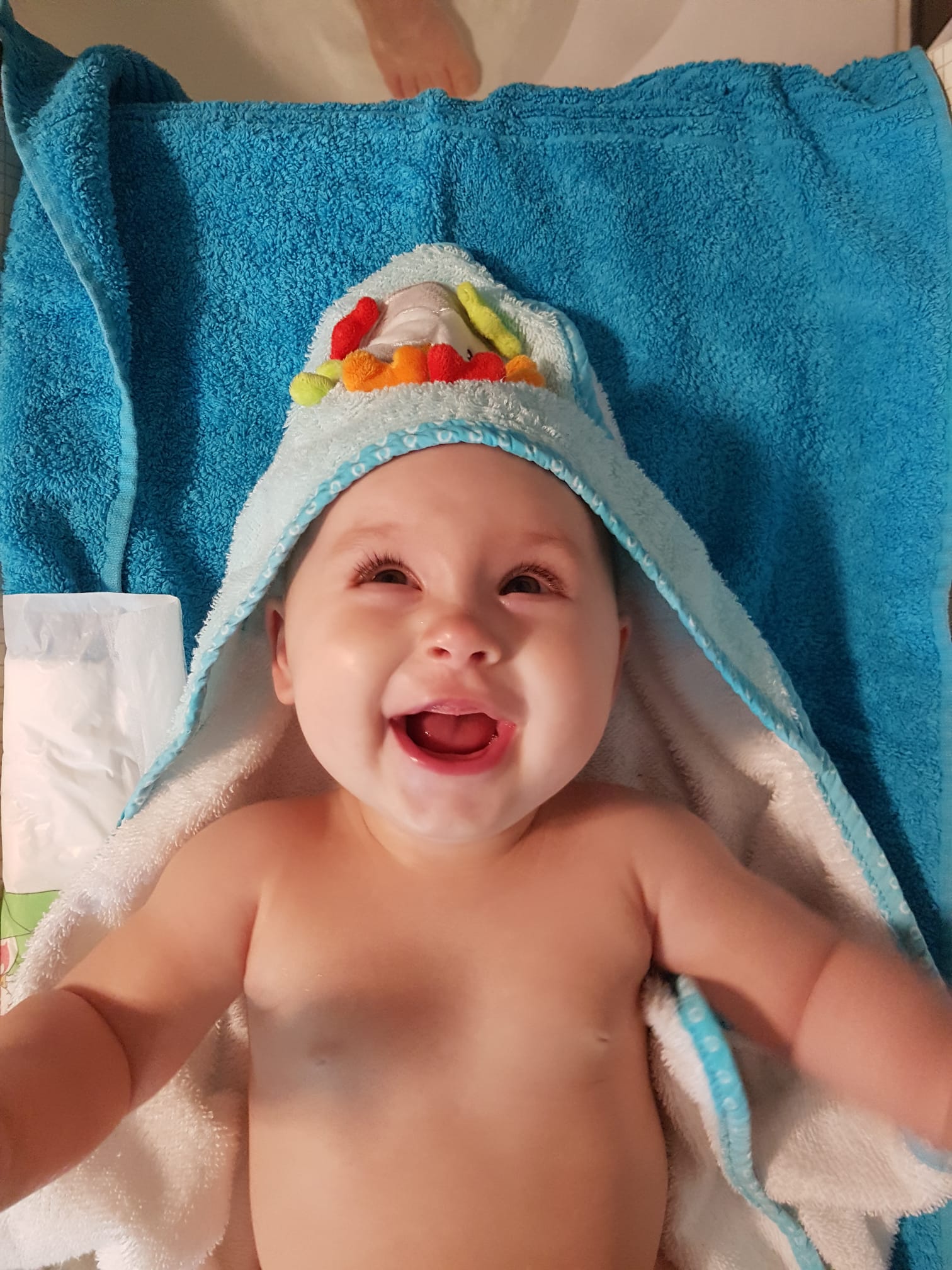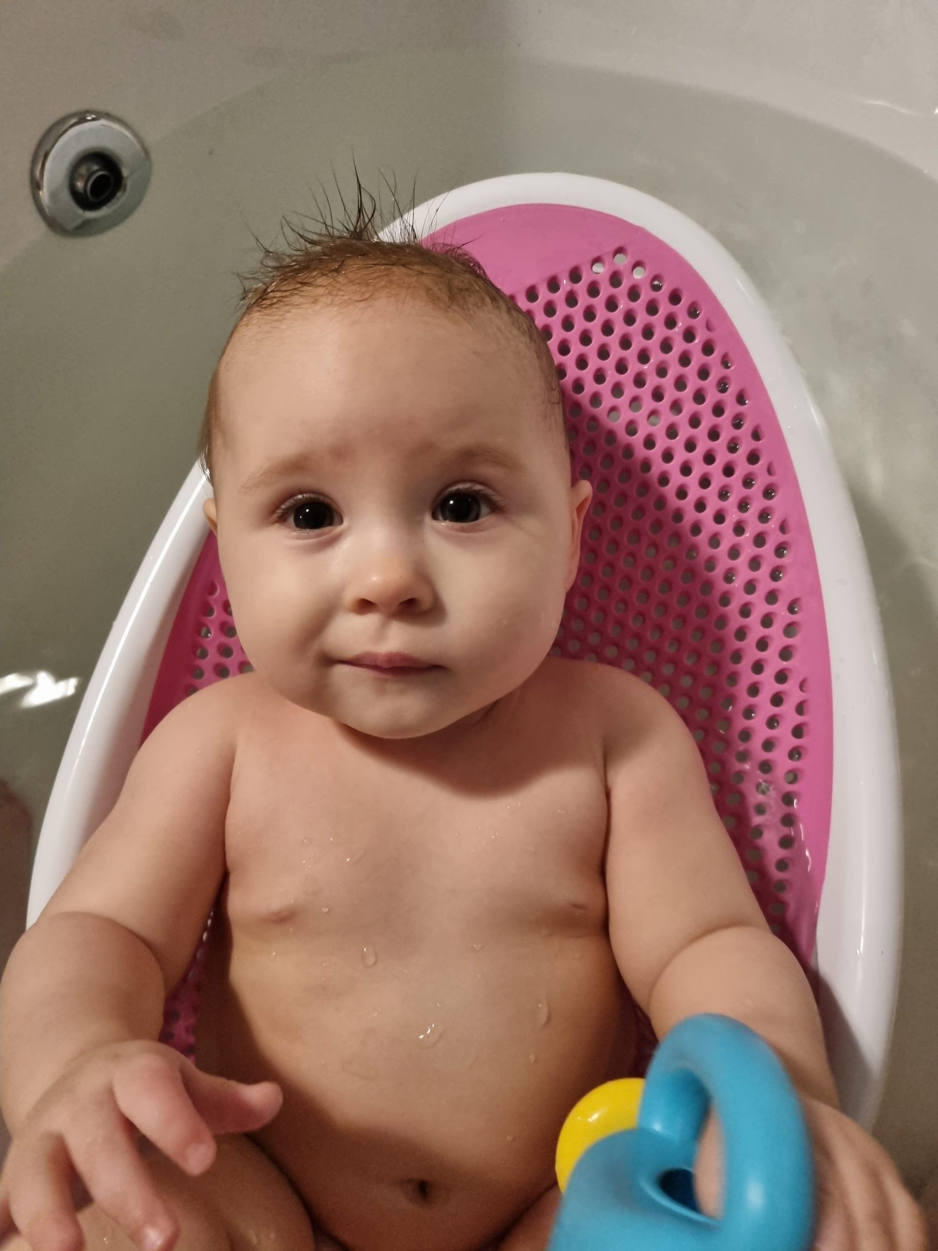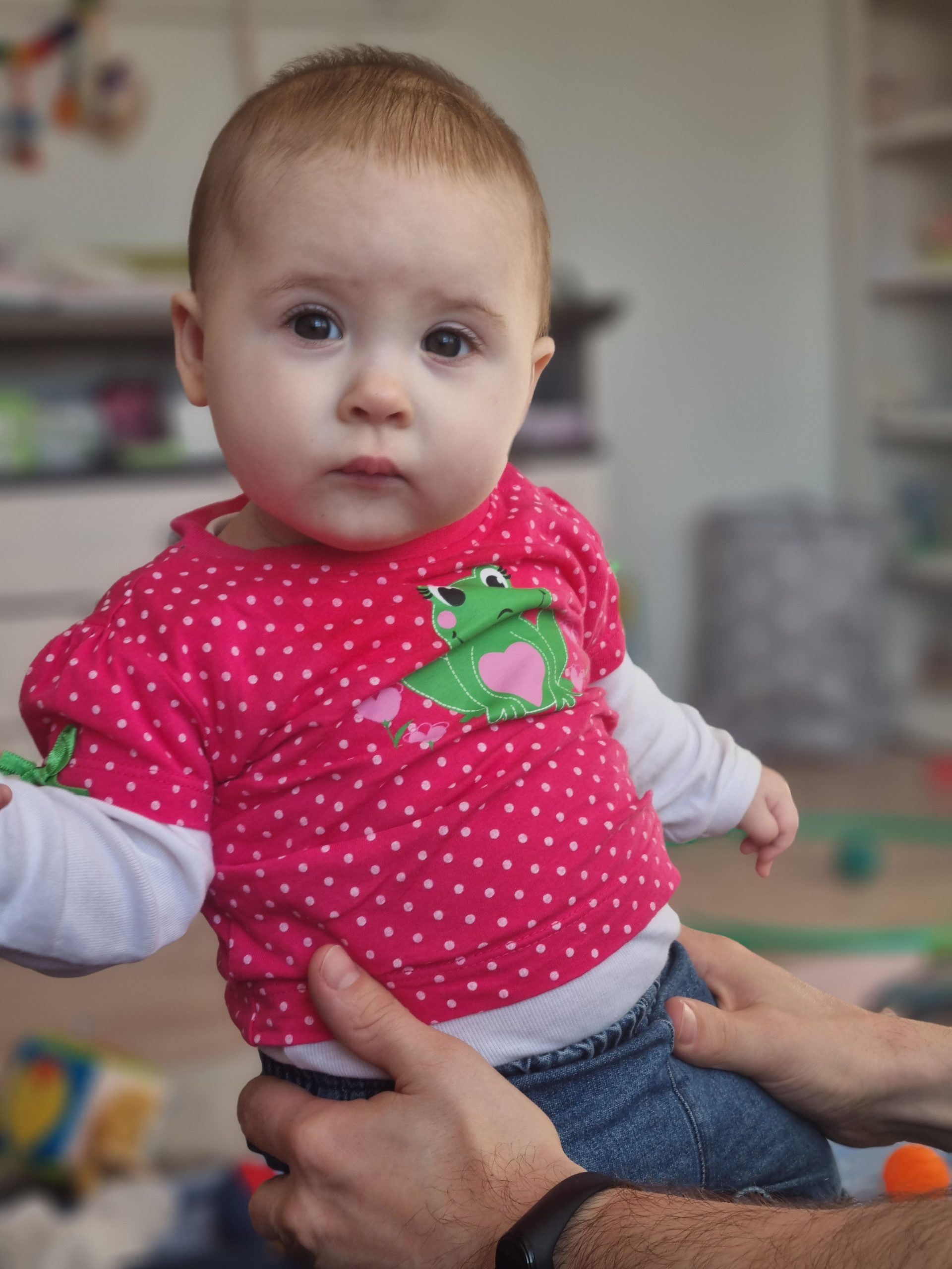 Seitdem bin ich auf fast 70 cm und 7700 g gewachsen, habe das Brabbeln, Greifen, unterstützte Aufsetzen und Drehen gelernt.