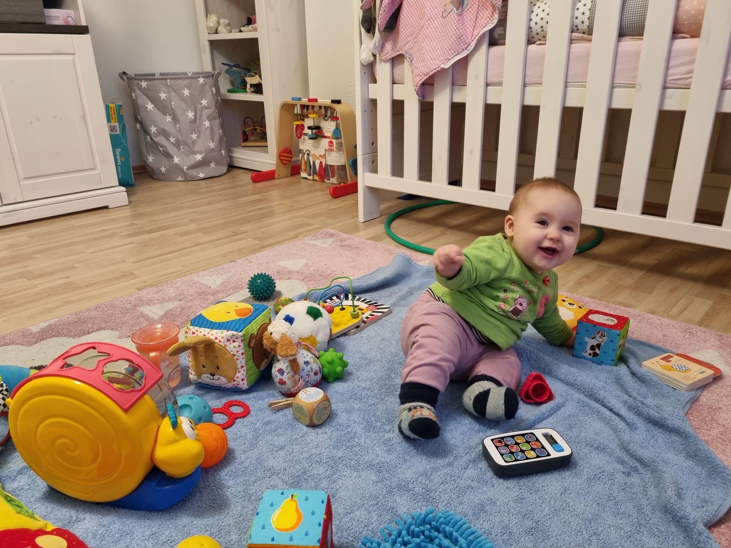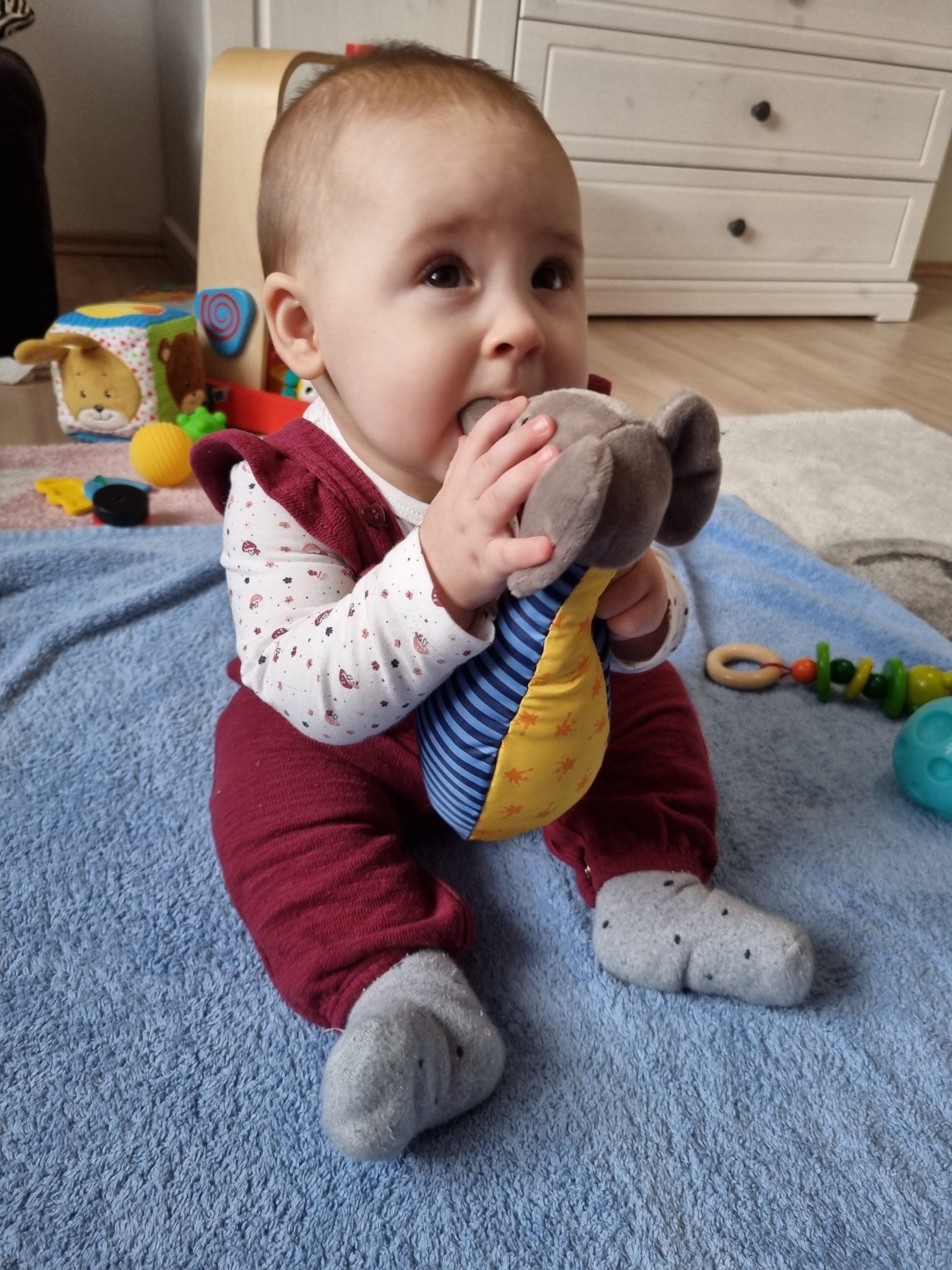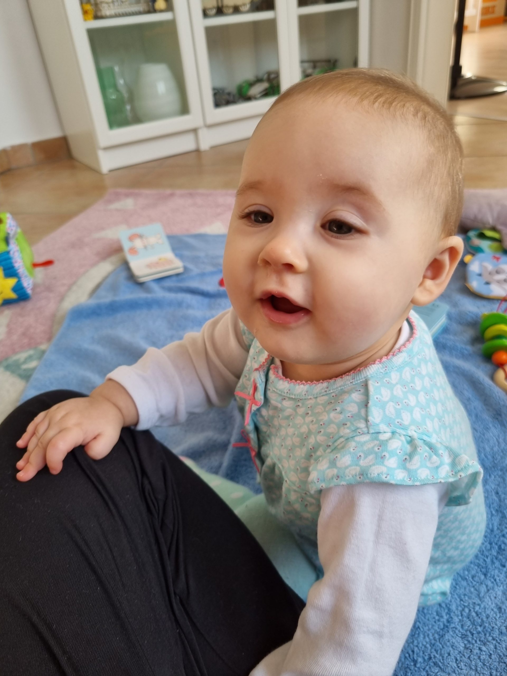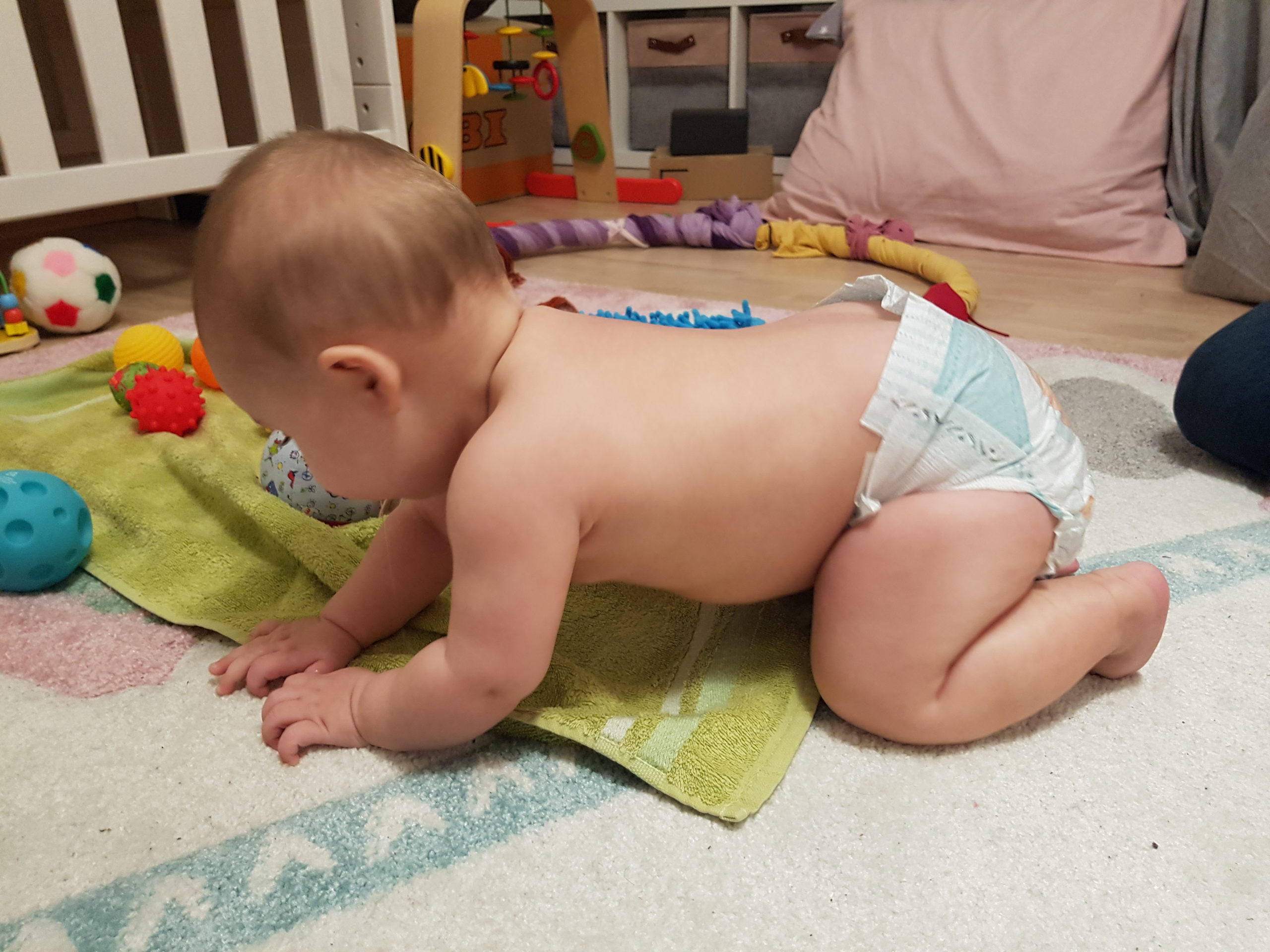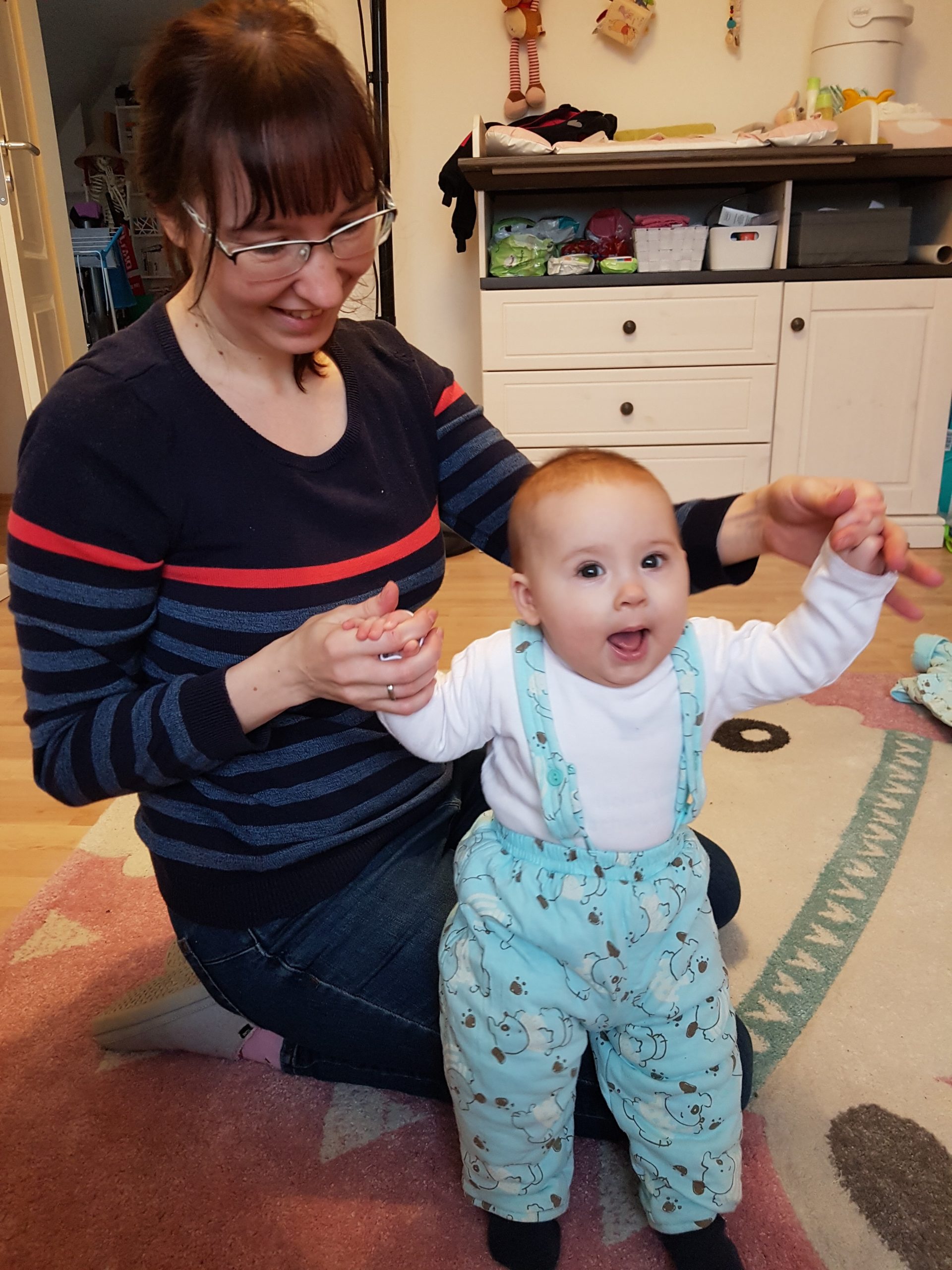 Aufsetzen kann ich mich inzwischen alleine, in den Vierfüßlerstand komme ich auch schon ohne Weiteres und es fehlt auch gar nicht mehr viel zum Robben. Dann geht es richtig ab!