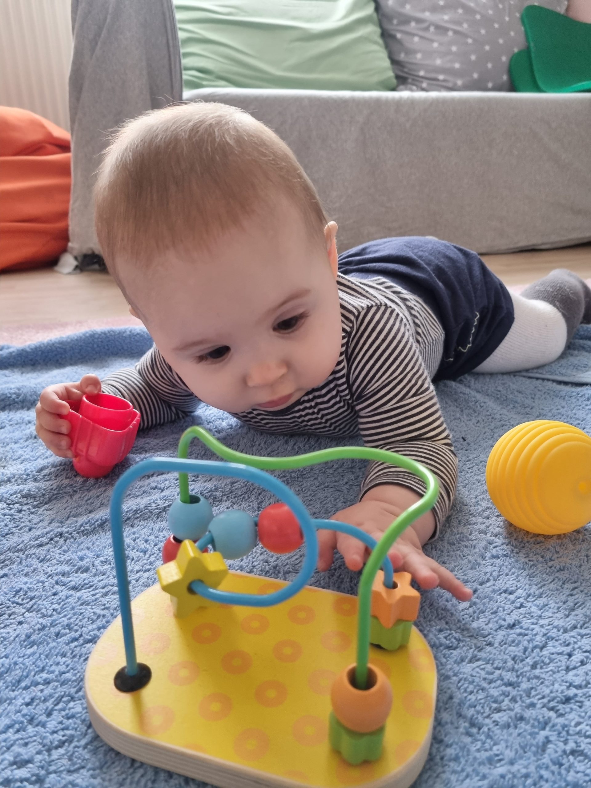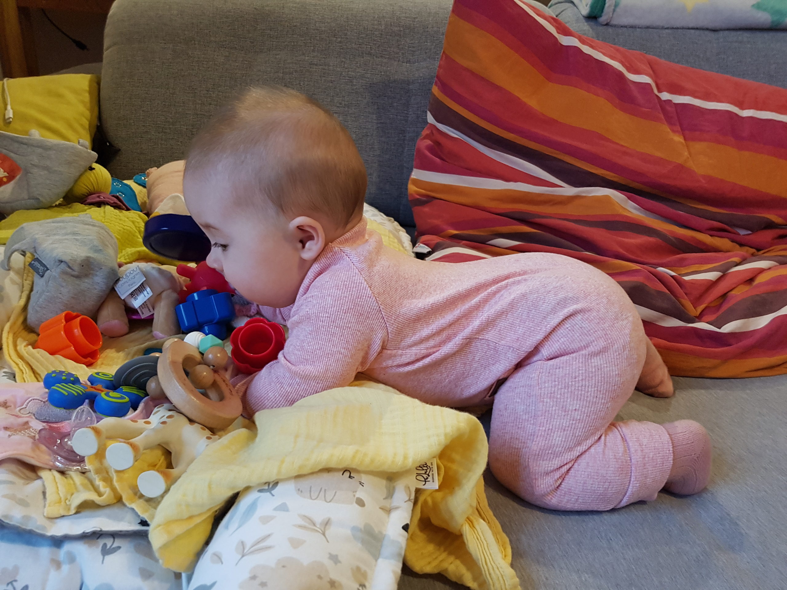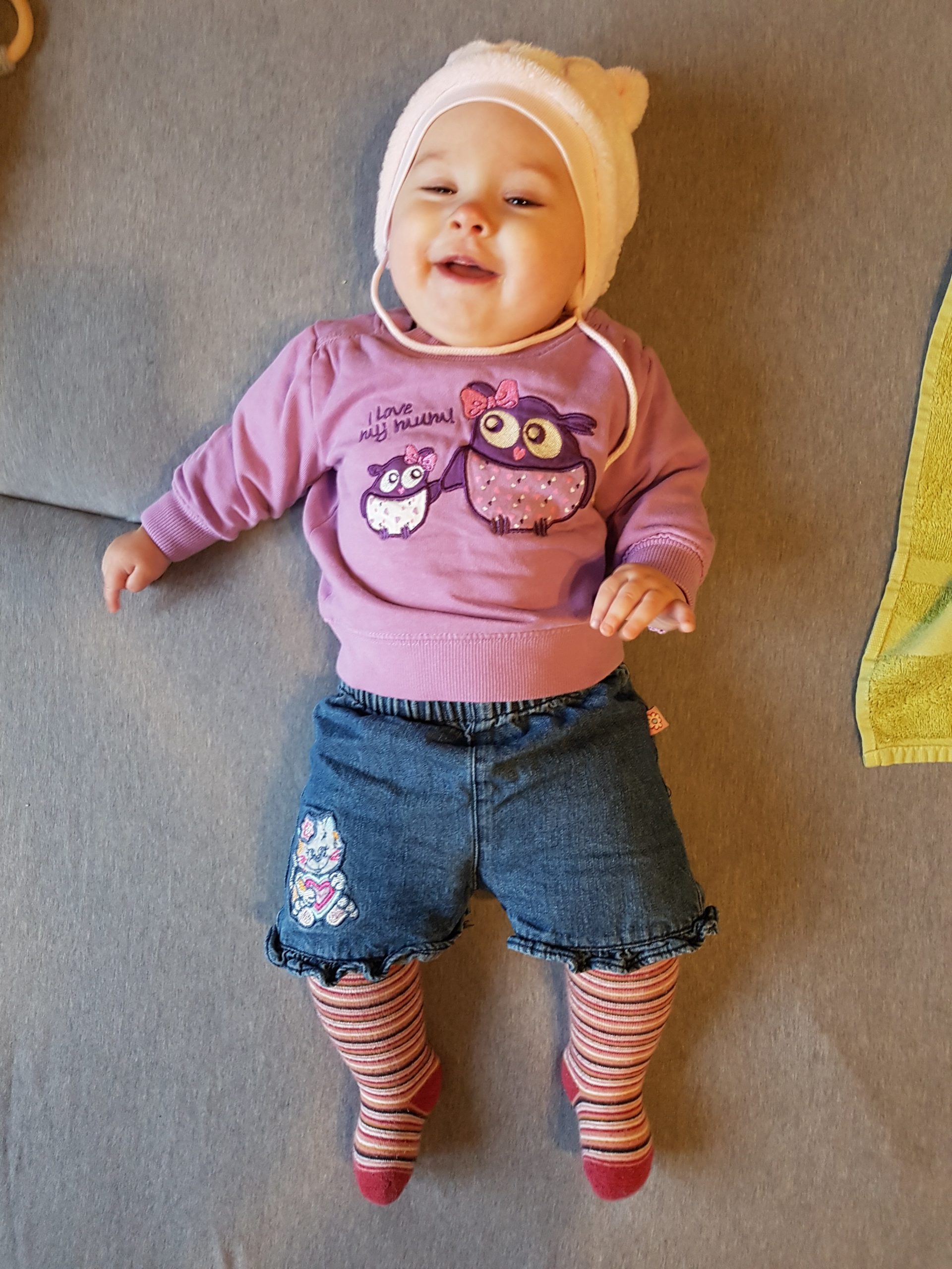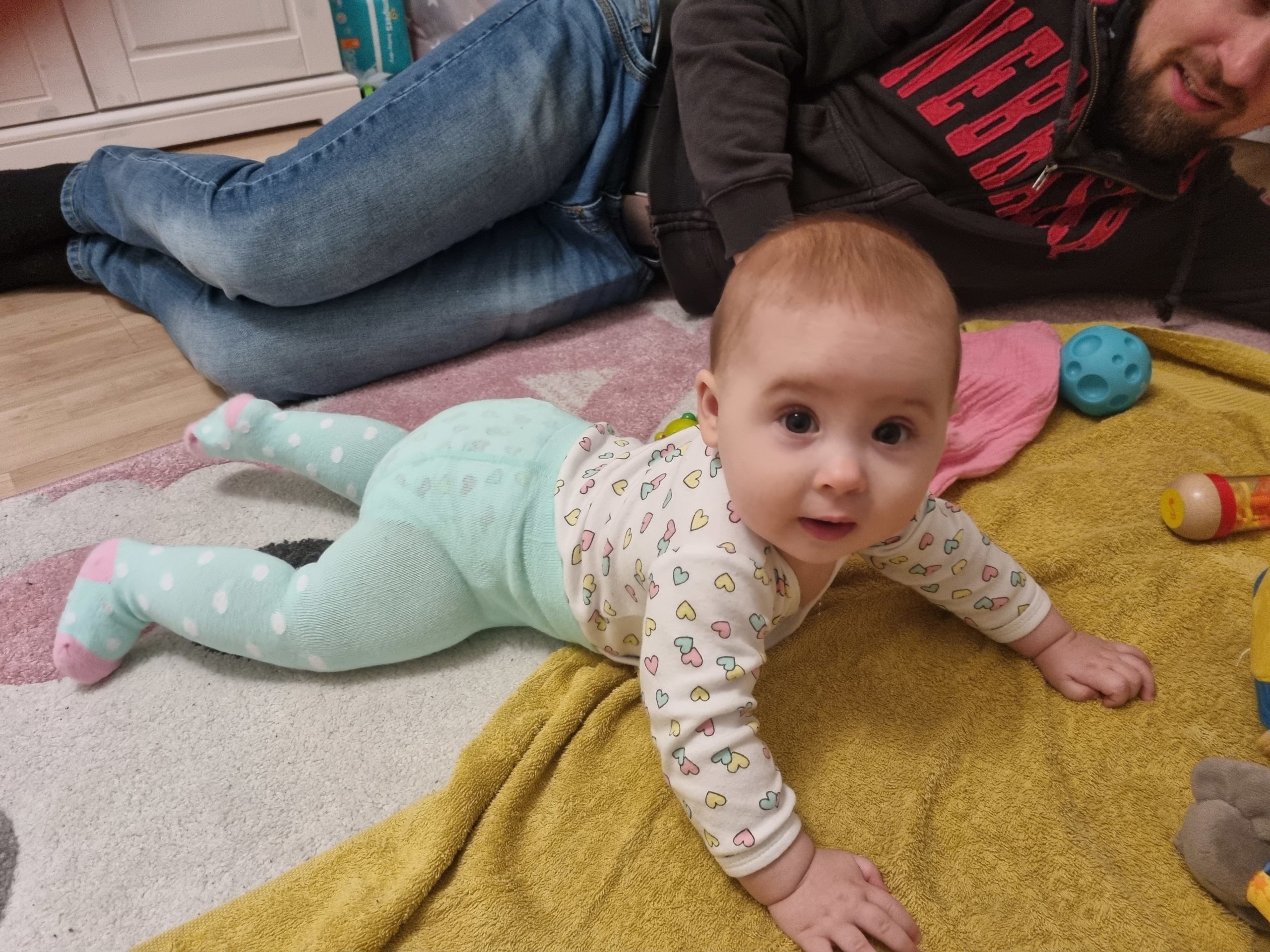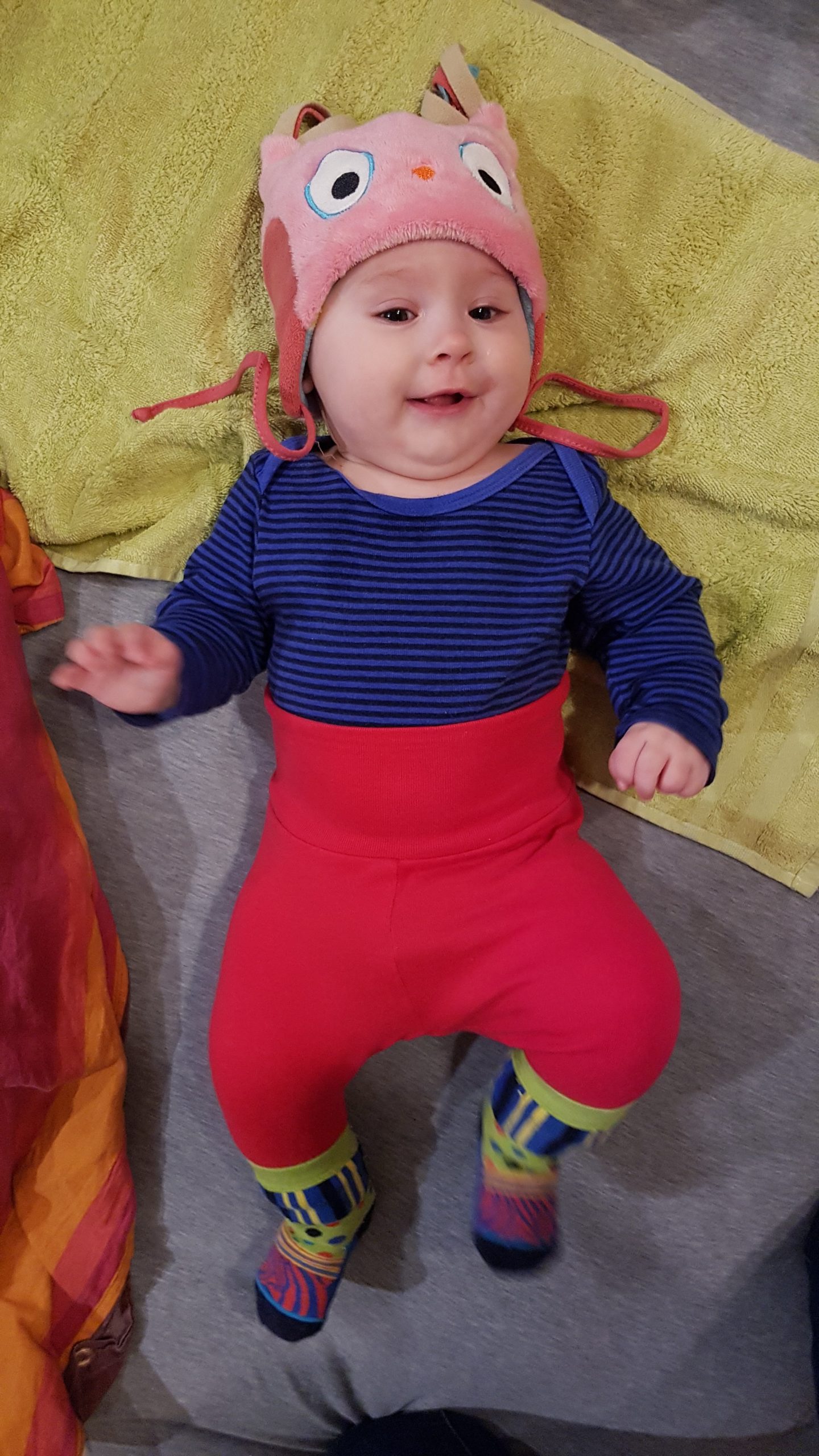 Aufsetzen kann ich mich inzwischen alleine, in den Vierfüßlerstand komme ich auch schon ohne Weiteres und es fehlt auch gar nicht mehr viel zum Robben. Dann geht es richtig ab!
