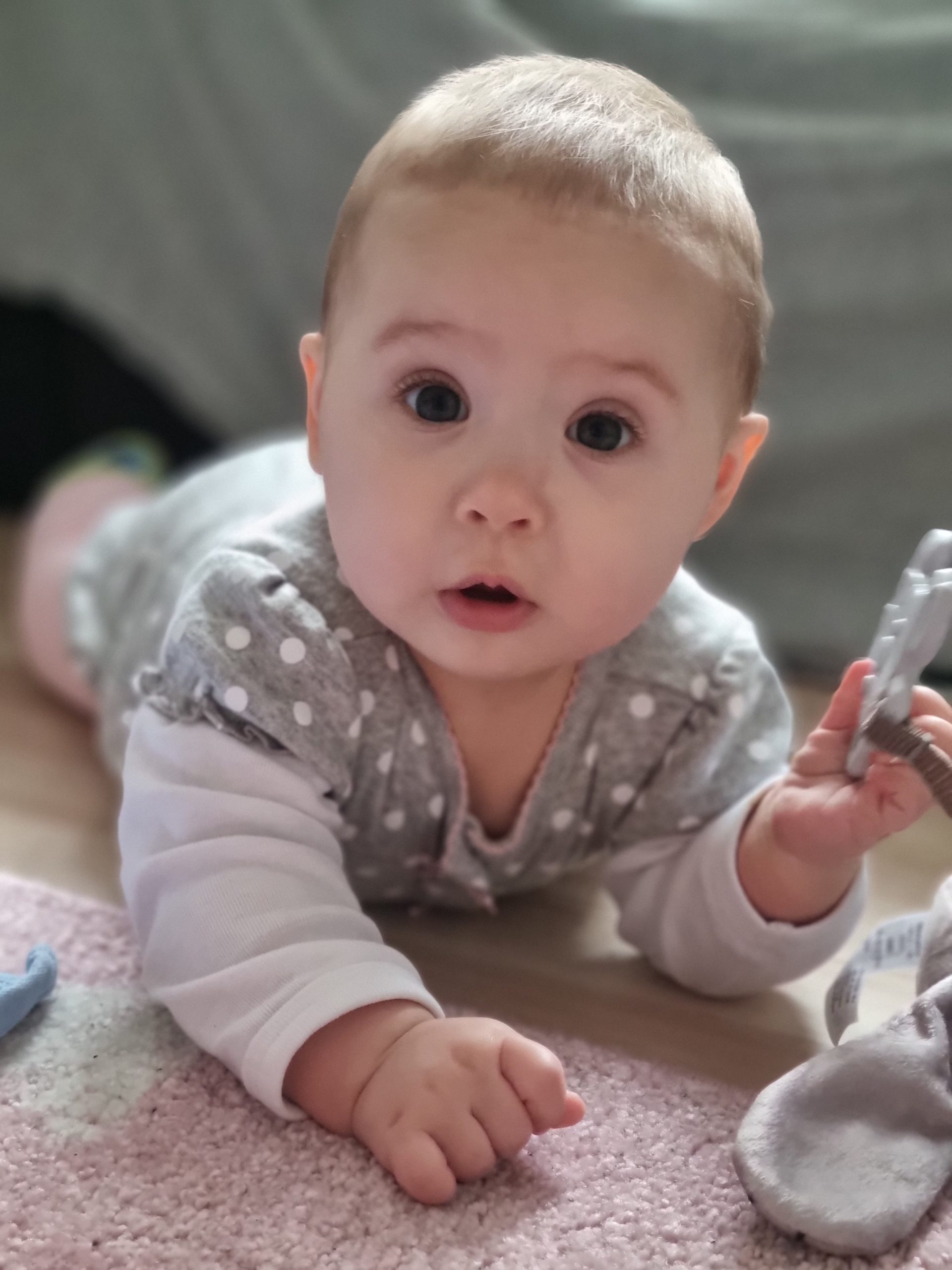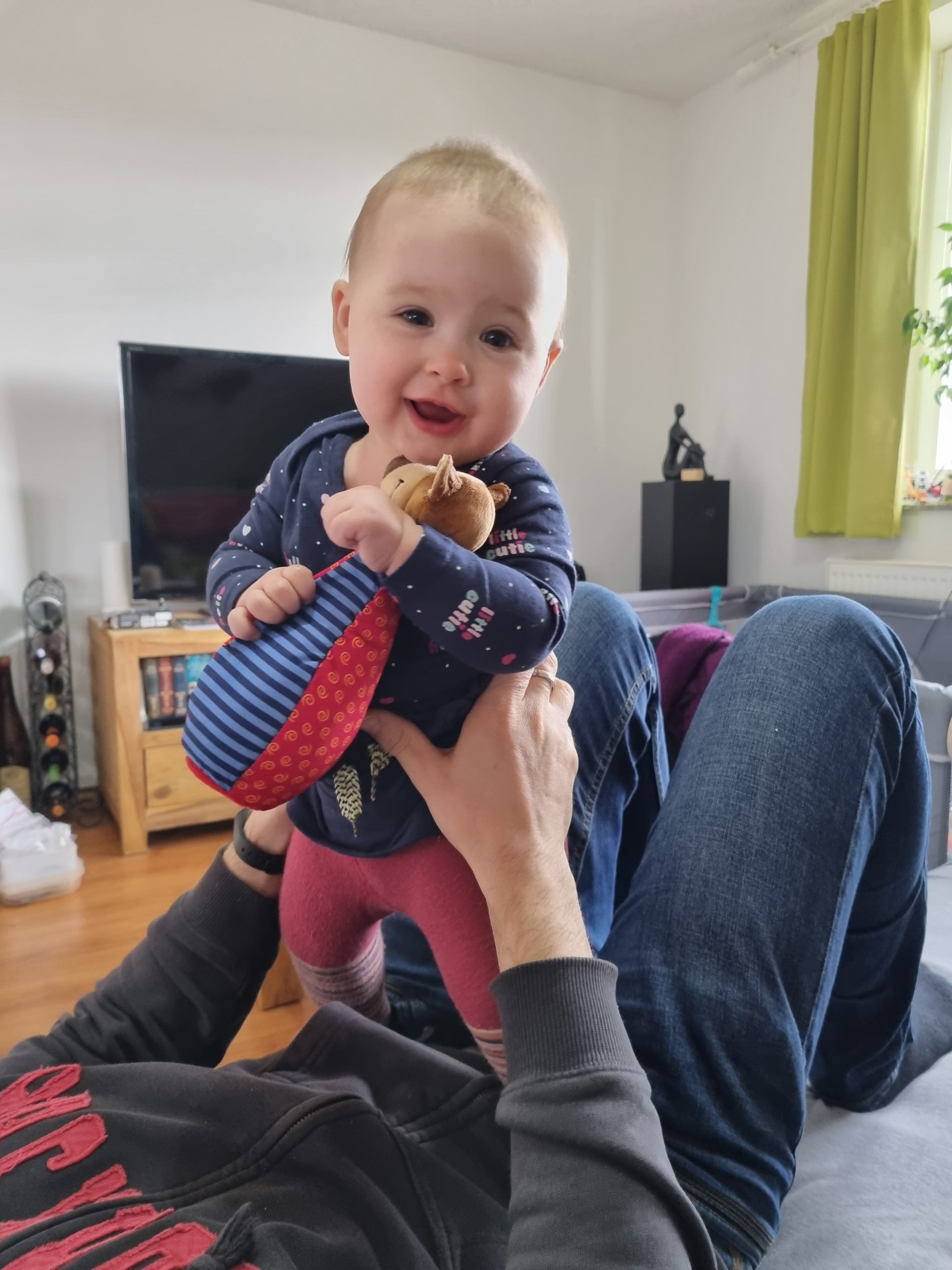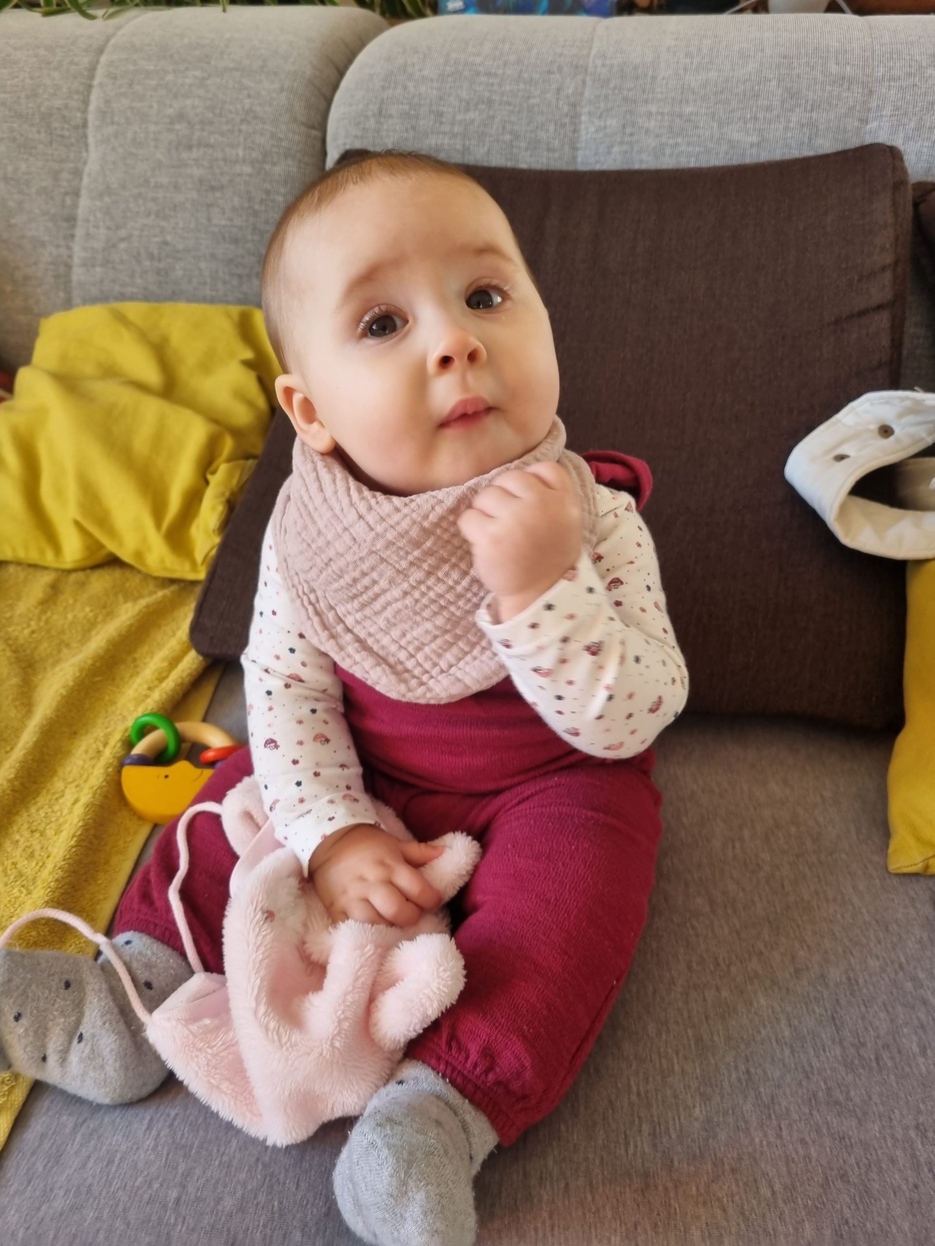 Diesen Monat habe ich das ordentliche Krabbeln gelernt und fleißig meinen Pinzettengriff geübt. Ich verstehe immer mehr Worte und kann mich auch schon ein bisschen mitteilen.