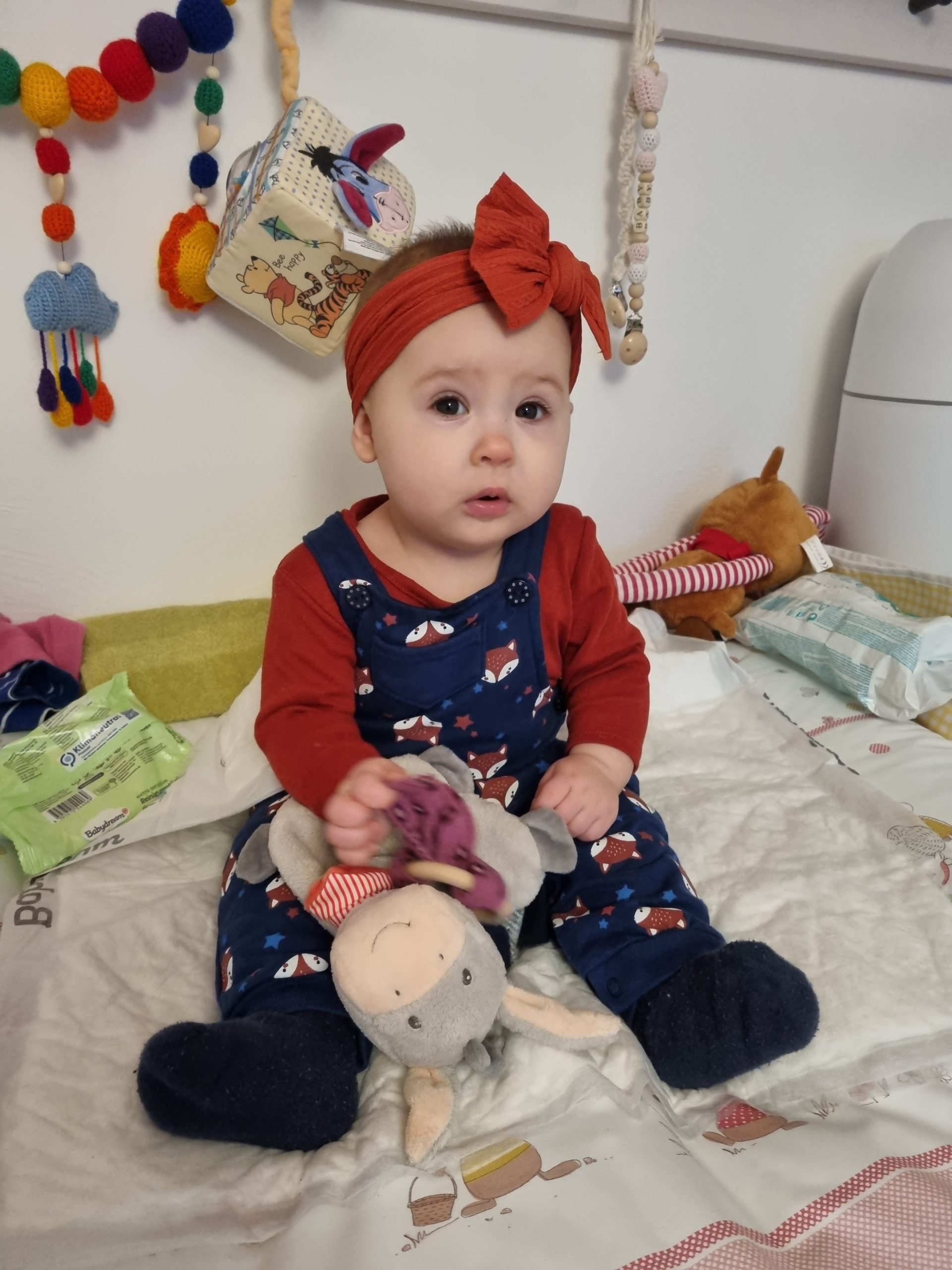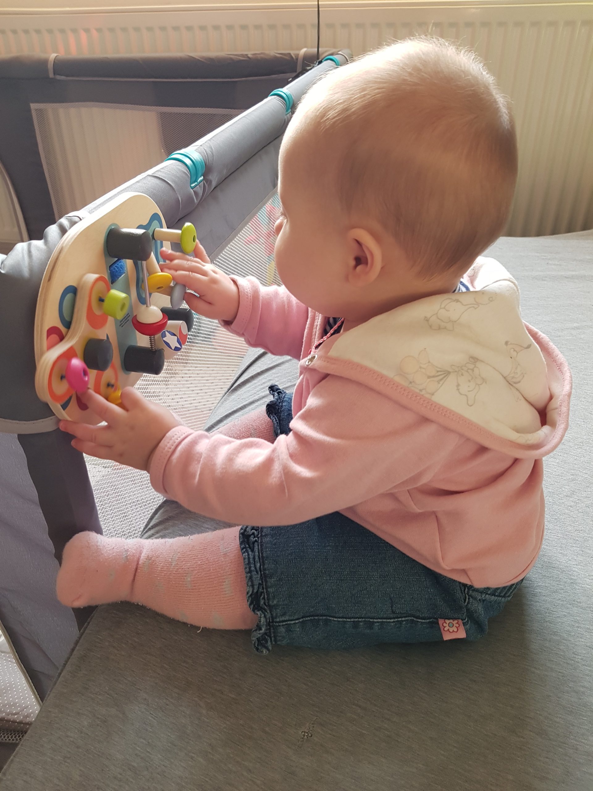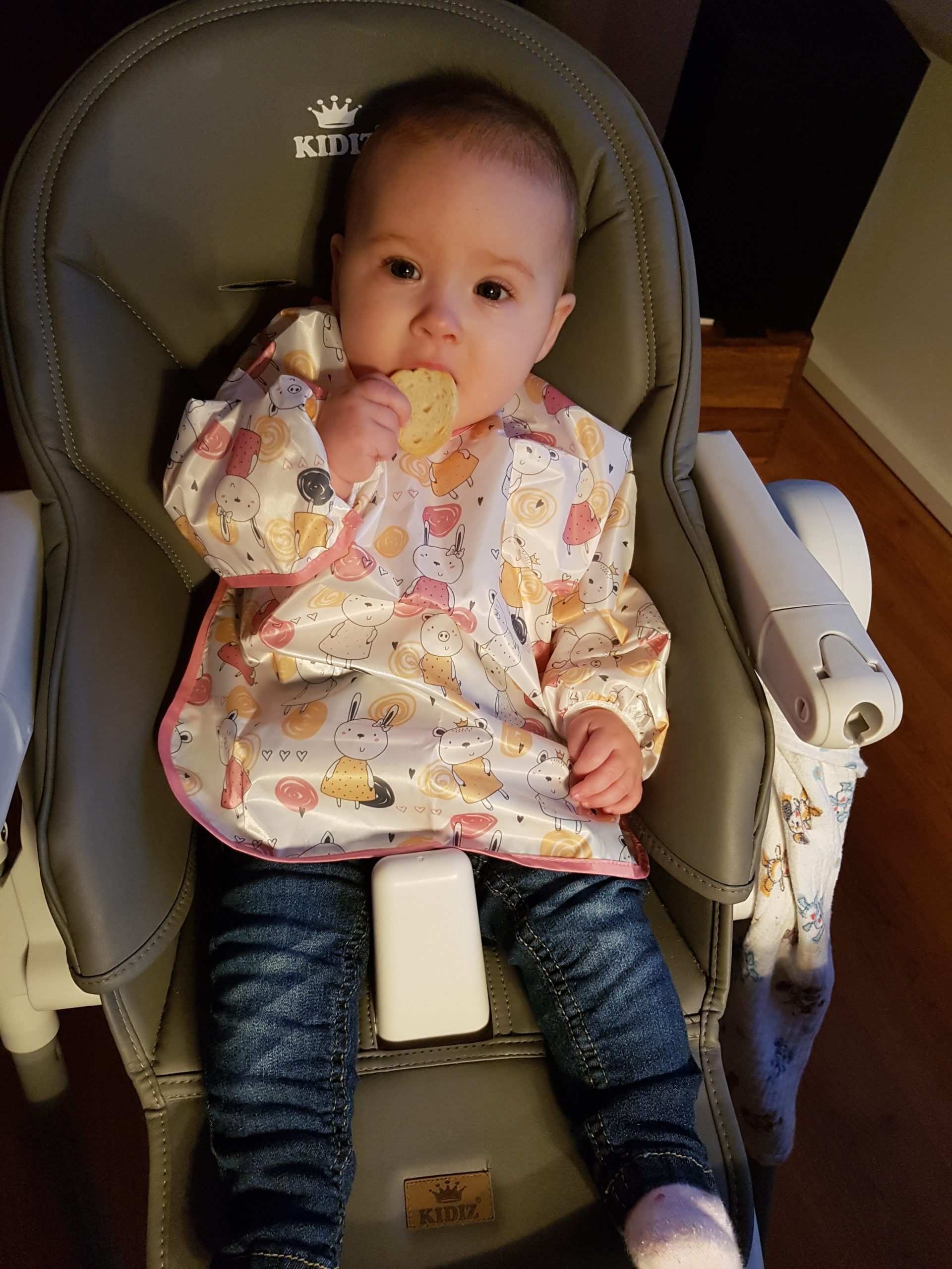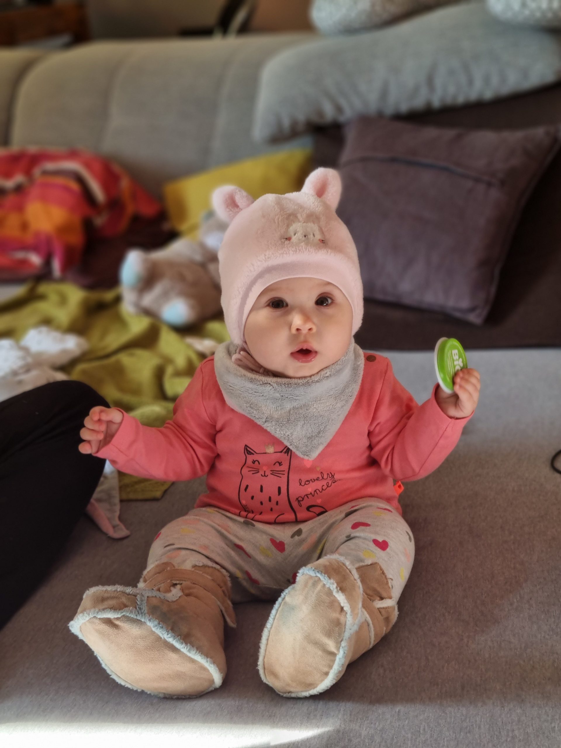 Diesen Monat habe ich das ordentliche Krabbeln gelernt und fleißig meinen Pinzettengriff geübt. Ich verstehe immer mehr Worte und kann mich auch schon ein bisschen mitteilen.