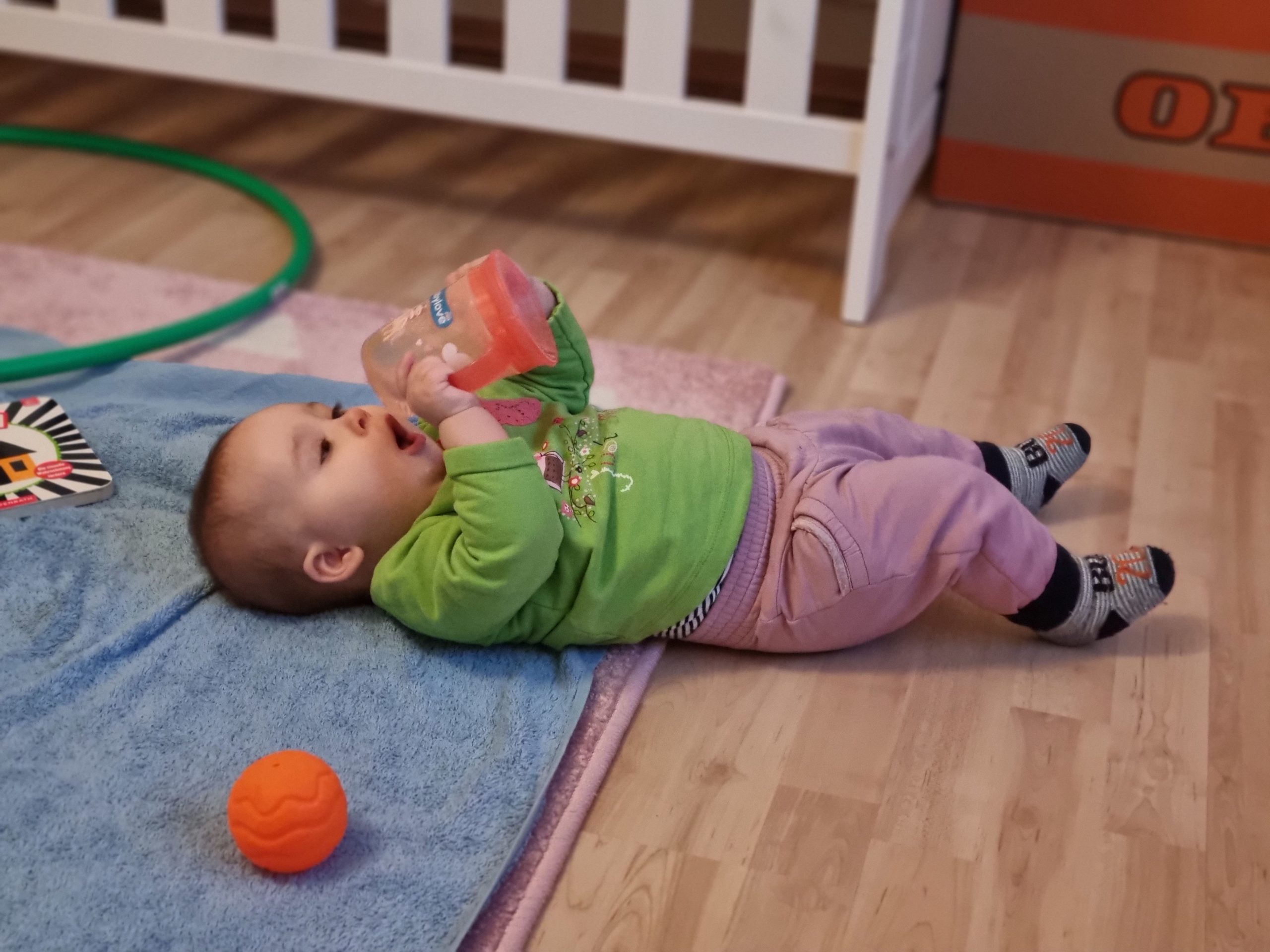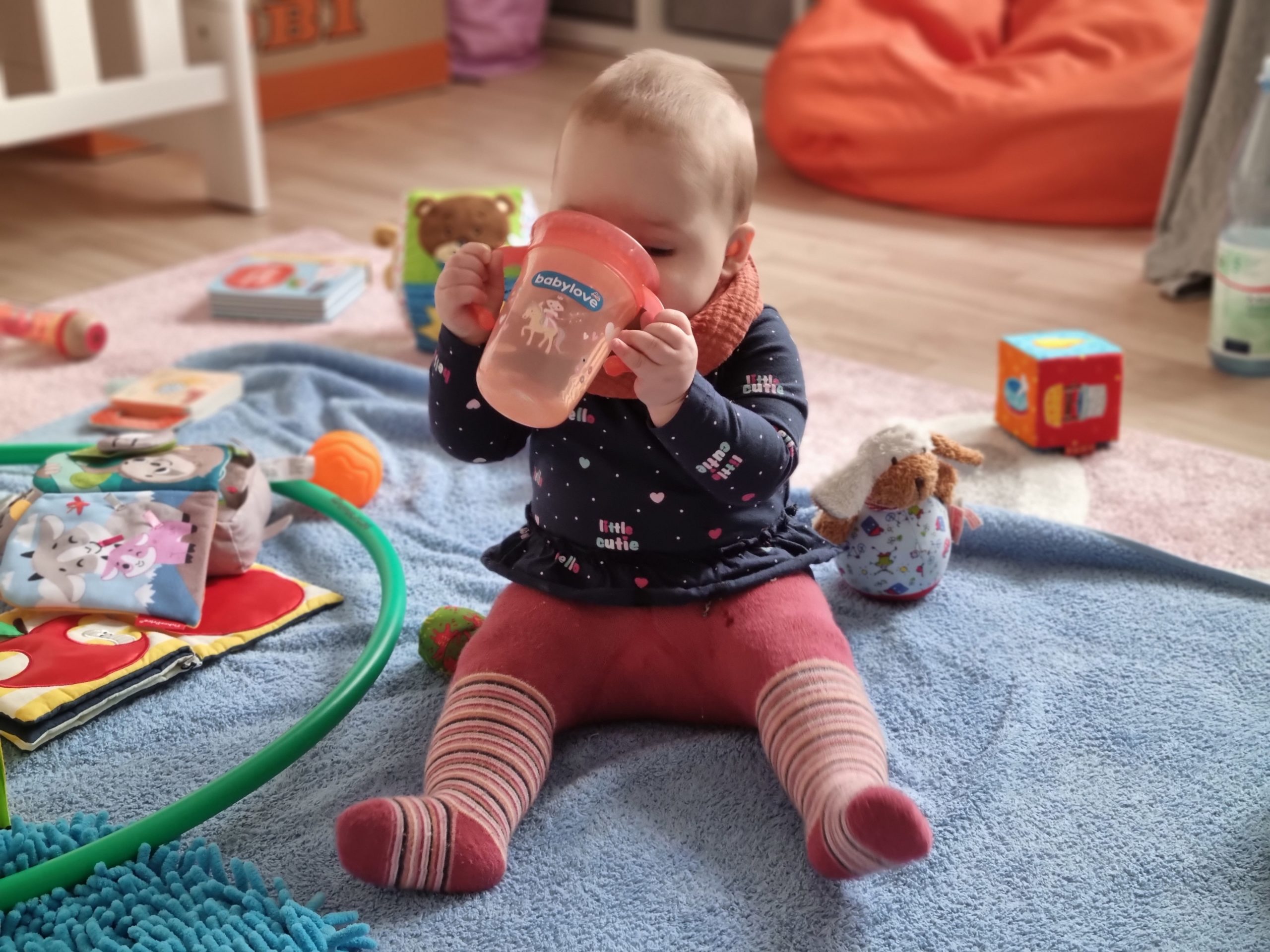 Außerdem kann ich nun schon alleine aus dem Becher trinken, – mal mehr und mal weniger gut.