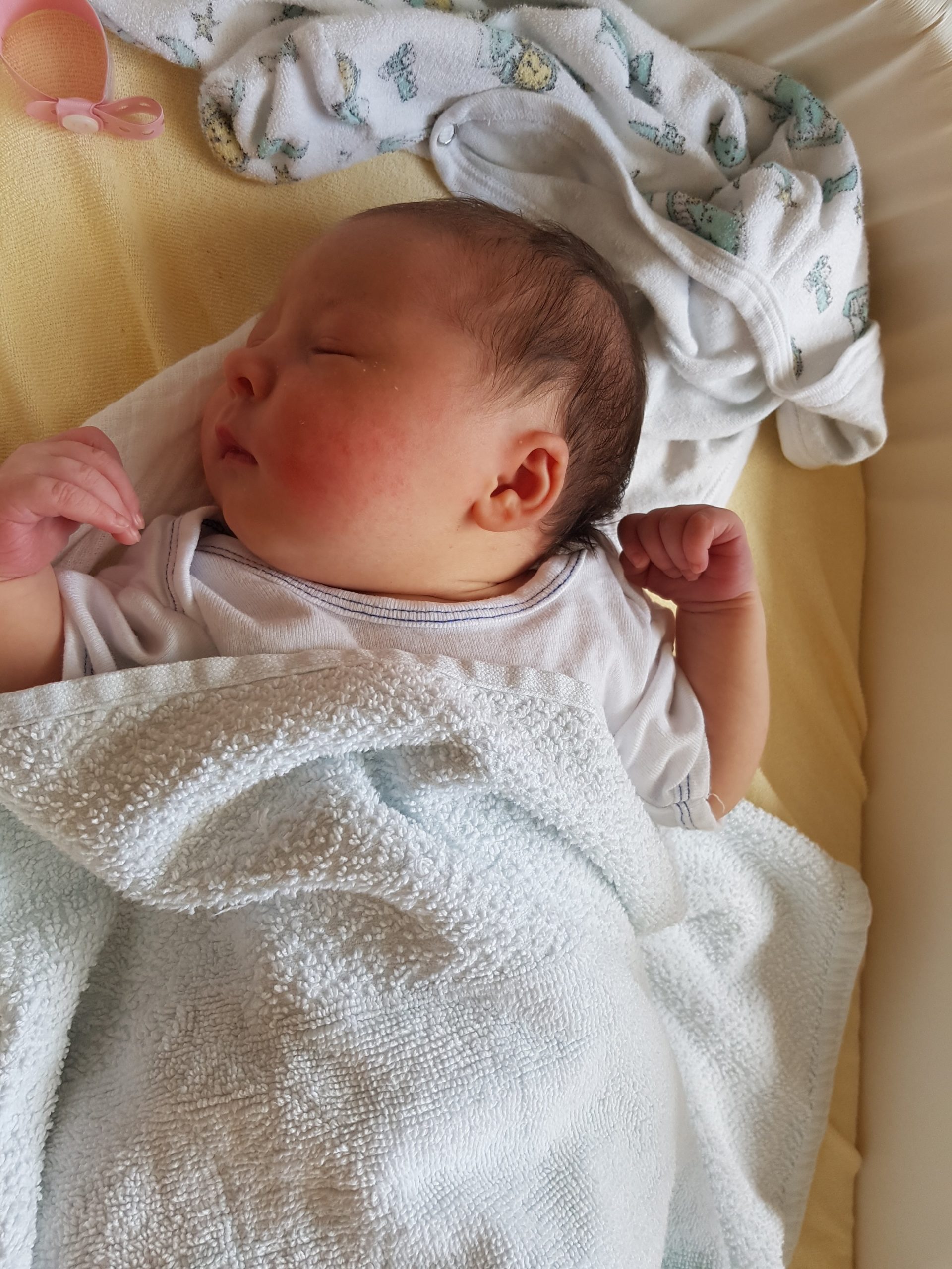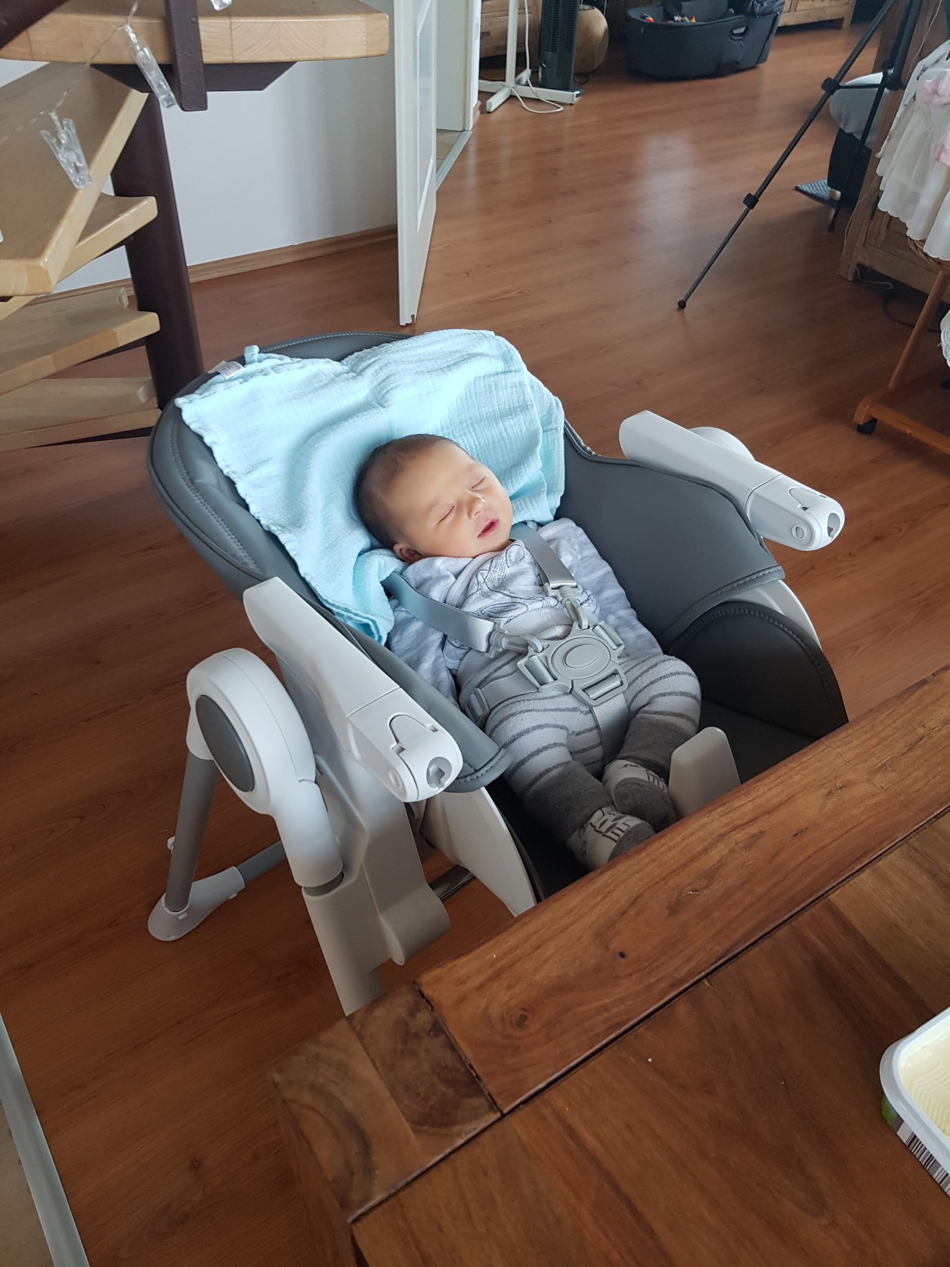 Heute Morgen durfte ich das erste Mal mit am Frühstückstisch sitzen. Ich bin mir nicht ganz sicher, was Mama und Papa dort immer treiben – ich für meinen Teil habe erst einmal ein großes Geschäft in meine Windel gemacht. Da Mama und Papa anschließend total glücklich waren, denke ich, dass der Frühstückstisch der richtige Ort dafür ist.