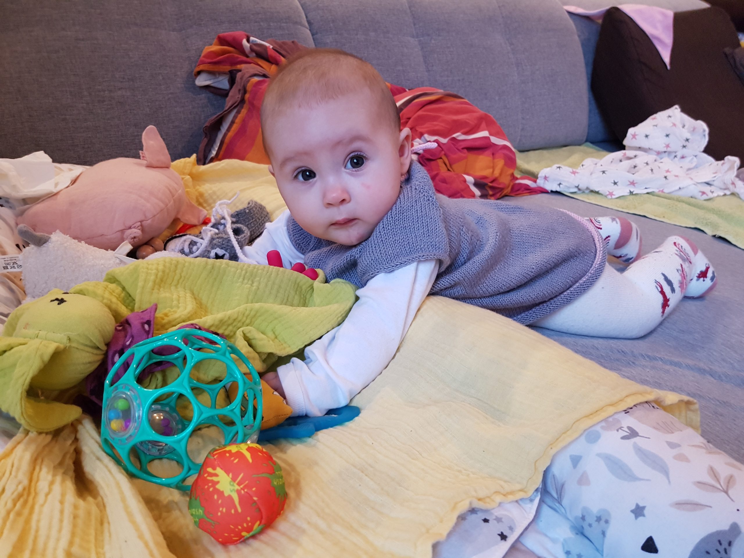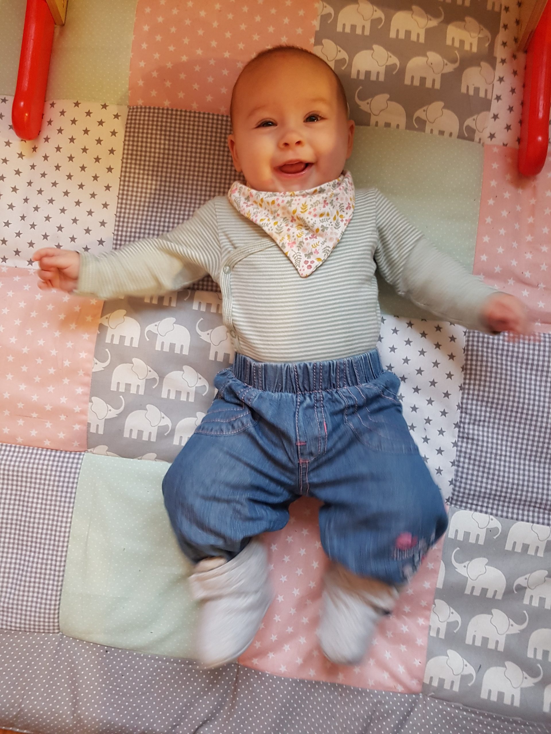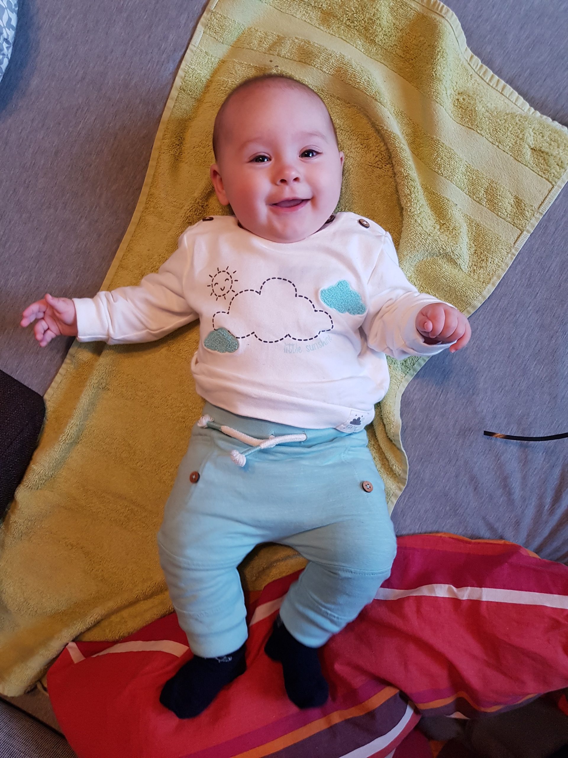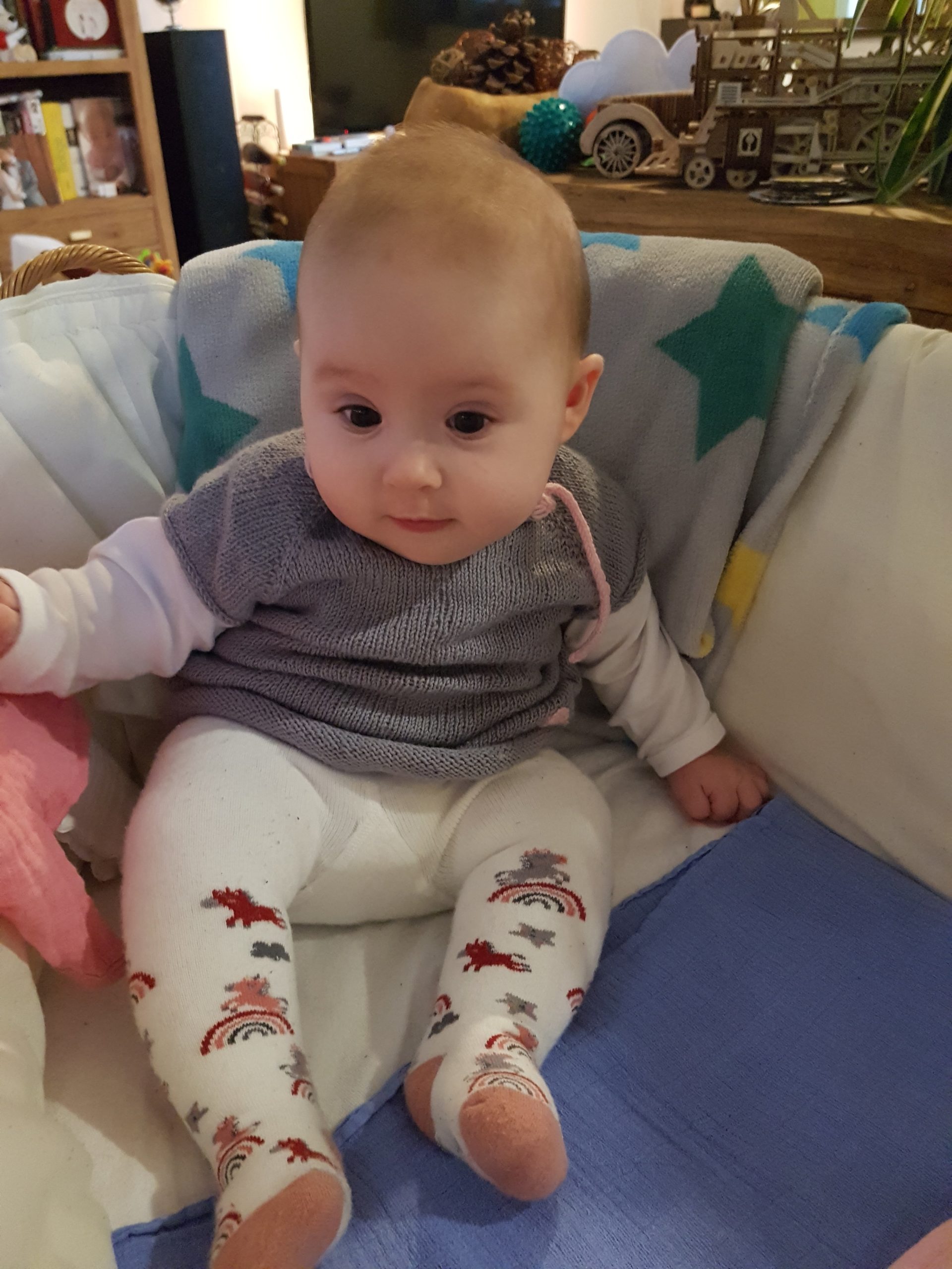 Ich bin jetzt knapp 65 cm groß und wiege 7250 g. Am liebsten mache ich derzeit Spuckebläschen und rudere mit den Armen. Außerdem übe ich weiterhin fleißig das Drehen und Aufsetzen. Liegen ist schließlich nur was für Babies…