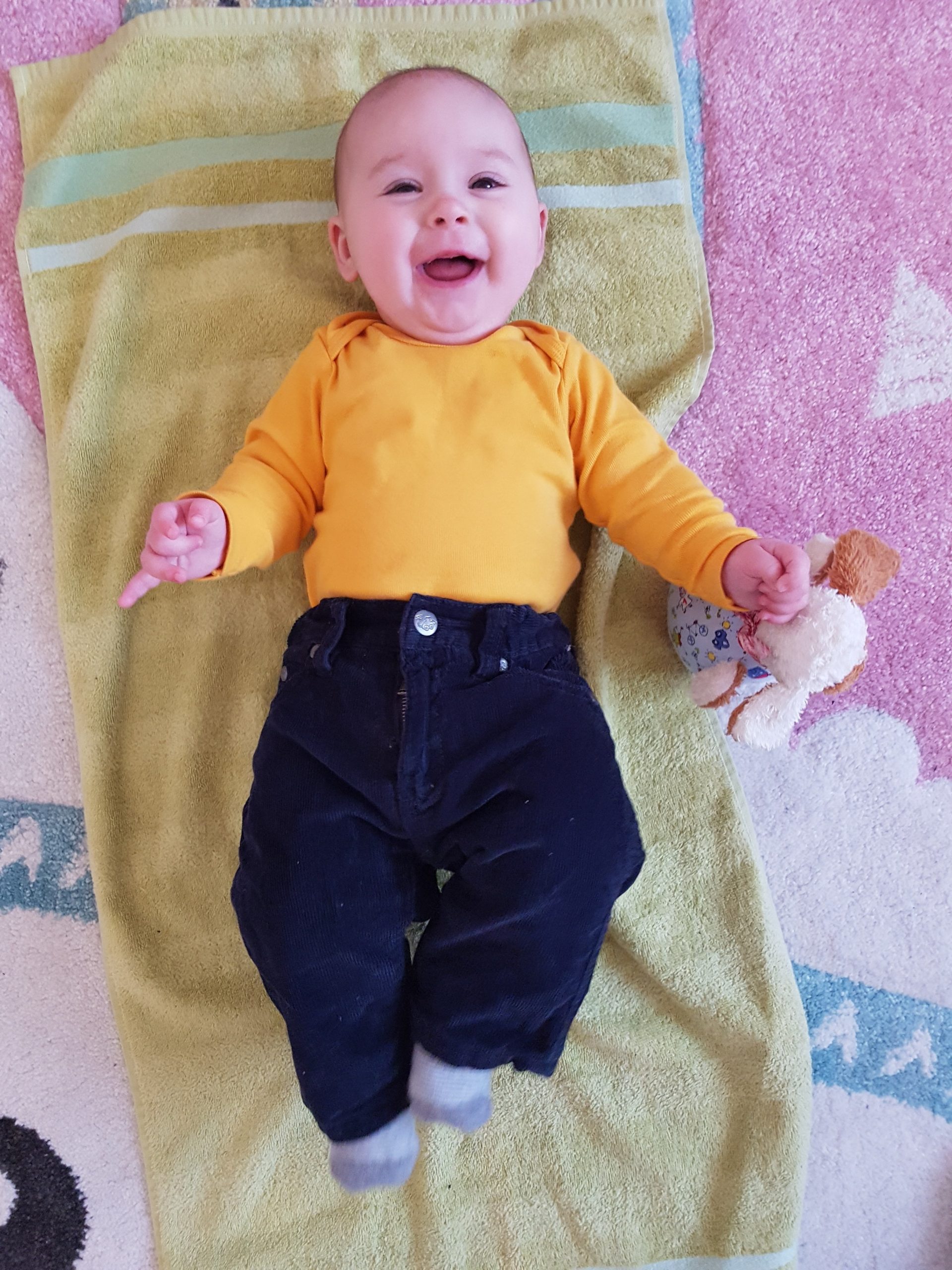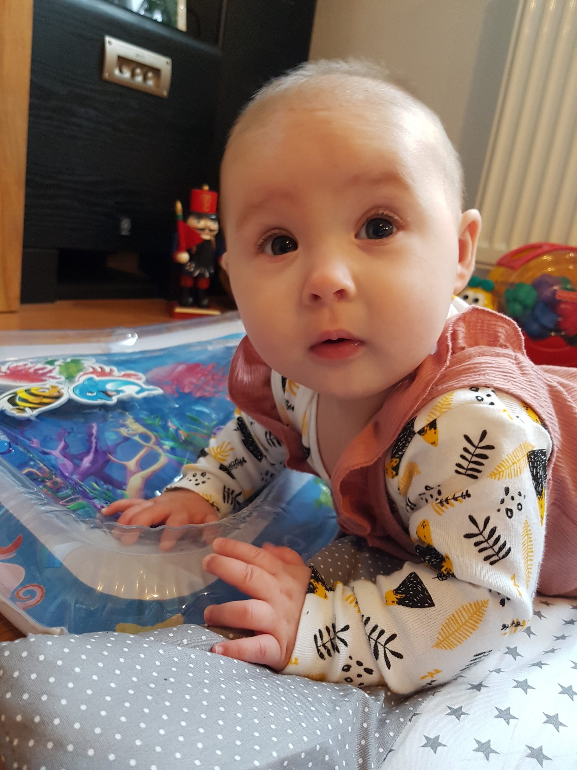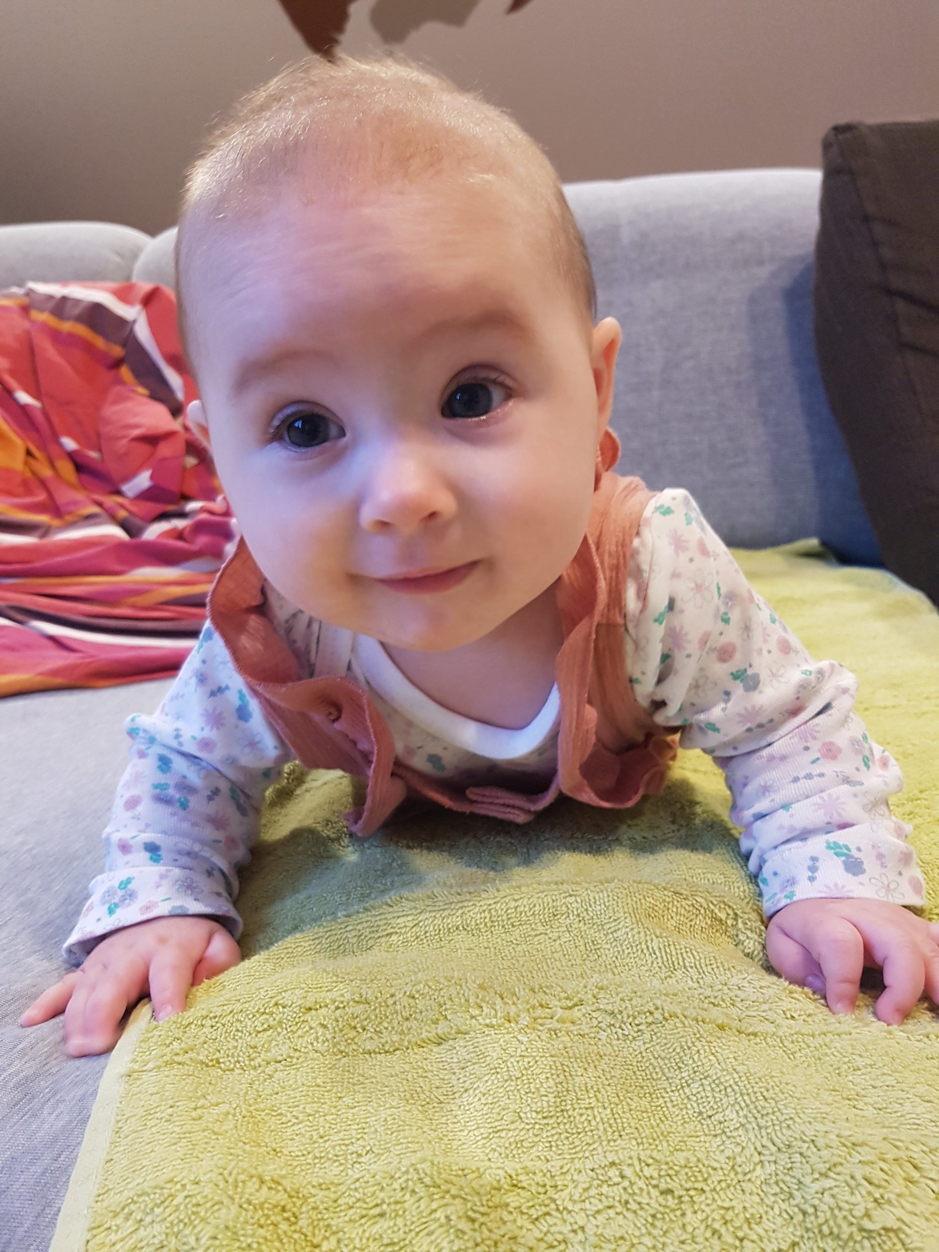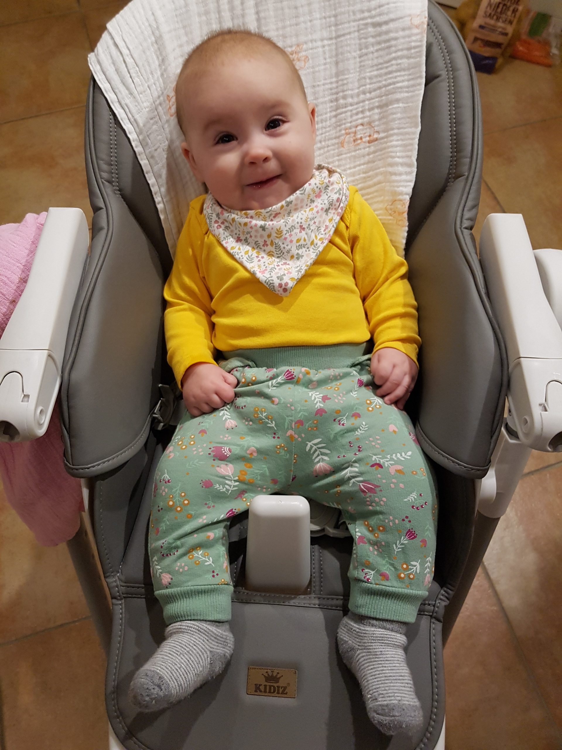 Ich bin jetzt knapp 65 cm groß und wiege 7250 g. Am liebsten mache ich derzeit Spuckebläschen und rudere mit den Armen. Außerdem übe ich weiterhin fleißig das Drehen und Aufsetzen. Liegen ist schließlich nur was für Babies…