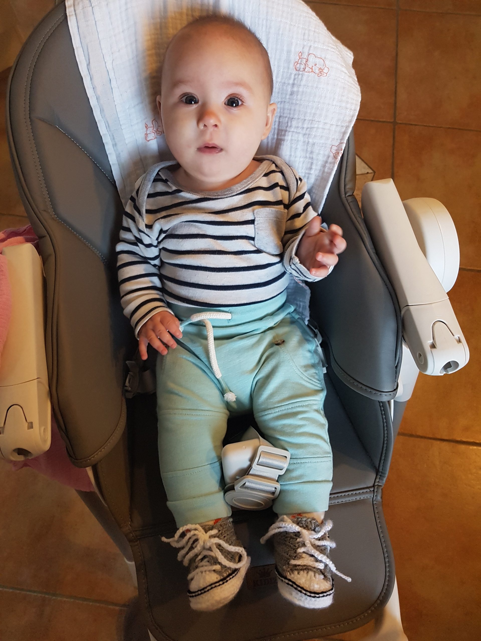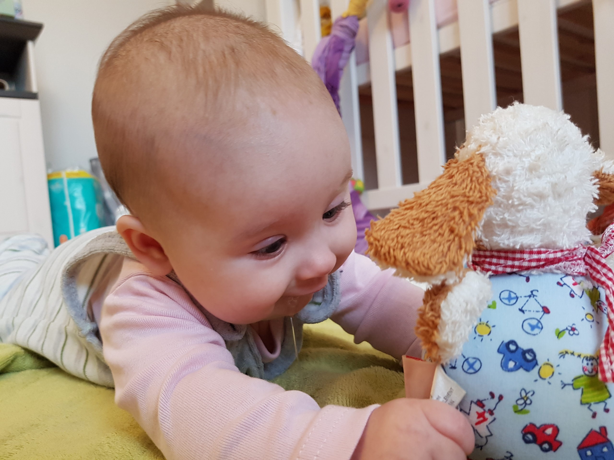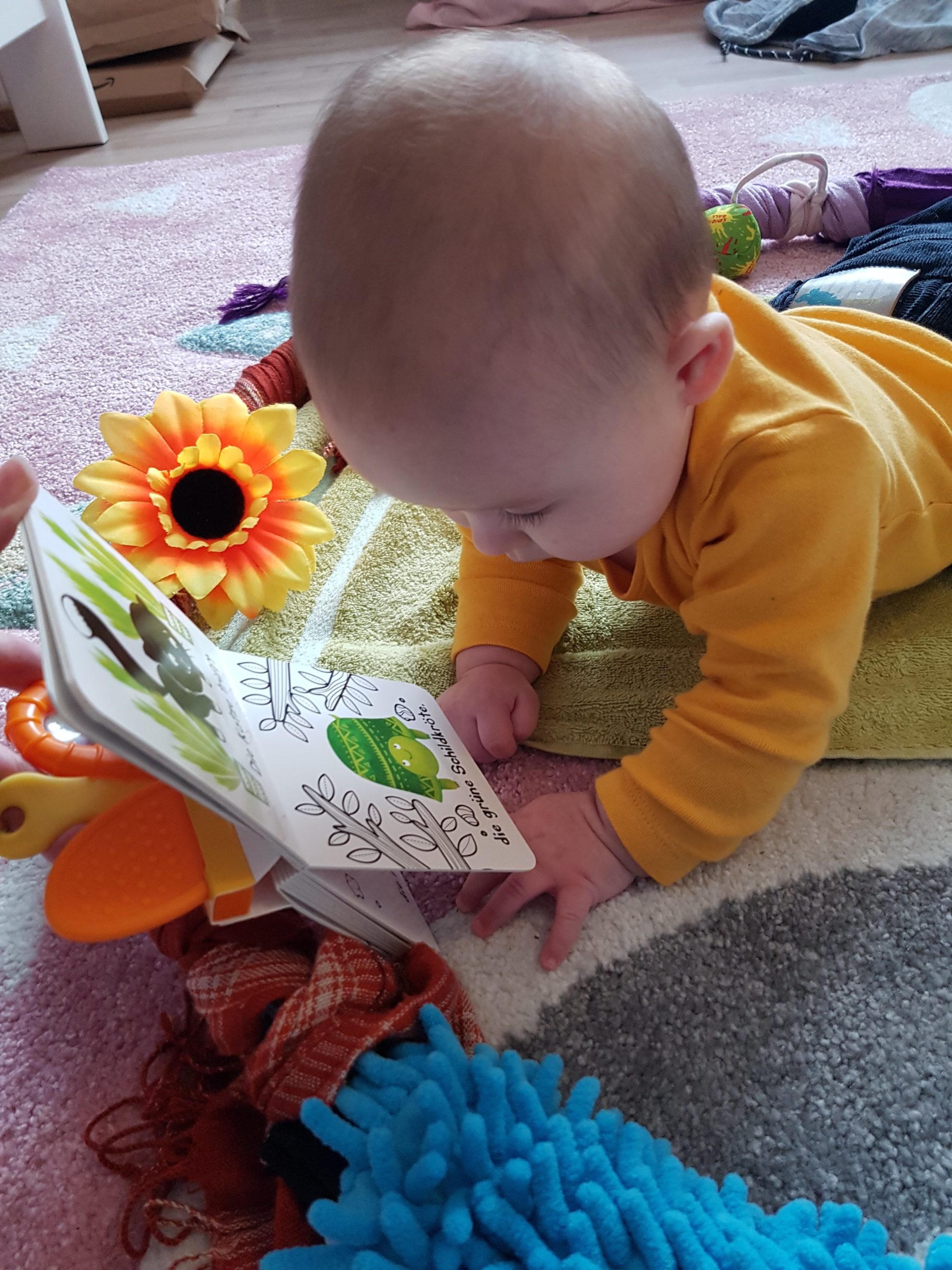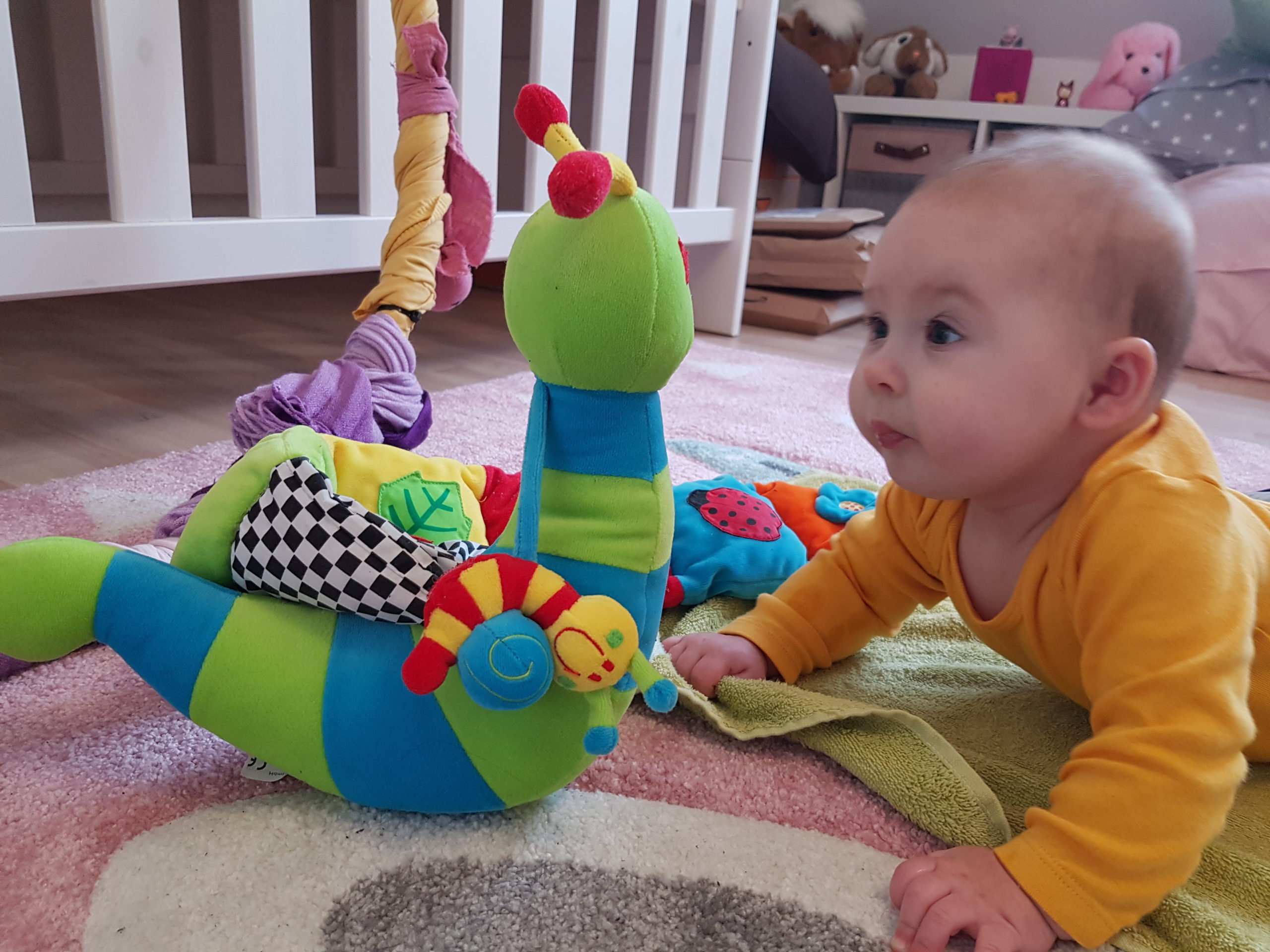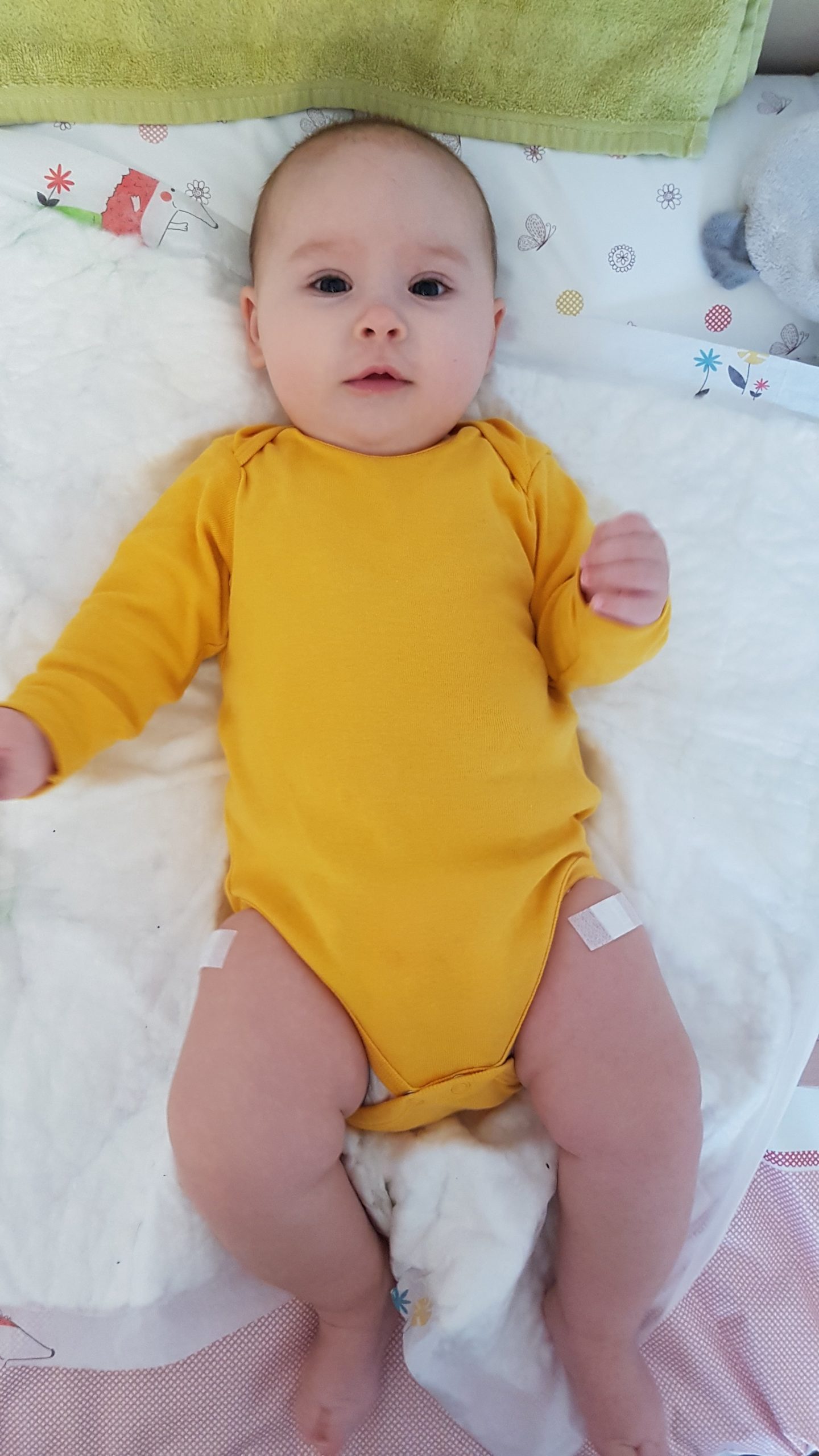 Ich bin jetzt knapp 65 cm groß und wiege 7250 g. Am liebsten mache ich derzeit Spuckebläschen und rudere mit den Armen. Außerdem übe ich weiterhin fleißig das Drehen und Aufsetzen. Liegen ist schließlich nur was für Babies…