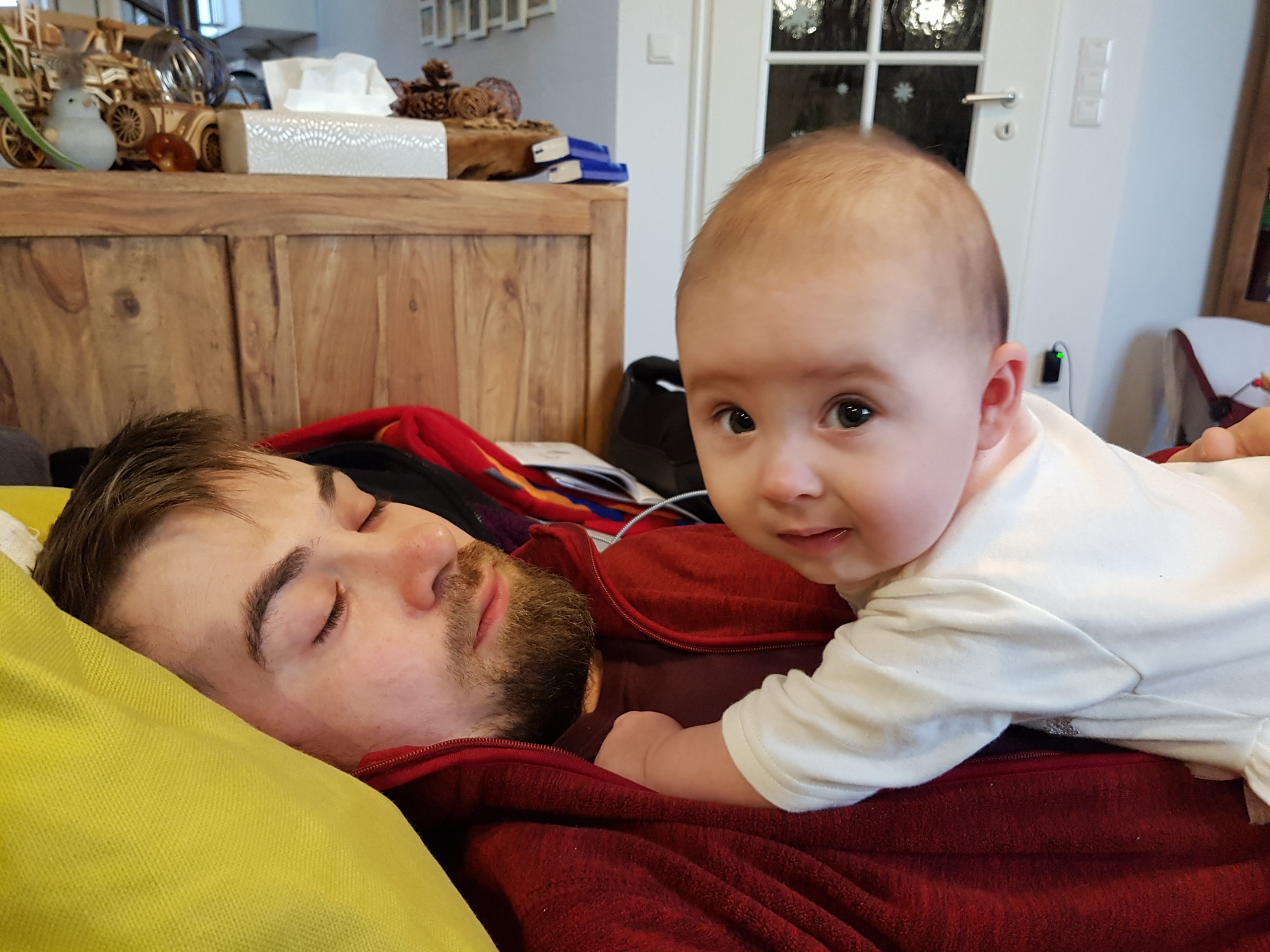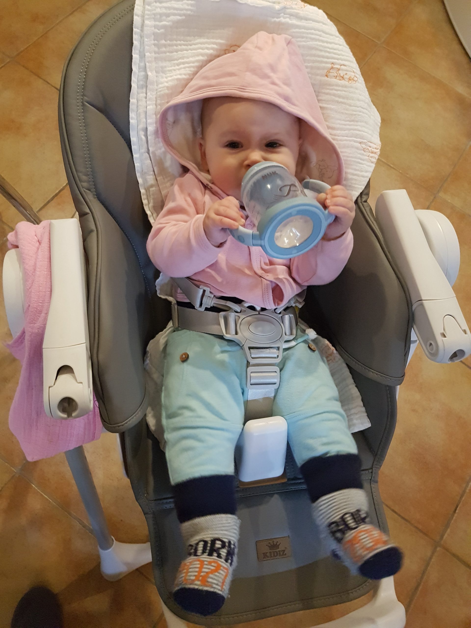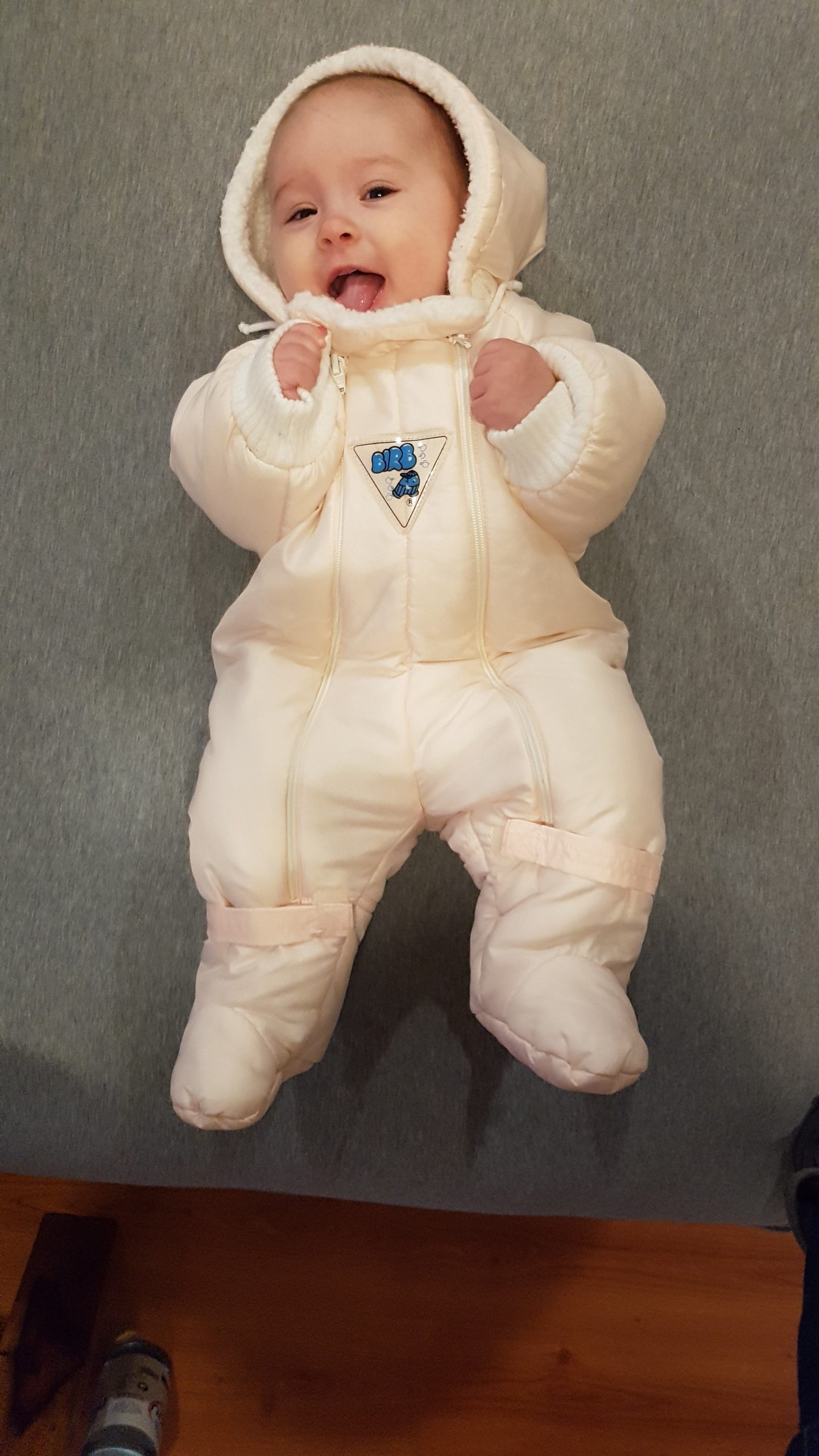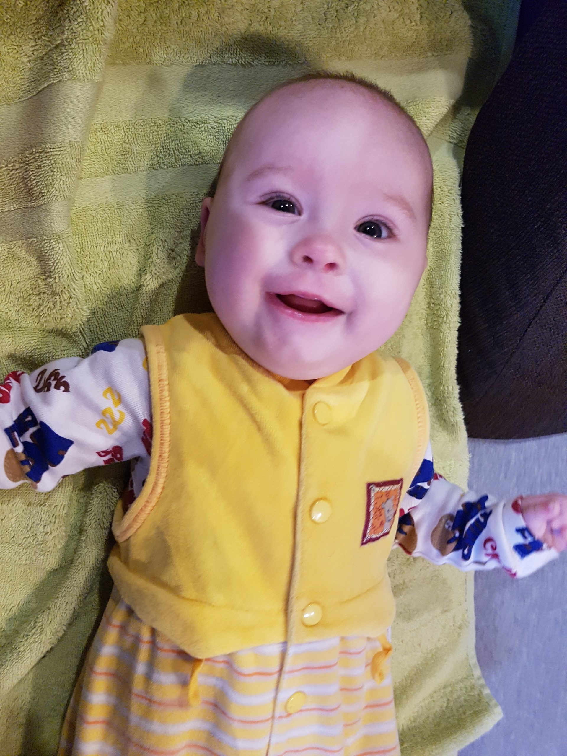 Ich bin jetzt knapp 65 cm groß und wiege 7250 g. Am liebsten mache ich derzeit Spuckebläschen und rudere mit den Armen. Außerdem übe ich weiterhin fleißig das Drehen und Aufsetzen. Liegen ist schließlich nur was für Babies…