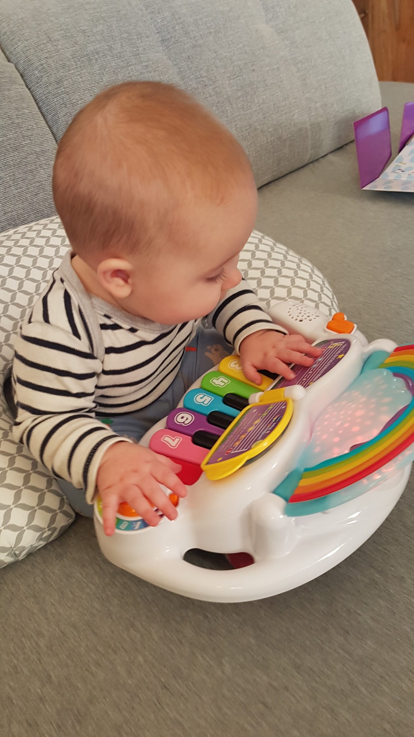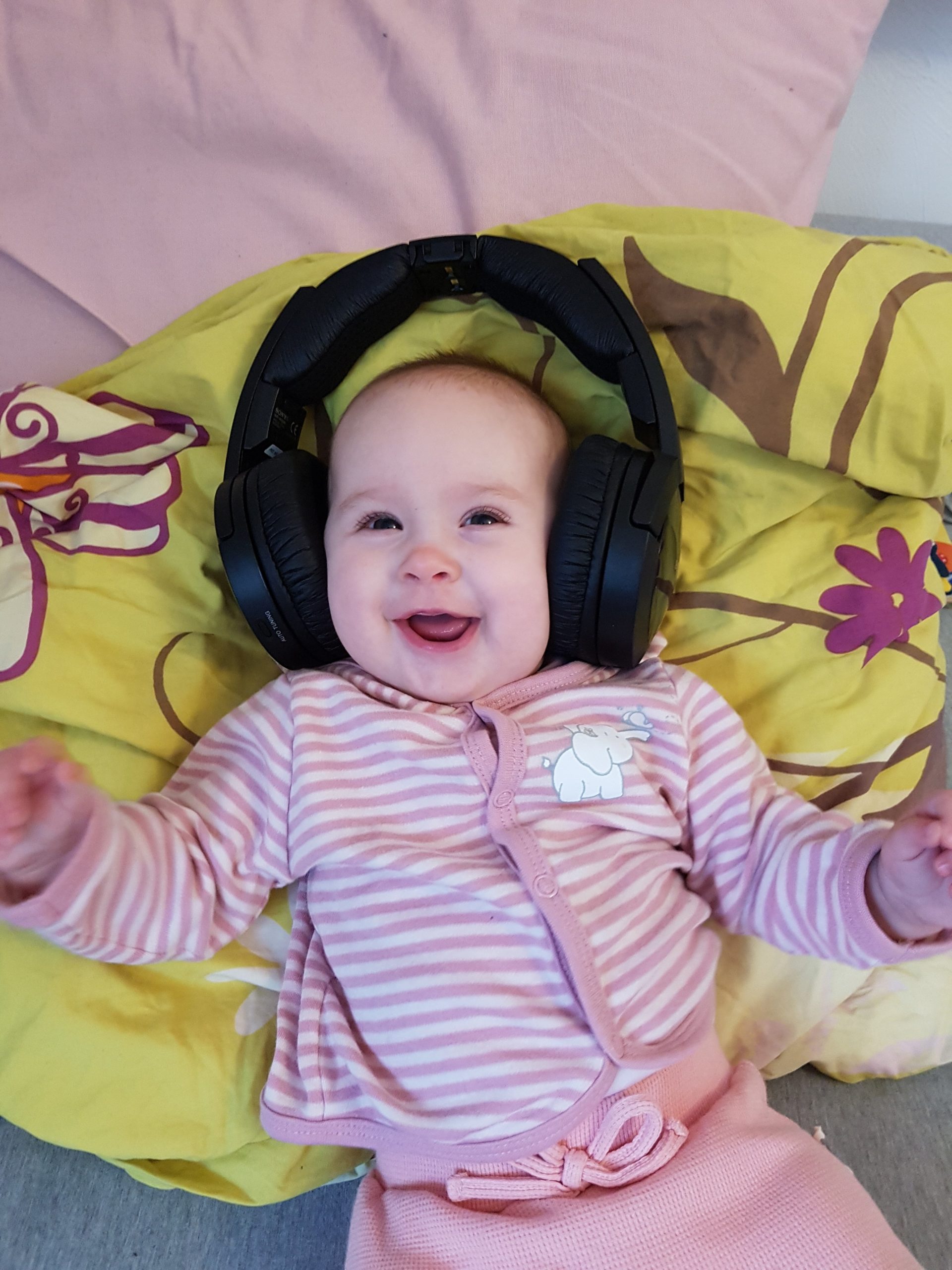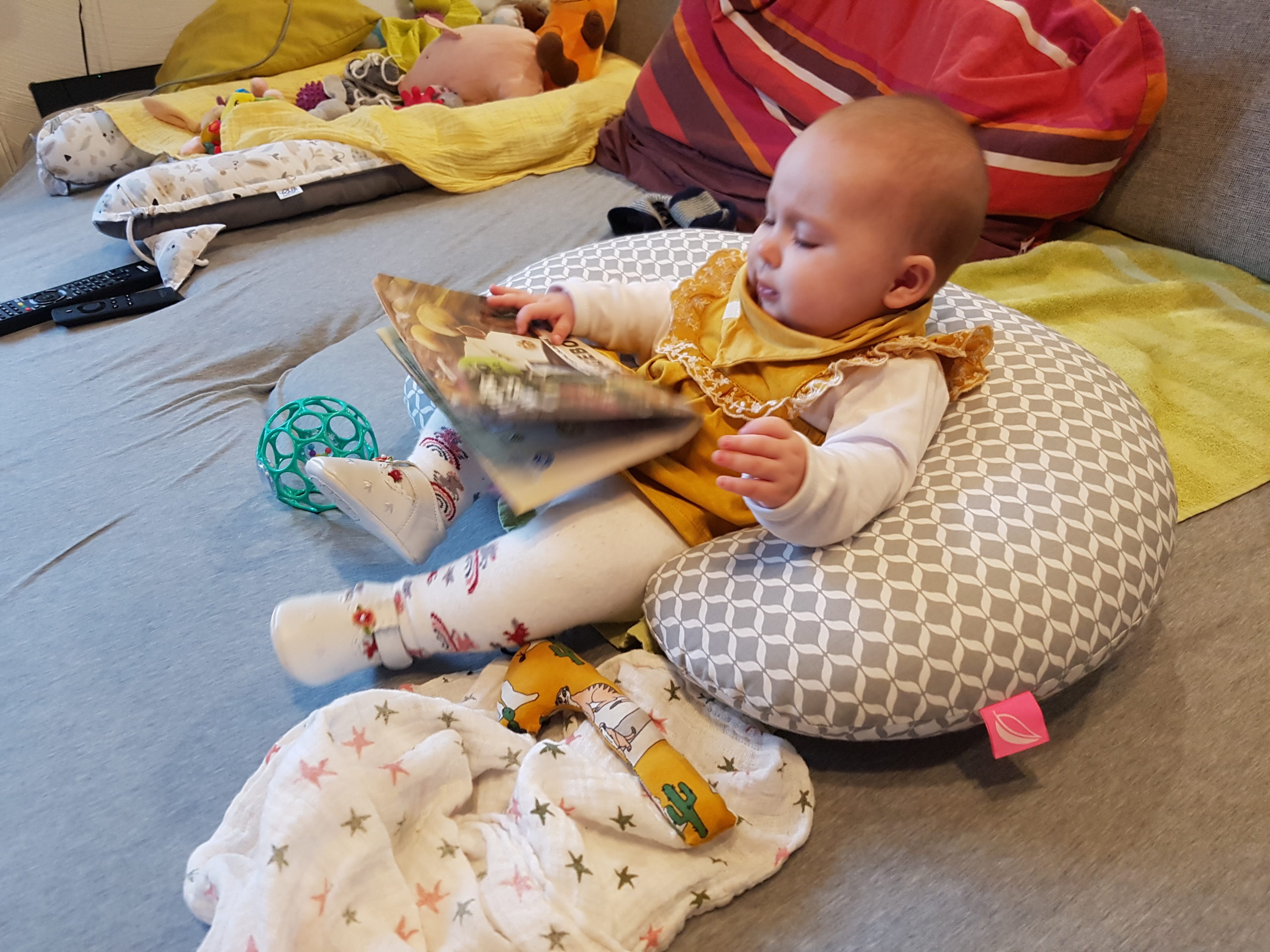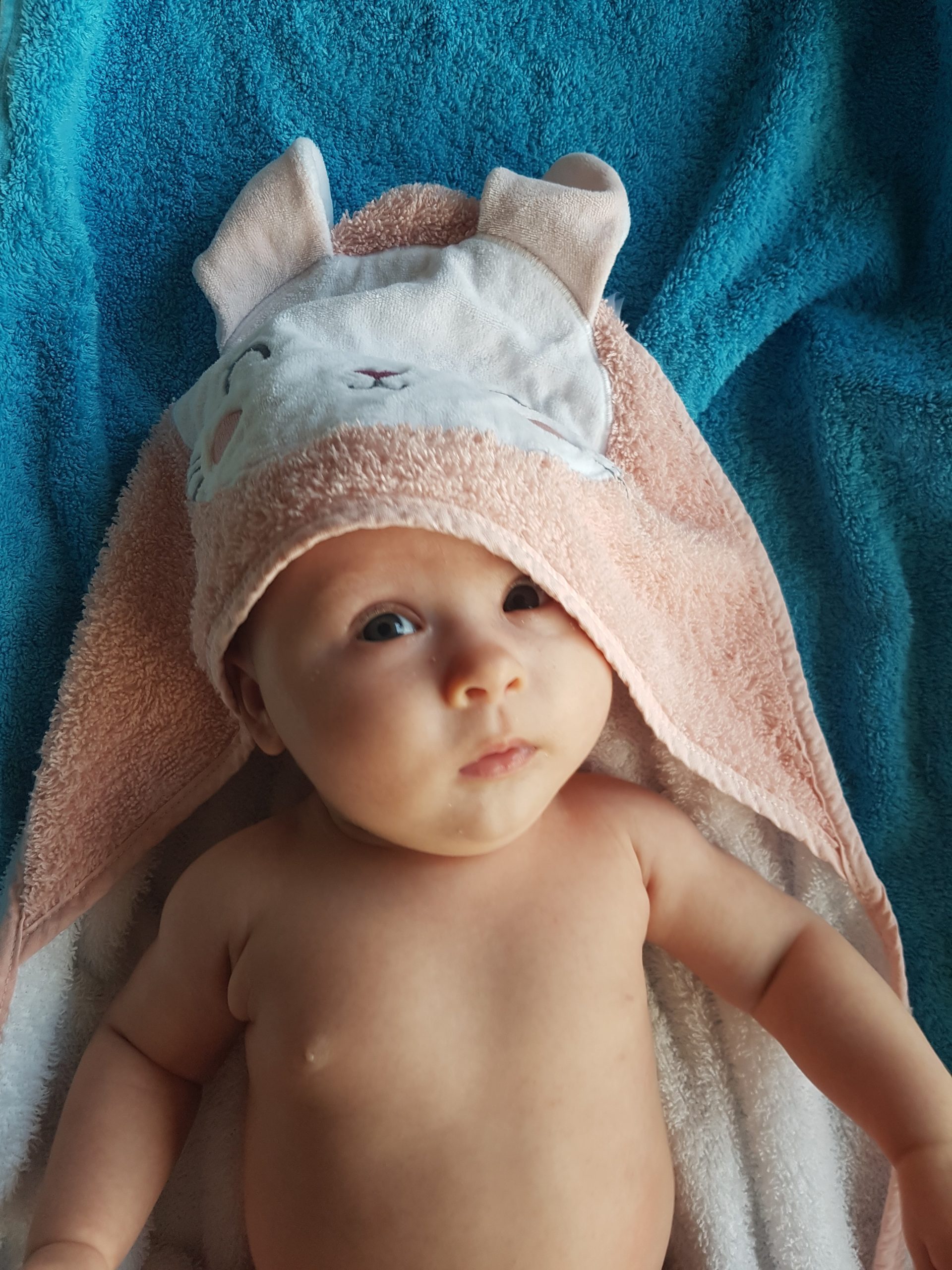 Ich bin jetzt knapp 65 cm groß und wiege 7250 g. Am liebsten mache ich derzeit Spuckebläschen und rudere mit den Armen. Außerdem übe ich weiterhin fleißig das Drehen und Aufsetzen. Liegen ist schließlich nur was für Babies…