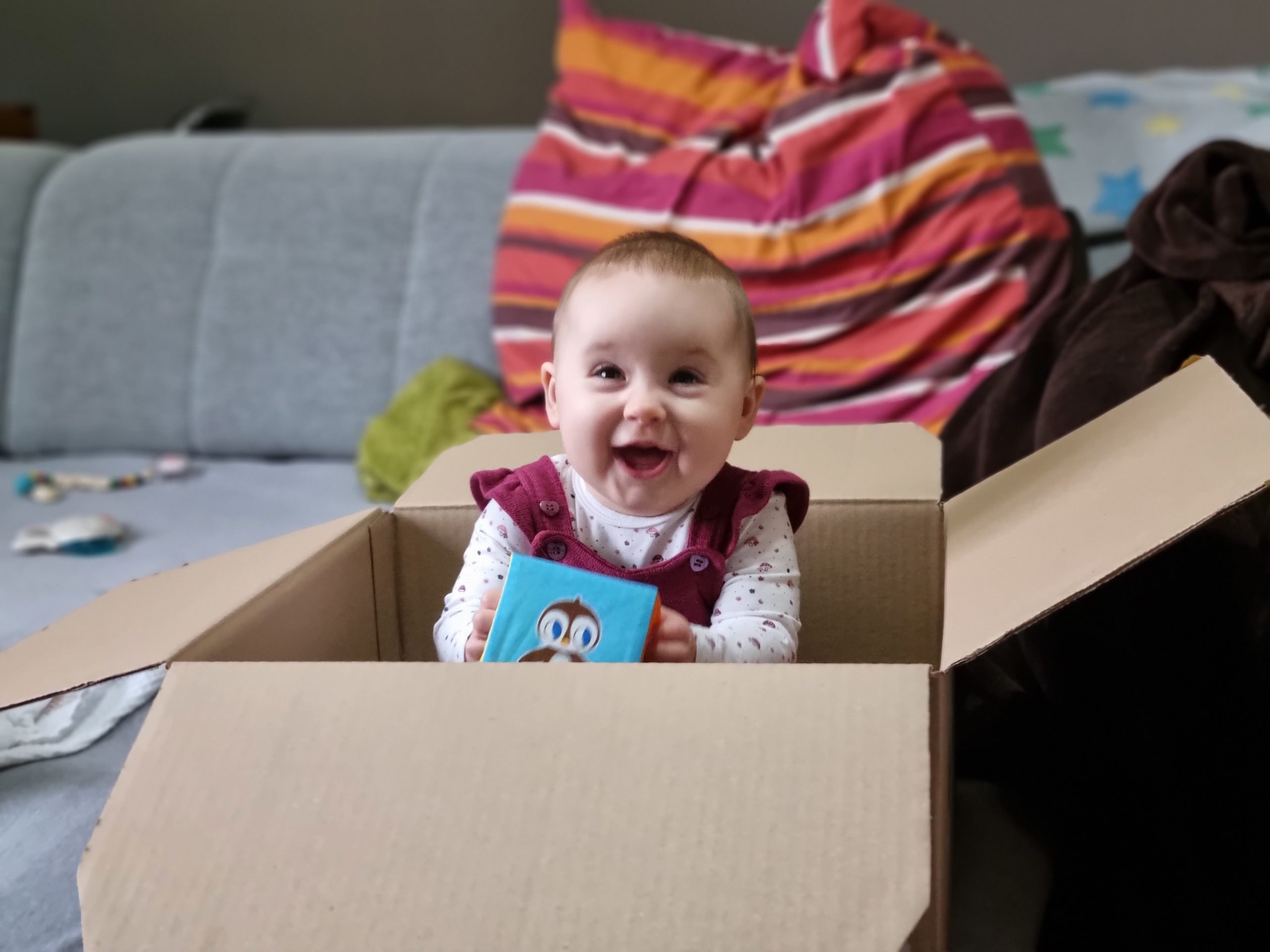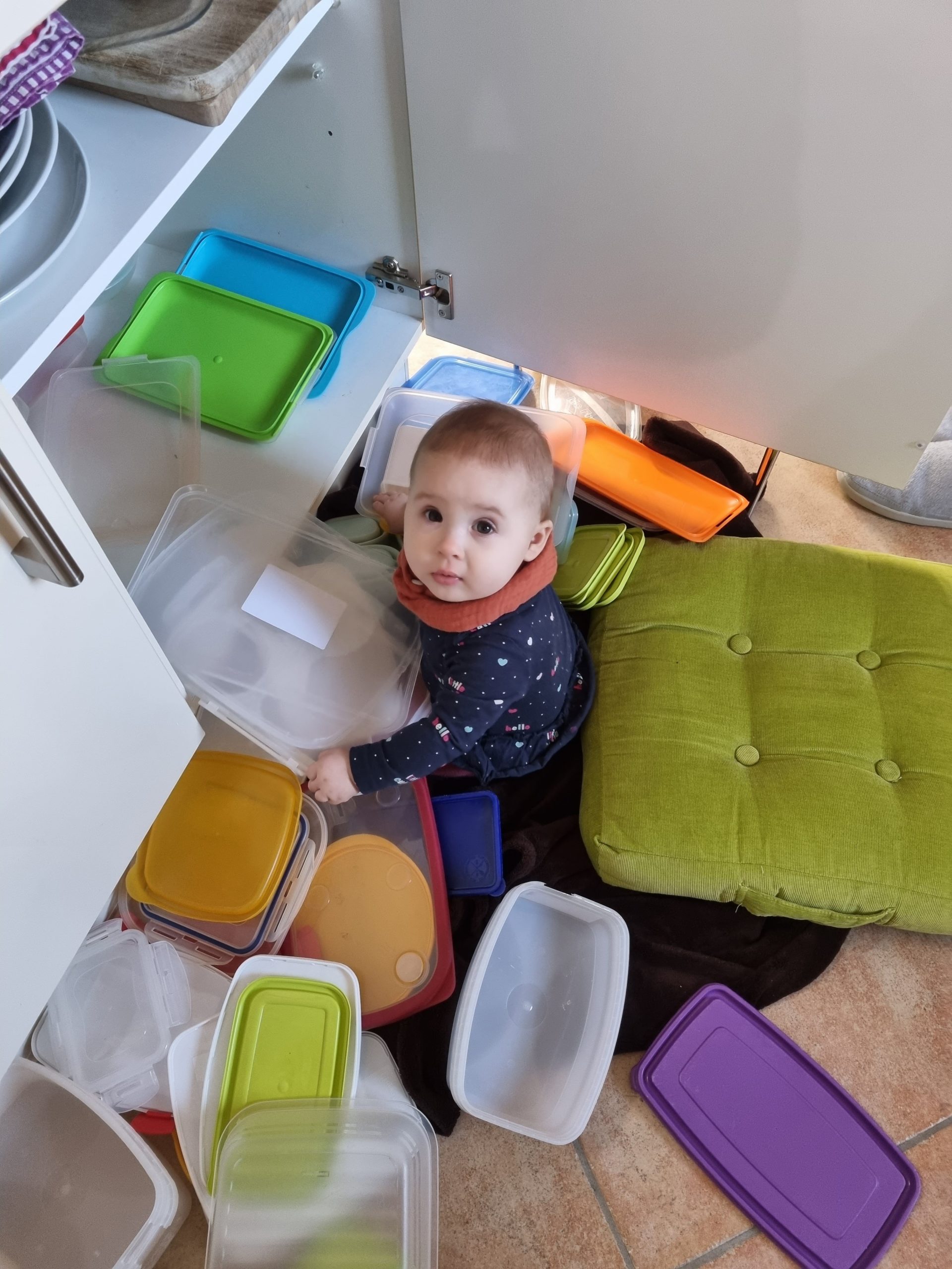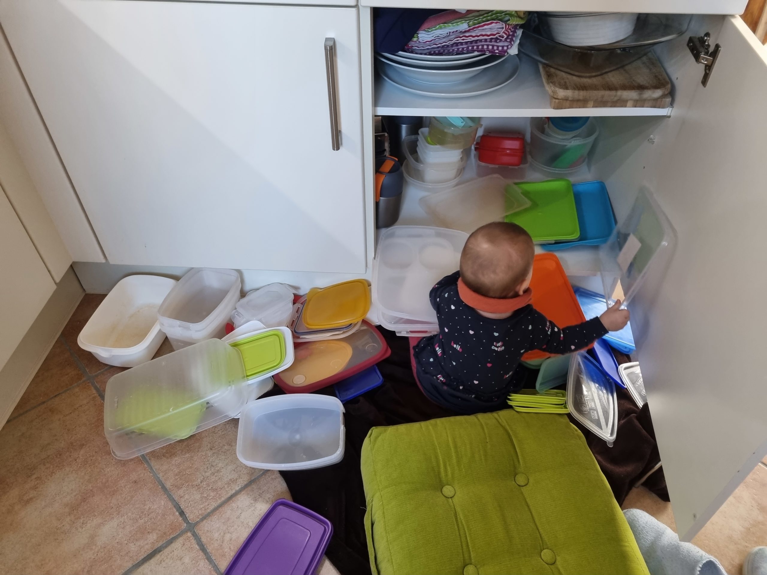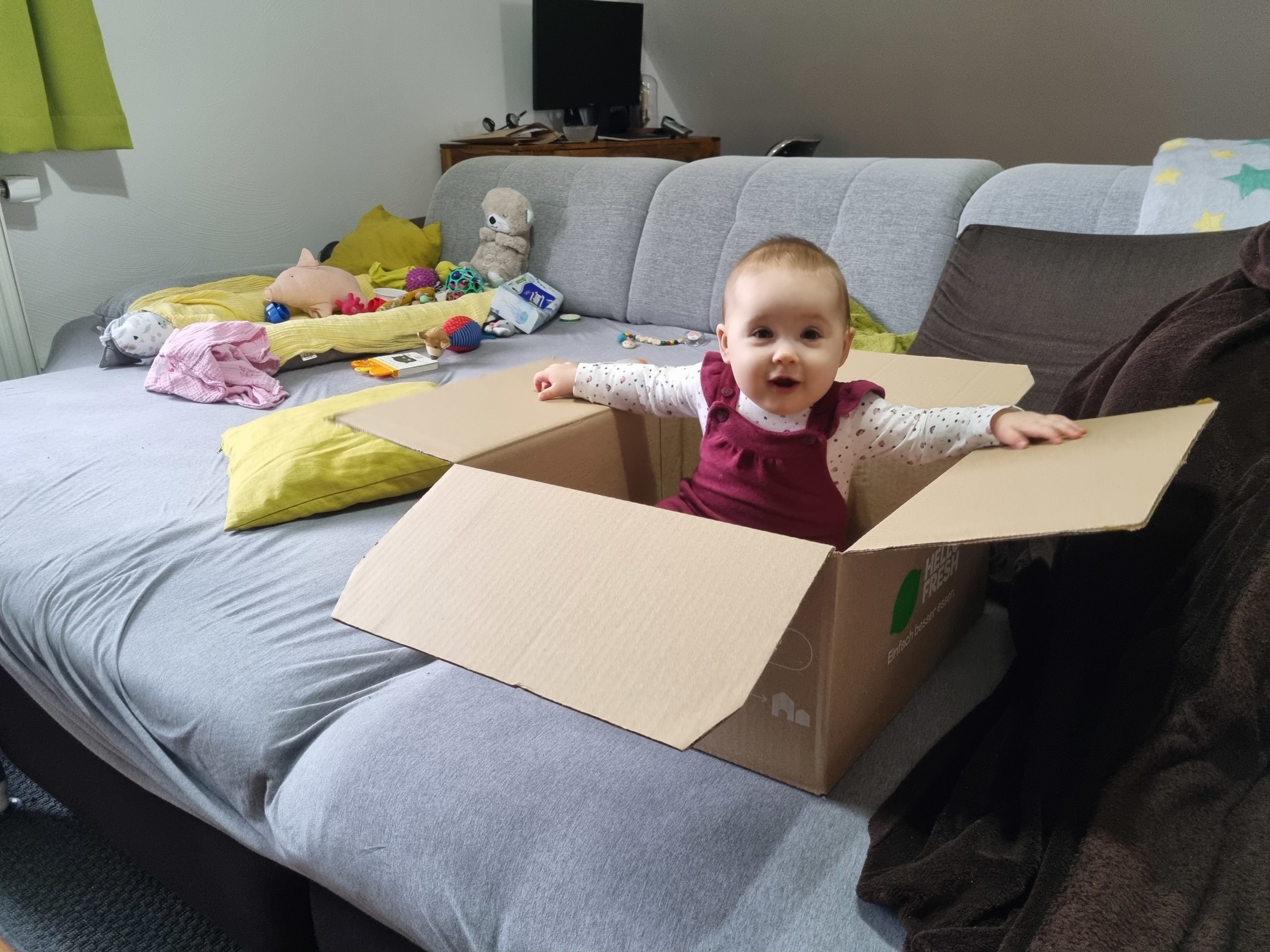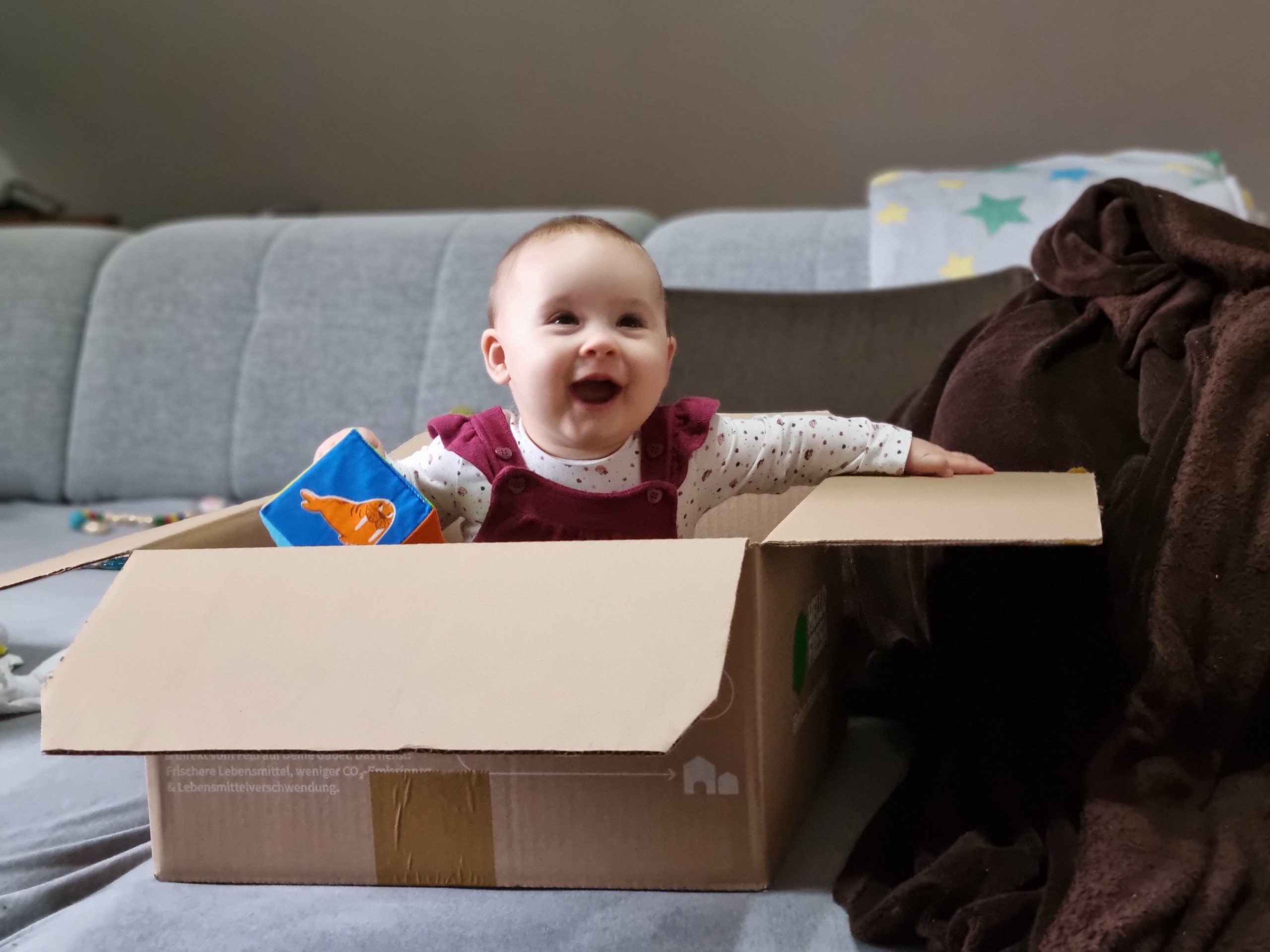 Aufsetzen kann ich mich inzwischen alleine, in den Vierfüßlerstand komme ich auch schon ohne Weiteres und es fehlt auch gar nicht mehr viel zum Robben. Dann geht es richtig ab!
